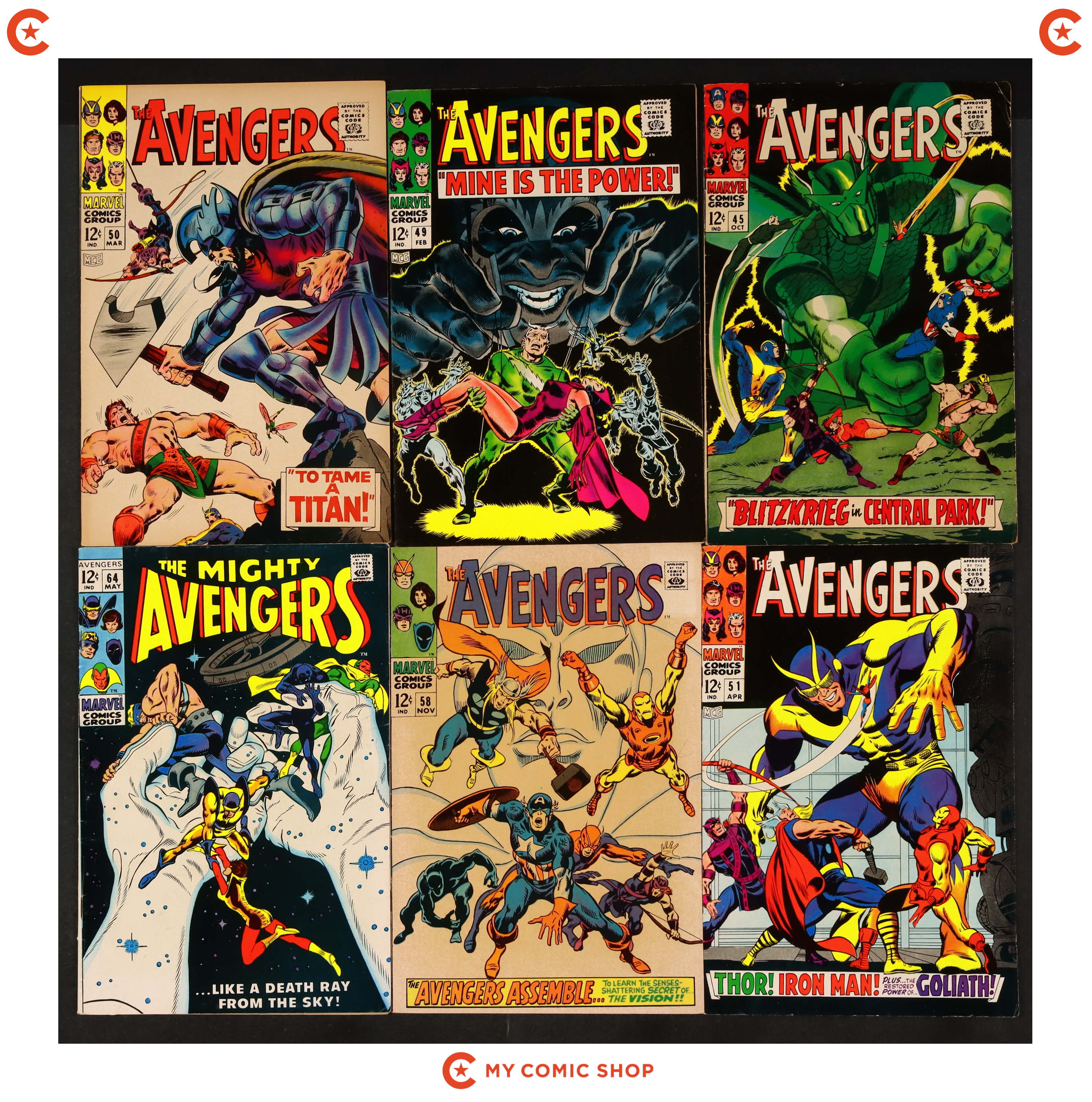 Issues 45, 49, 50, 51, 58, 64 of Avengers (1963 1st Series). Most will grade in the GD/VG to FN range.