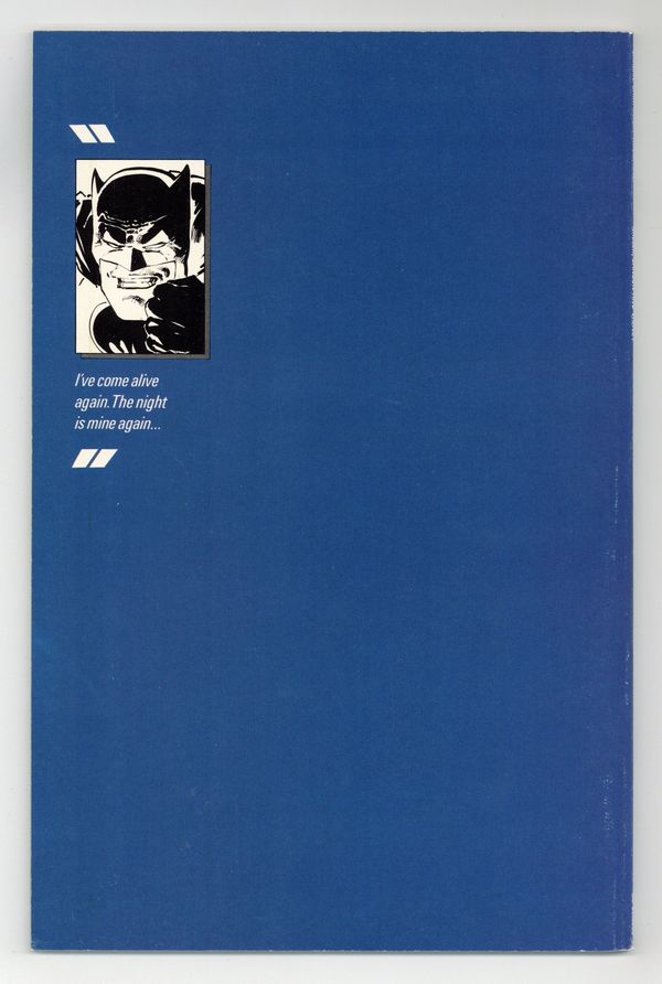 Starts May 18 First printing. Newsstand Edition. NOTE: 1st printing has almost matching grey background on inside front cover and facing page. 2nd printing doesn't have matching gray background--grays are very different. 3rd printings are labeled as such. Cover by Frank Miller. "Dark Knight Triumphant," script by Frank Miller, pencils by Frank Miller, inks by Klaus Janson; an aging Batman battles the Mutant gang and their anonymous leader; While walking to work, considering retirement, Jim Gordon is almost killed by a 17-year old boy with an M60; Carrie Kelly, a young girl who owes her life to Batman, seeks out her hero and becomes Robin. 52 pgs., full color. Cover price $2.95.