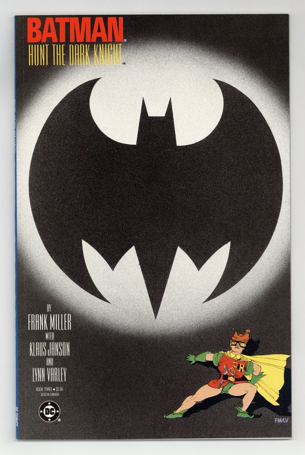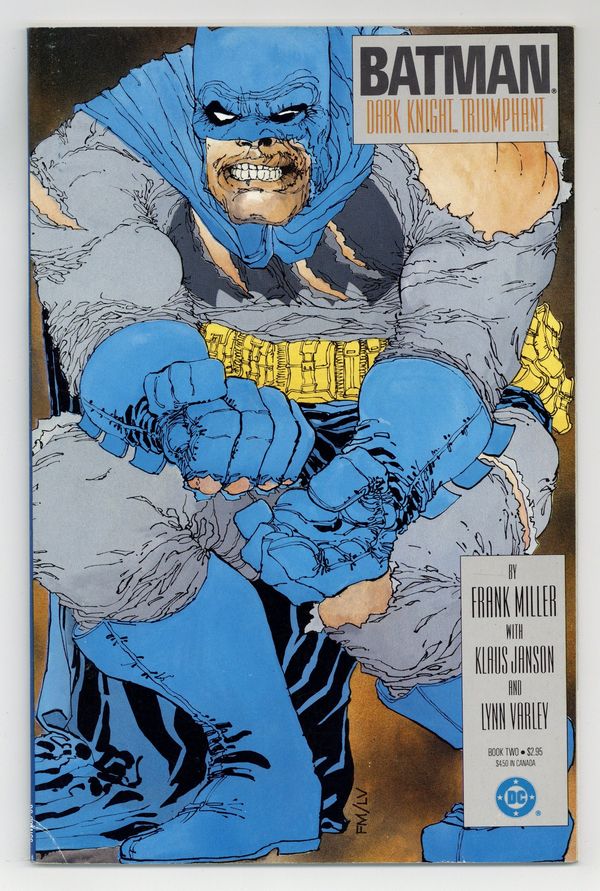 Starts May 18 First printing. Direct Edition. NOTE: 1st printing has almost matching grey background on inside front cover and facing page. 2nd printing doesn't have matching gray background--grays are very different. 3rd printings are labeled as such. Cover by Frank Miller. "Dark Knight Triumphant," script by Frank Miller, pencils by Frank Miller, inks by Klaus Janson; an aging Batman battles the Mutant gang and their anonymous leader; While walking to work, considering retirement, Jim Gordon is almost killed by a 17-year old boy with an M60; Carrie Kelly, a young girl who owes her life to Batman, seeks out her hero and becomes Robin. 52 pgs., full color. Cover price $2.95.