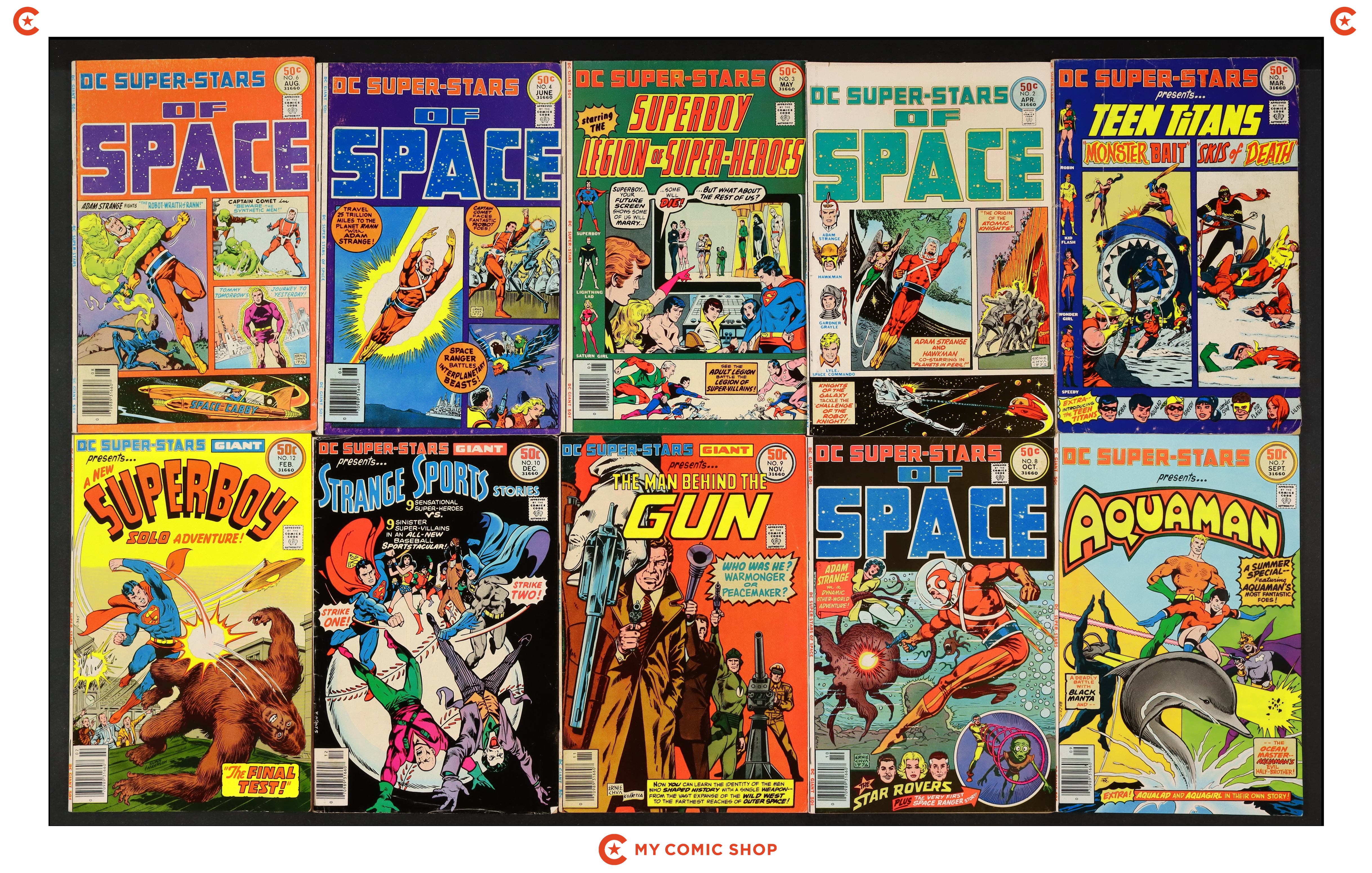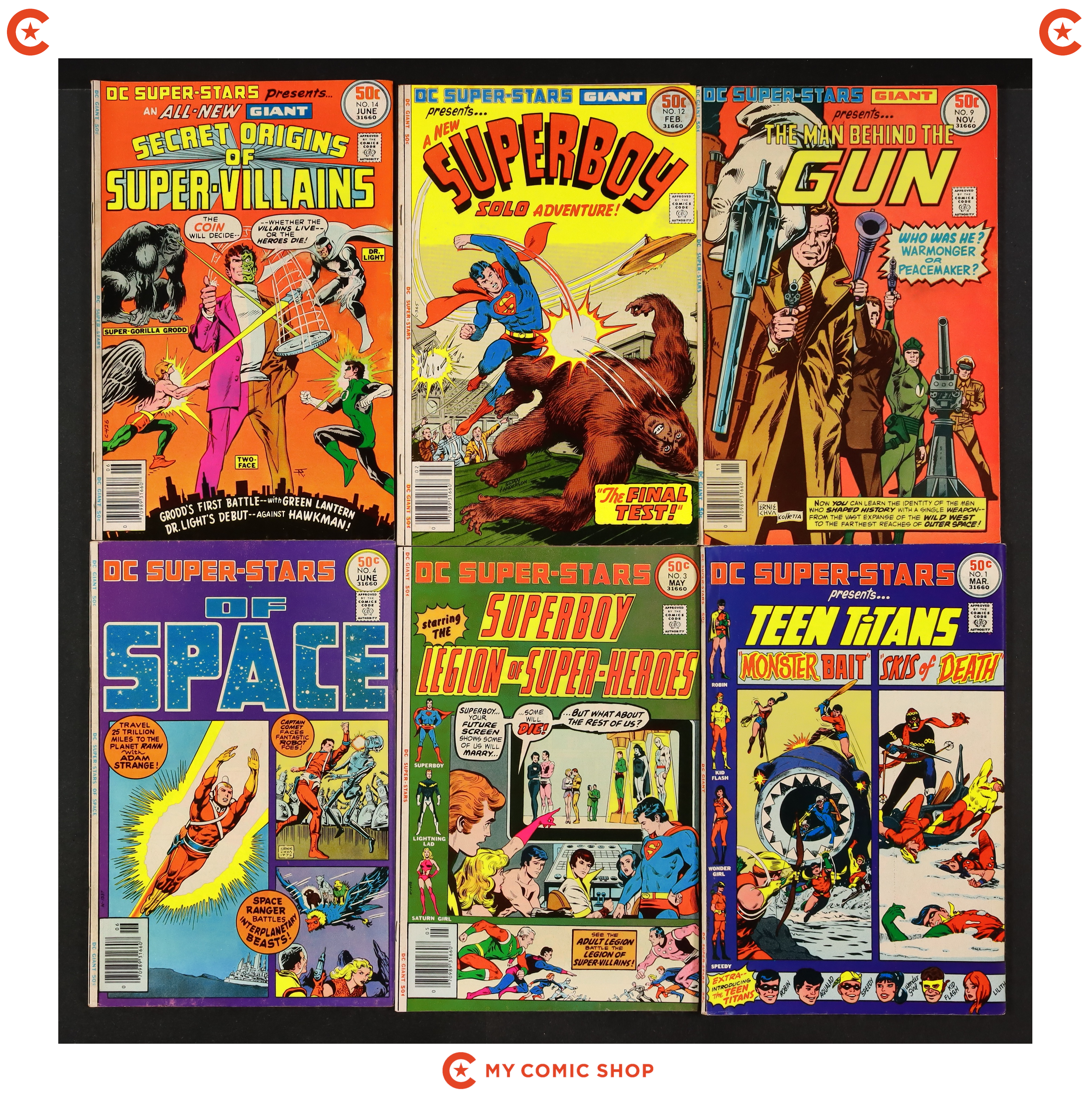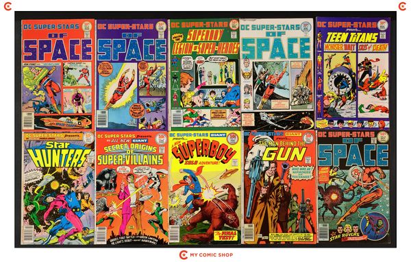 Issues 1-4, 6, 8, 9, 12, 14, and 16 of DC Super Stars (1976). Most will grade in the FN to VG range.