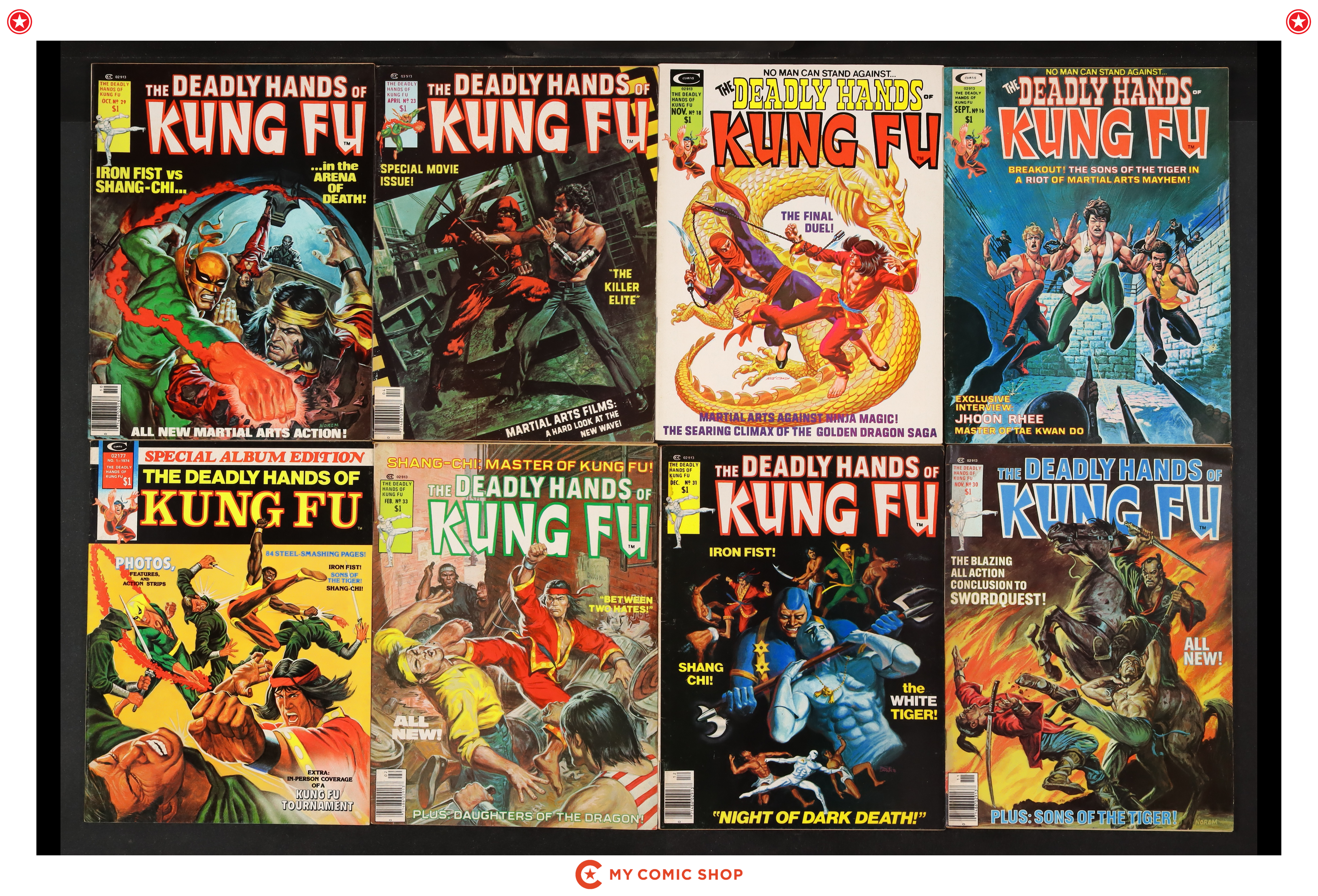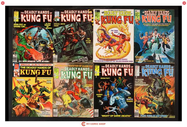 Issues 16, 18, 23, 29-31, and 33 of Deadly Hands of Kung Fu (1974 Magazine); and 1 of Deadly Hands of Kung Fu Special Album Edition (1974). Most will grade in the FN range with some grading VG.
