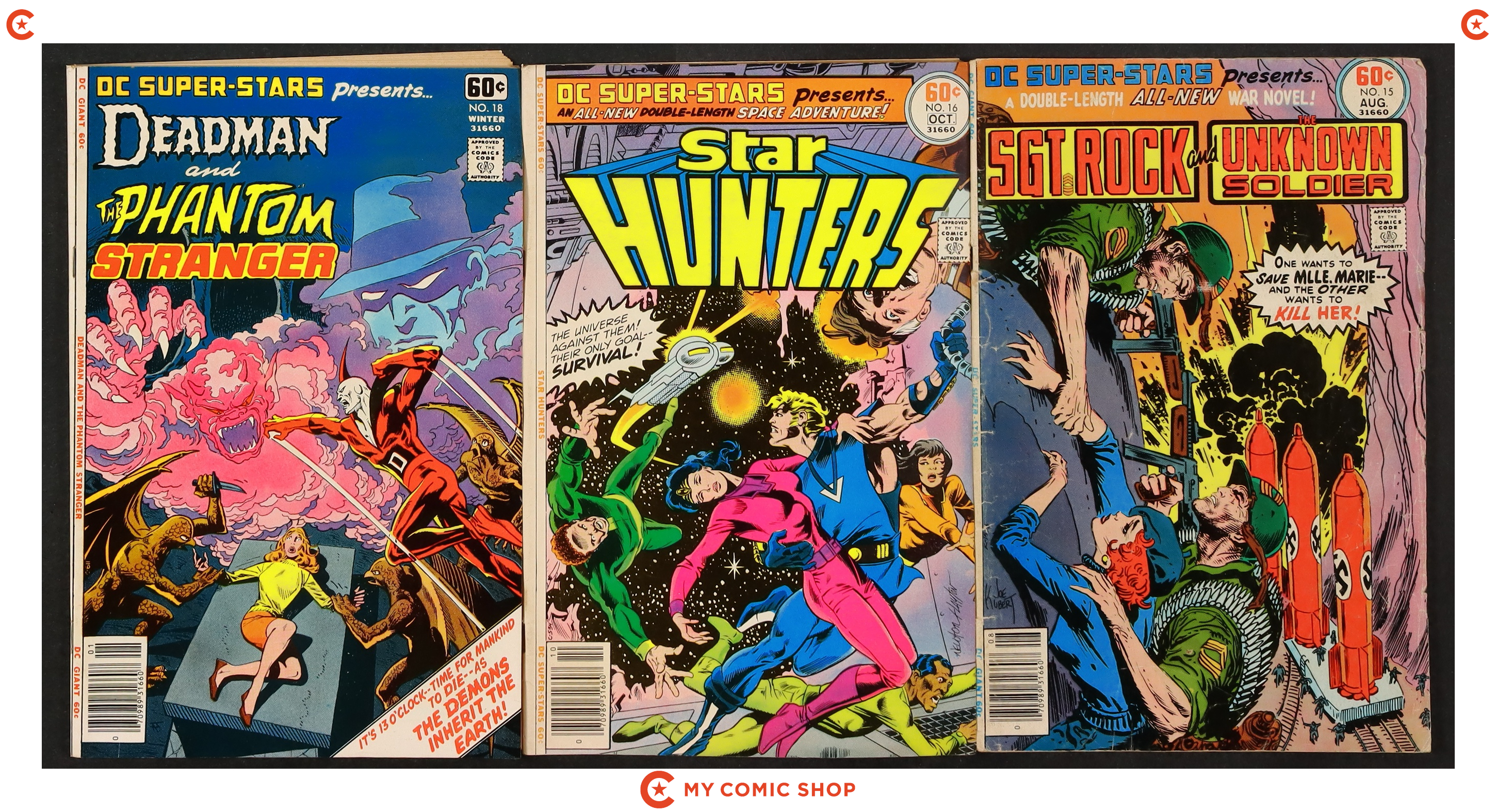 Issues 1, 3, 4, 9, 12, 14-16, and 18 of DC Super Stars (1976). Most will grade in the FN range with a few grading VG.