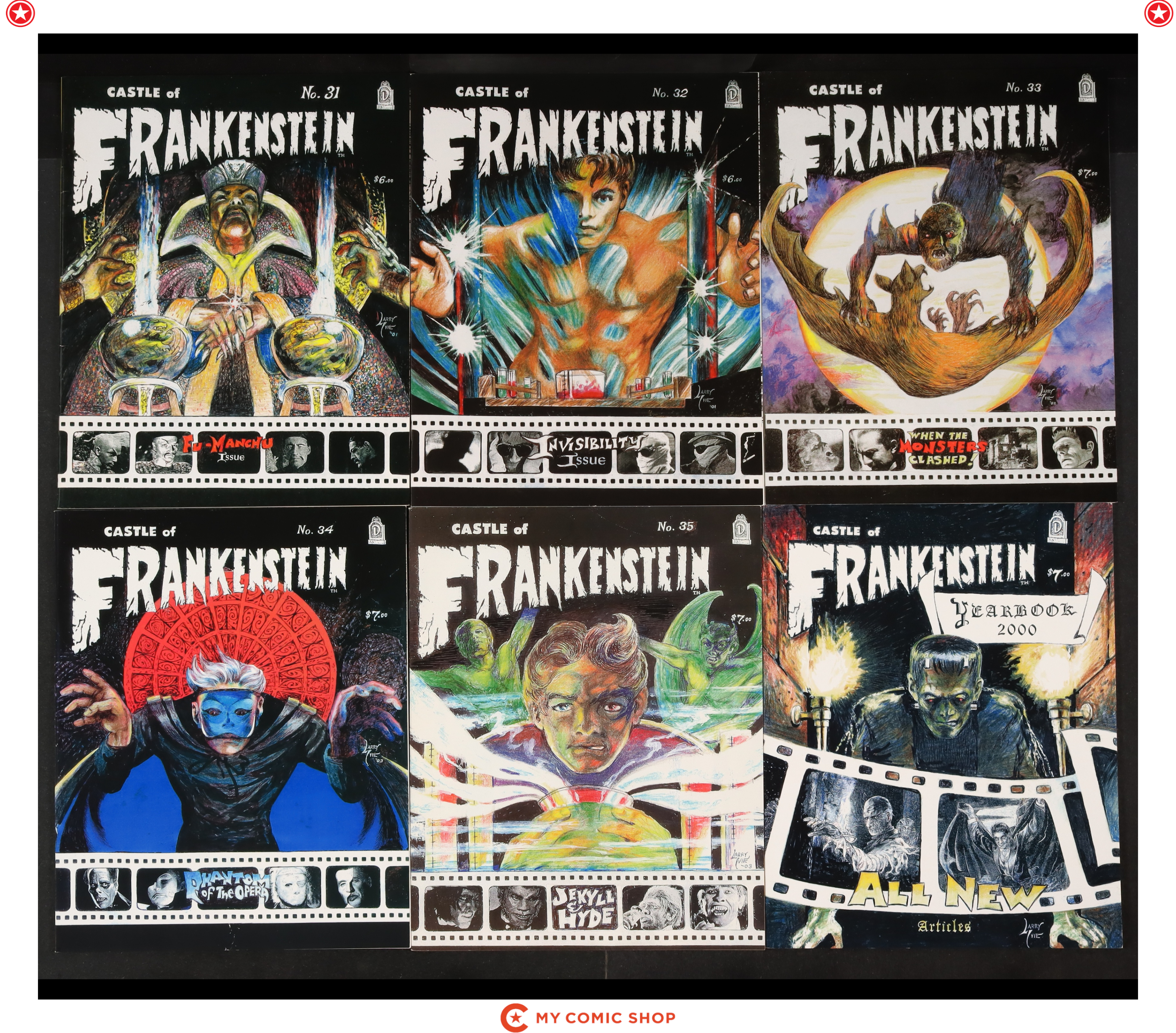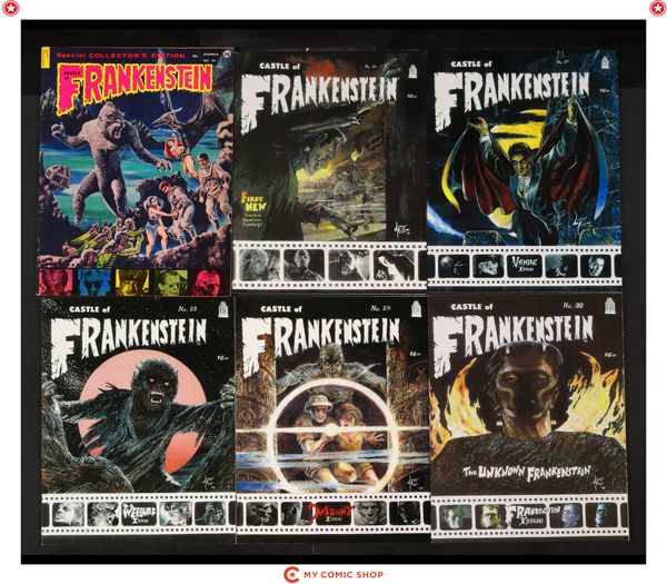 Issues 20, 26, 27, 28, 29, 30, 31, 32, 33, 34, 35 of Castle of Frankenstein (1962-1975 Gothic Castle Publishing); and Castle of Frankenstein Yearbook (2000) 2000. Most will grade in the VG/FN to FN/VF range.