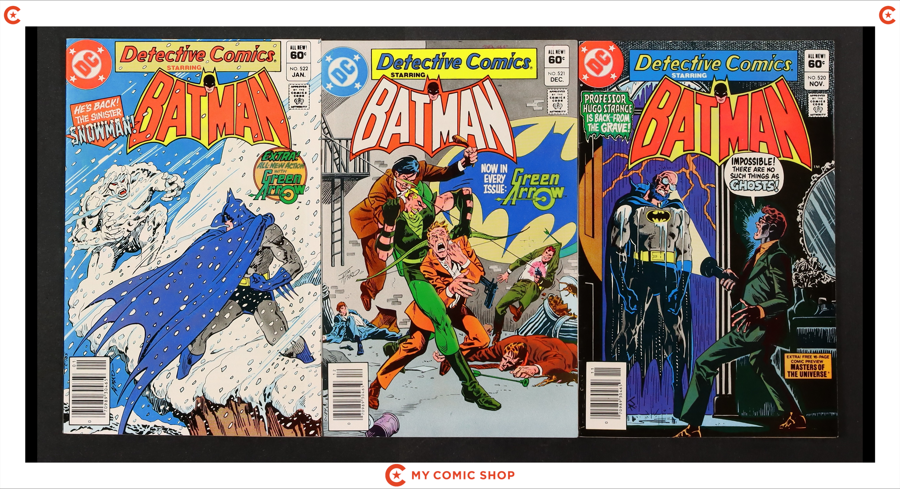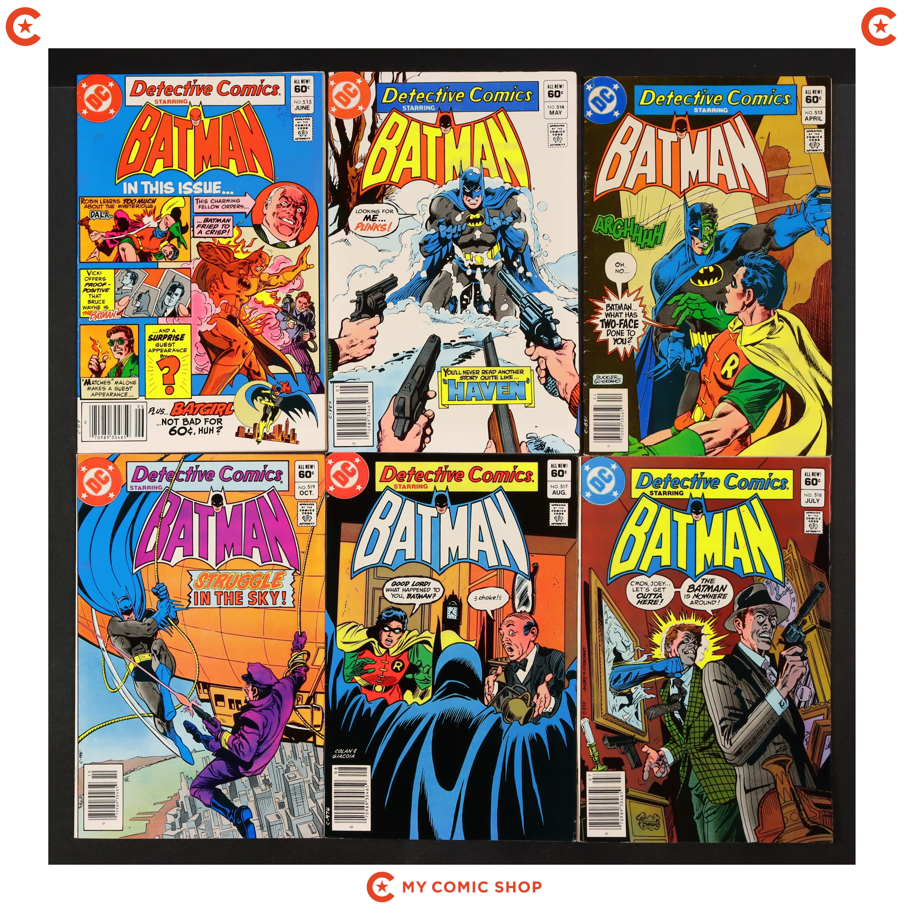 Issues 513N, 514N, 515, 516, 517, 519, 520, 521, and 522 of Detective Comics (1937 1st Series). Most will grade in the FN+ to VG/FN range.