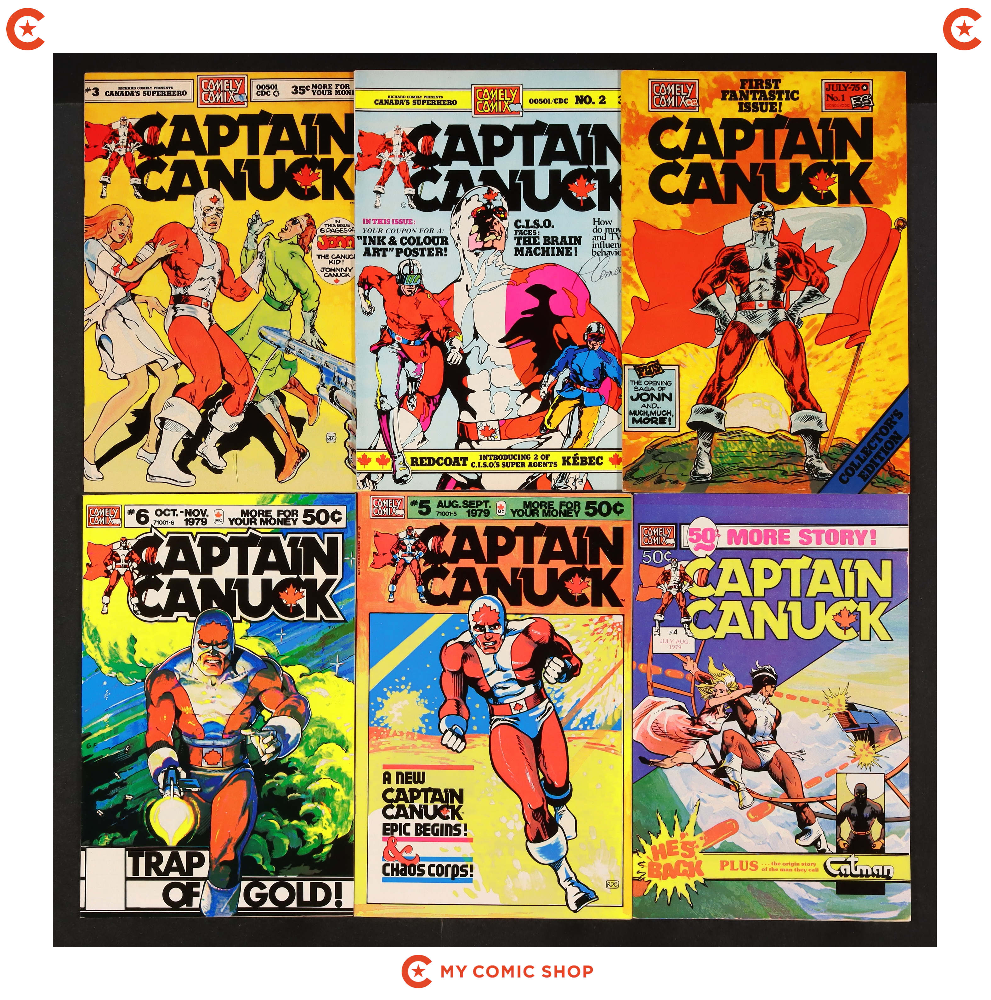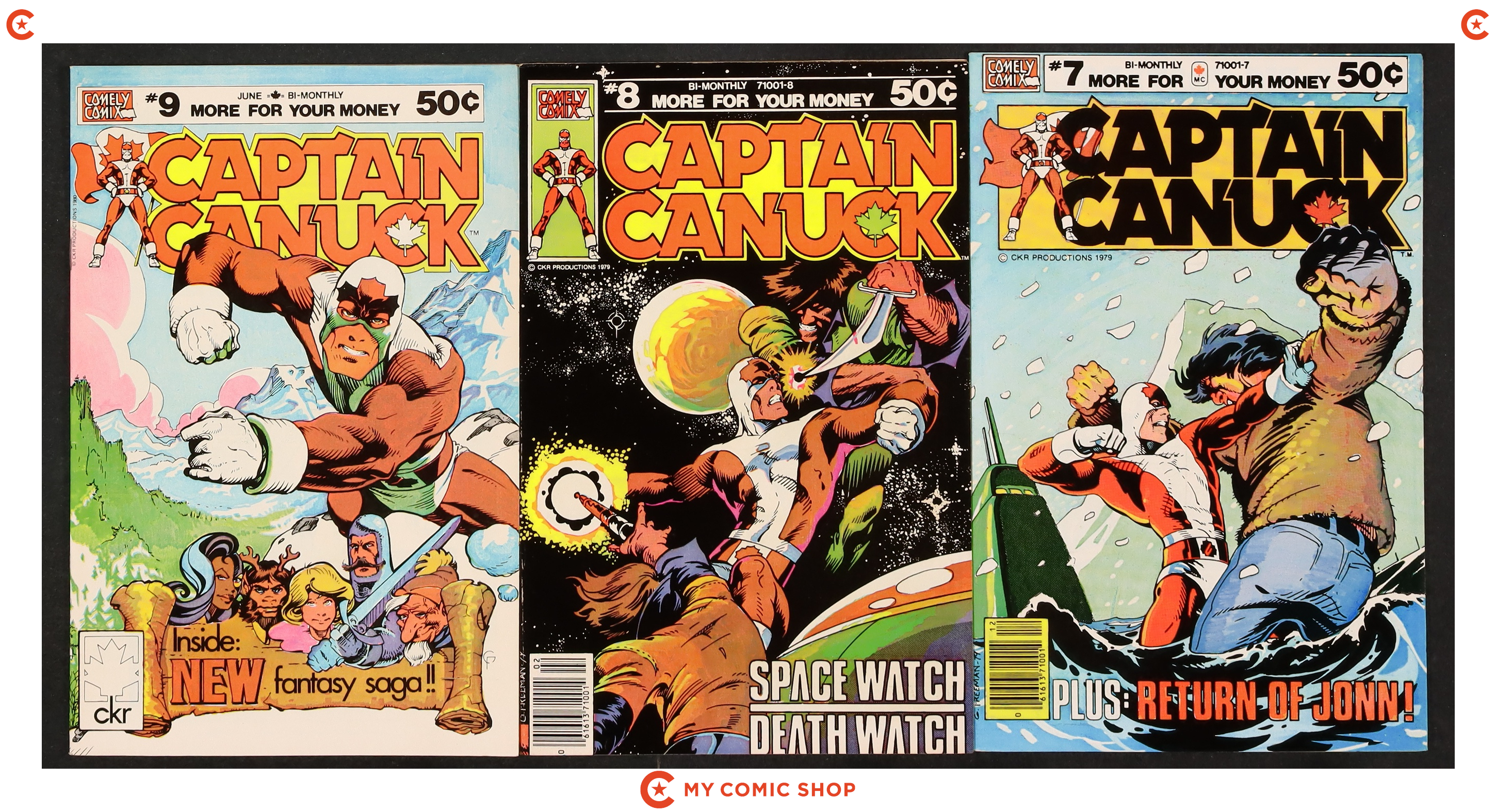 Issues 1, 2, 3, 4, 5, 6, 7, 8, 9 of Captain Canuck (1975 Comely Comix). Issues #2 signed by , no certification is included. Most will grade in the FN to VF range.