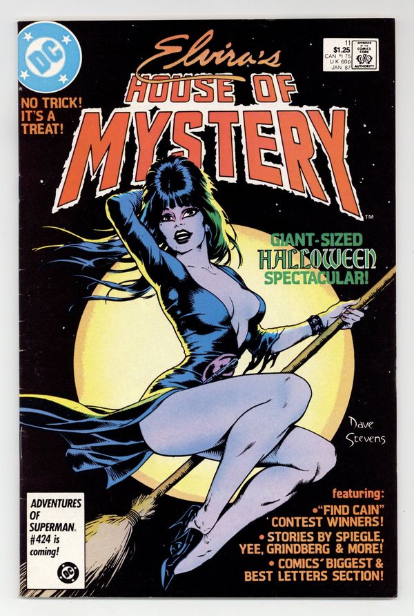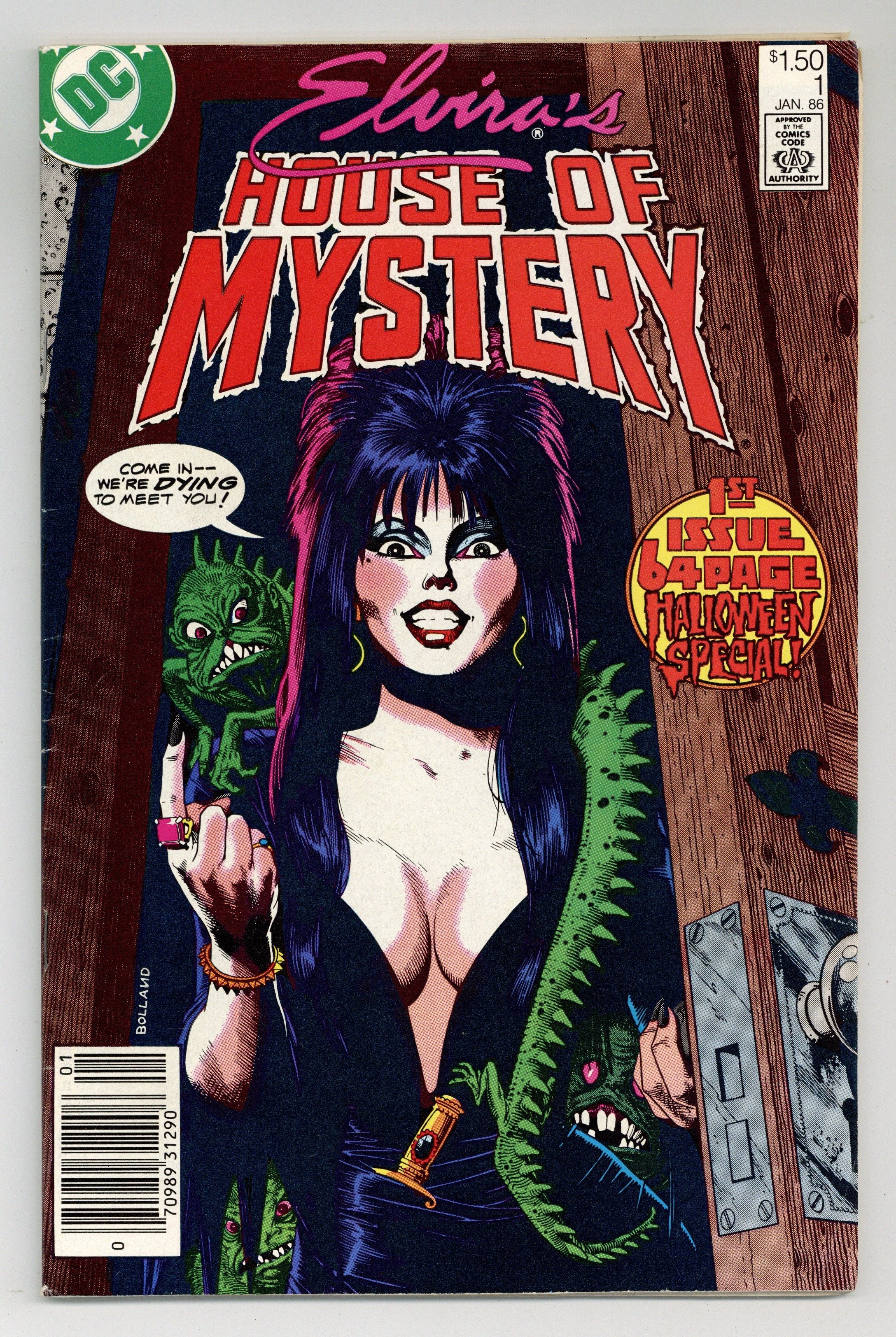 Starts Mar 16 Newsstand Edition. 64-page Halloween Special. Cover art by Brian Bolland. Elvira inside front cover illustration by David Goldner. "Elvira's Quest," script by Joey Cavalieri, pencils by Ron Wagner, inks by Bob Oksner; The House of Mystery sends Elvira on a quest to find Cain. "The Realm," script by Philip Clarke, Jr., pencils by Tom Grindberg, inks by Irwin Hasen. "Death Likes a Lullaby," script by Robert Kanigher, art by Arthur Geroche. "Once Upon a Time," script by Dennis Yee, pencils by Dennis Yee, inks by Jim Fern, Dan Adkins, and Tex Blaisdell. "Vengeance in the Creature Feature!", script by Jack C. Harris, art by Dan Spiegle. "The Witch's Cauldron," script and art by Ma's Fay; A witch conjures up demons and a little boy conjures up Superman and Batman. Back cover and inside back cover photographs of Elvira. 68 pgs., full color. Cover price $1.50.