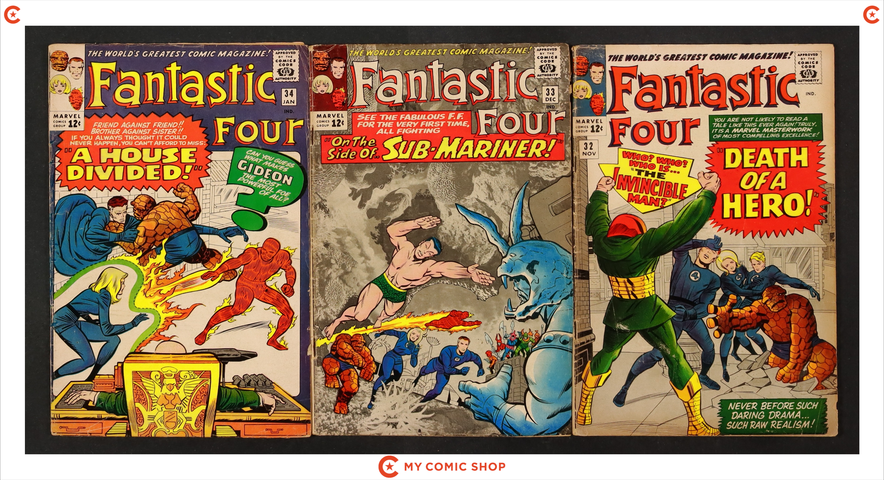 Issues 32, 33, 34 of Fantastic Four (1961 1st Series). Most will grade in the GD range, with #33 grading at PR (INCOMPLETE. Missing ad page).