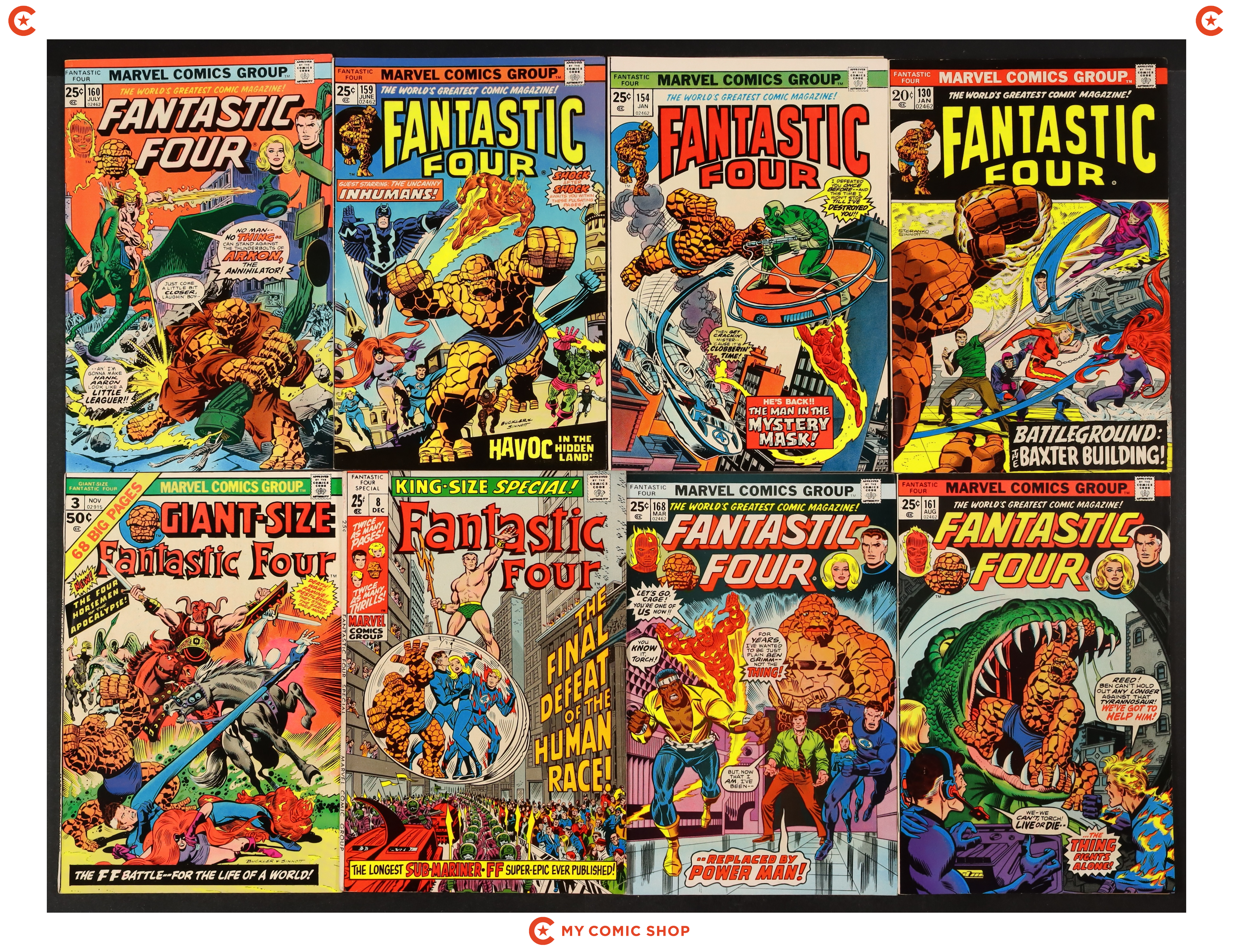 Issues 130, 154, 159, 160, 161, 168 of Fantastic Four (1961 1st Series), issue 8 of Fantastic Four (1961 1st Series) Annual, and issue 3 of Giant Size Fantastic Four (1974). Most will grade in the FN/VF to VG/FN range.