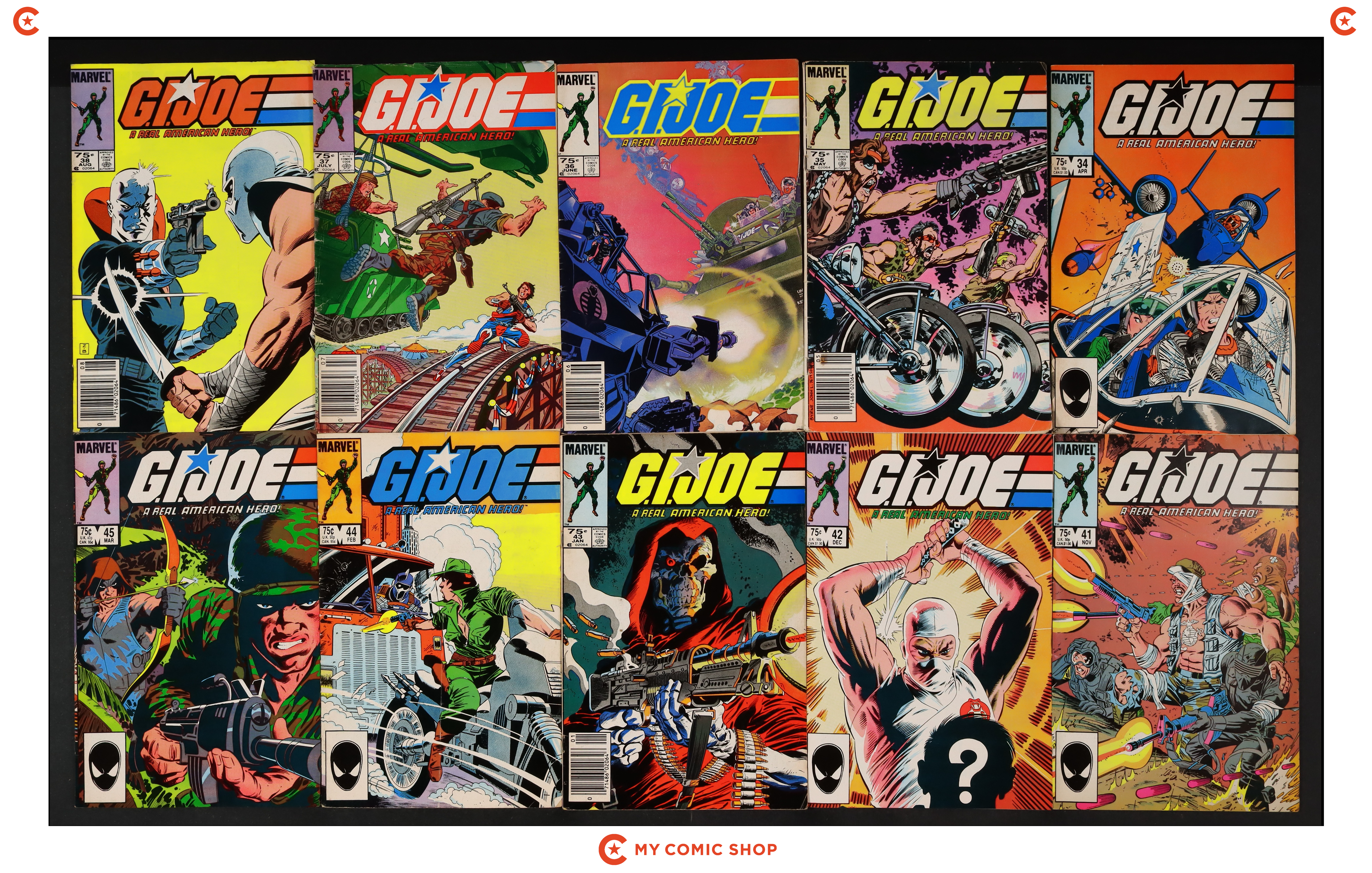 Issues 34, 35, 36N, 37, 38, 41-43, 44D, 45 of GI Joe A Real American Hero (1982 Marvel). Most will grade in the GD/VG to FN+ range, with 44 grading at FR.