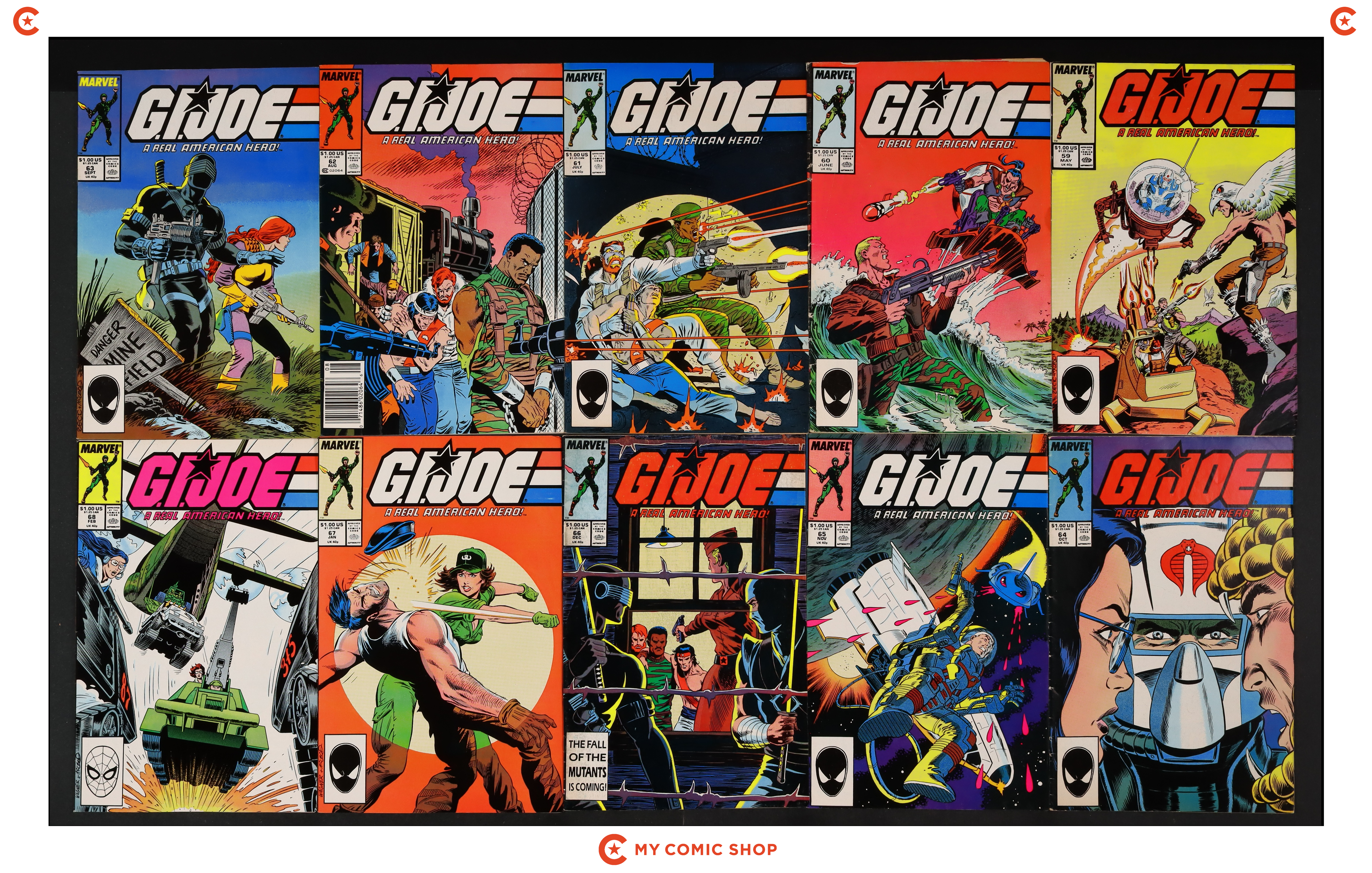 Issues 56N, 57, 58, 59D, 60-65 of GI Joe A Real American Hero (1982 Marvel). Most will grade in the VG/FN range, with 58-60 grading at FR/GD.