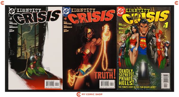 Issues 1A, 4A, 5A of Identity Crisis (2004) signed by Michael Turner. No autograph certification is included. Most will grade in the FN to VF range.
