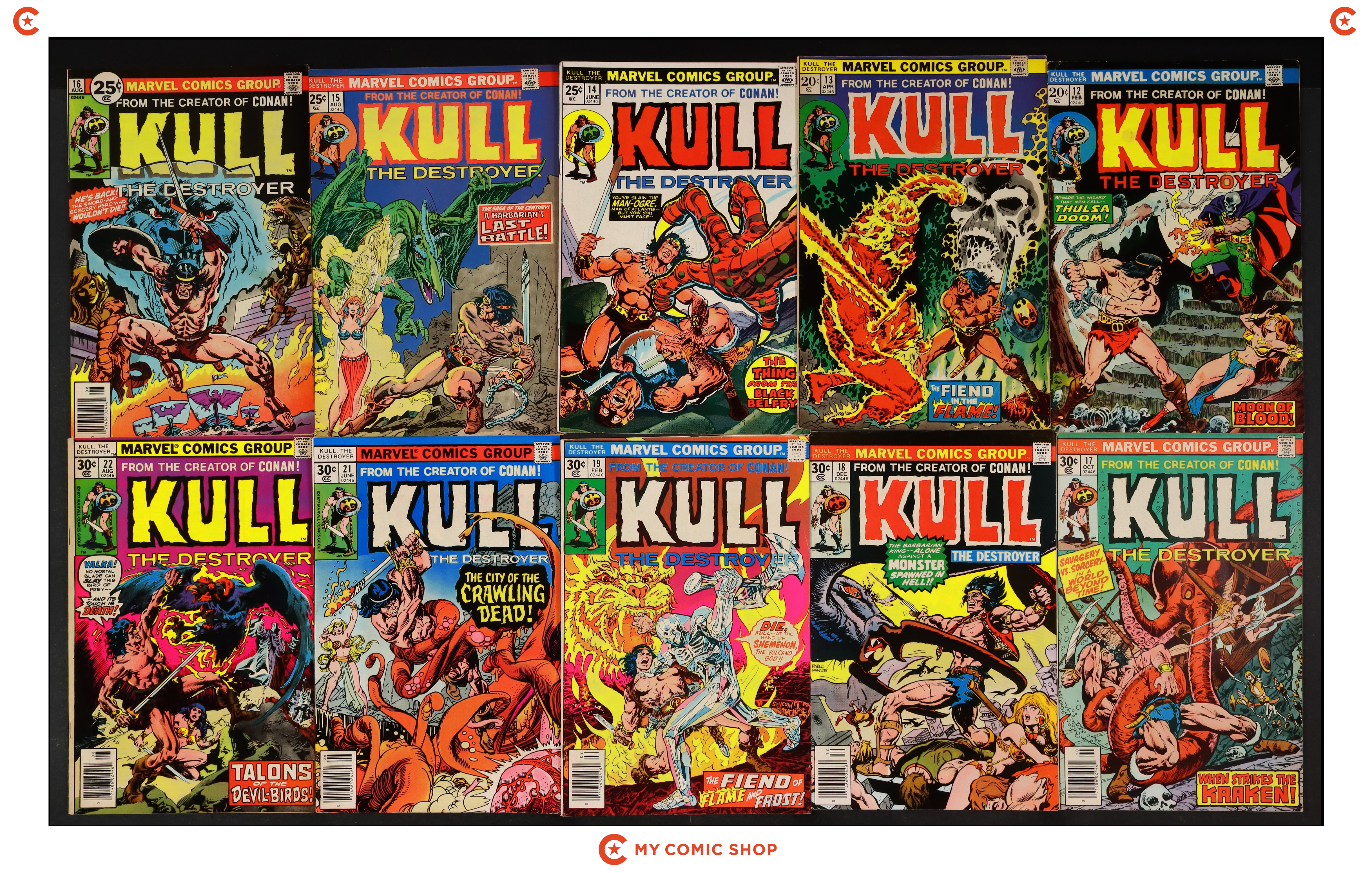 Issues 19, and 21-29 of Kull the Conqueror (1971 1st Series). Most will grade in the VG to FN range with 23- 26 grading GD.