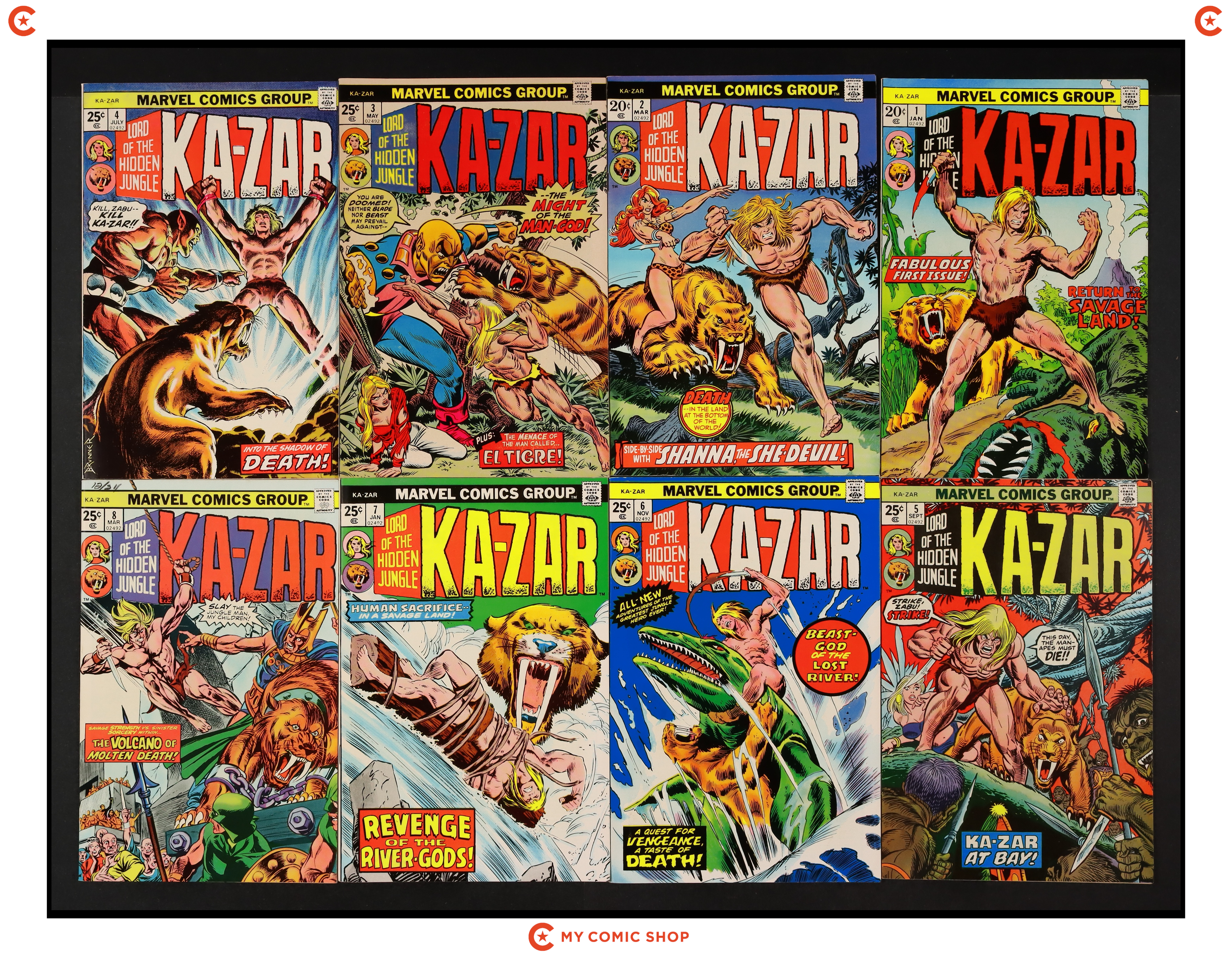 Issues 1-8 of Ka-Zar (1974 2nd Series). Most will grade in the FN to VF range.