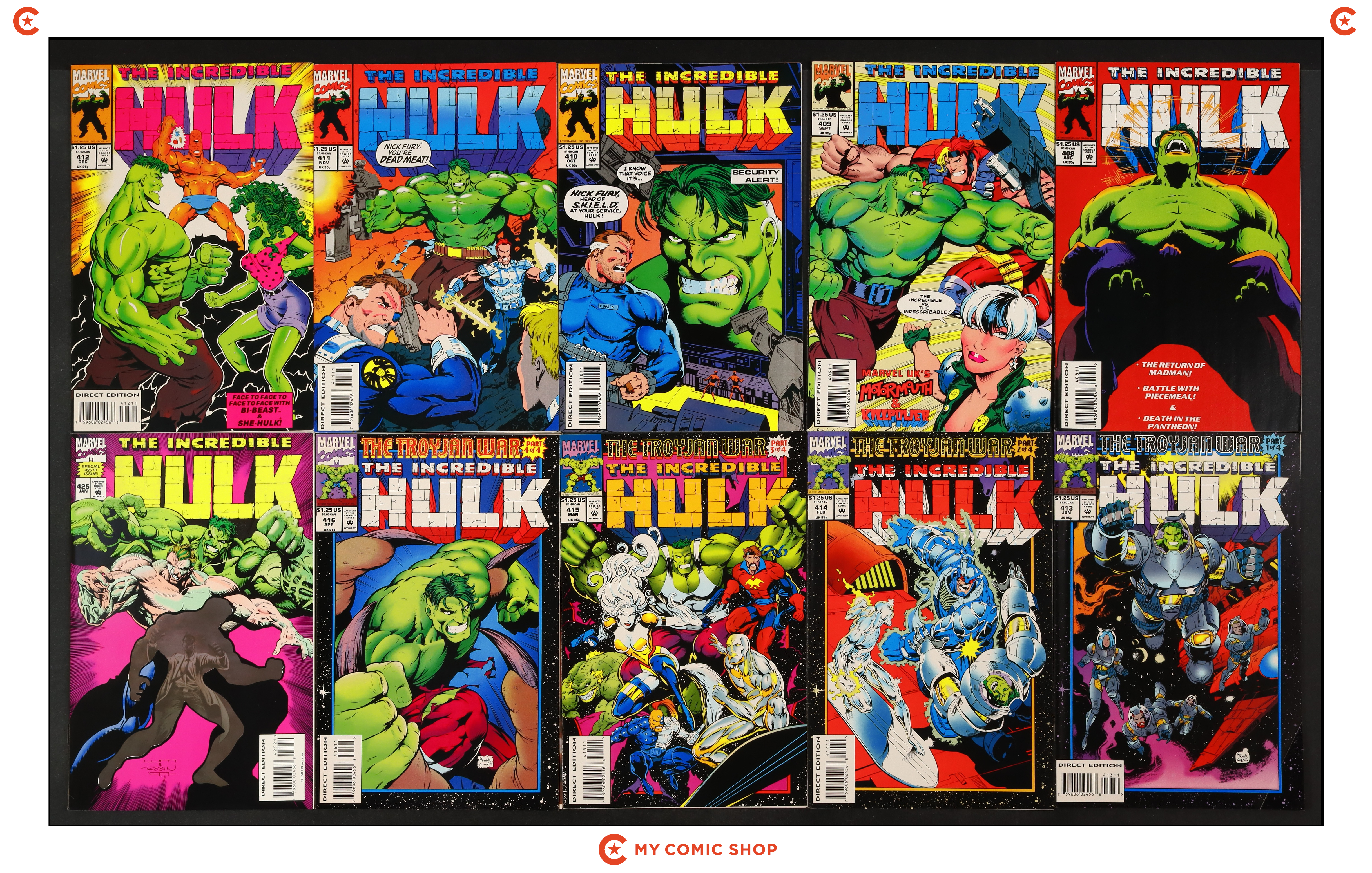 Issues 398-416, and 425A of Incredible Hulk (1962 Marvel 1st Series). Most will grade in the NM to VF/NM range with a few grading FN.