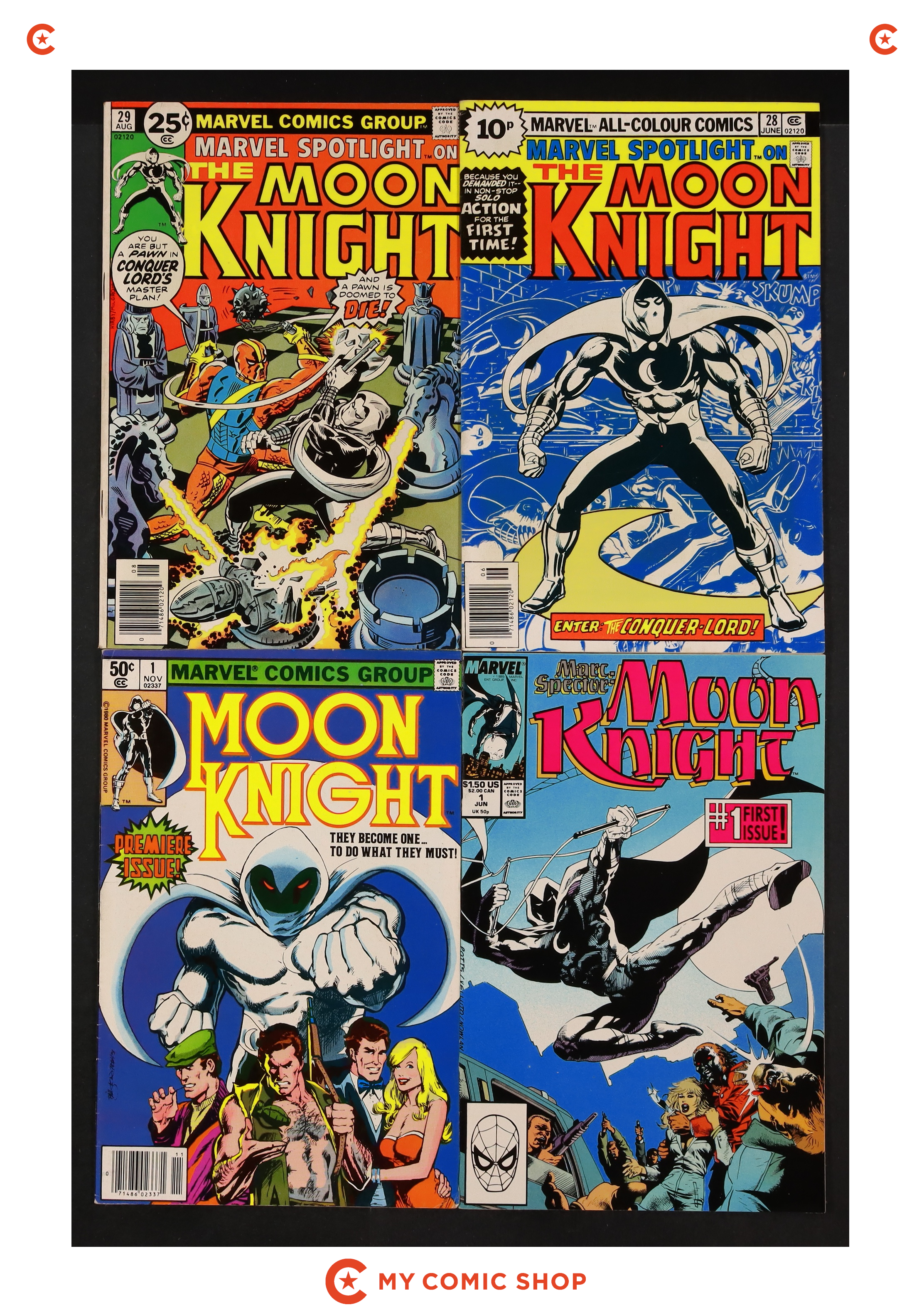 Issue 28UK, 29 of Marvel Spotlight (1971 1st Series), issue 1 of Marc Spector Moon Knight (1989), issue 1N of Moon Knight (1980 1st Series). Most will grade in the VG to FN range.