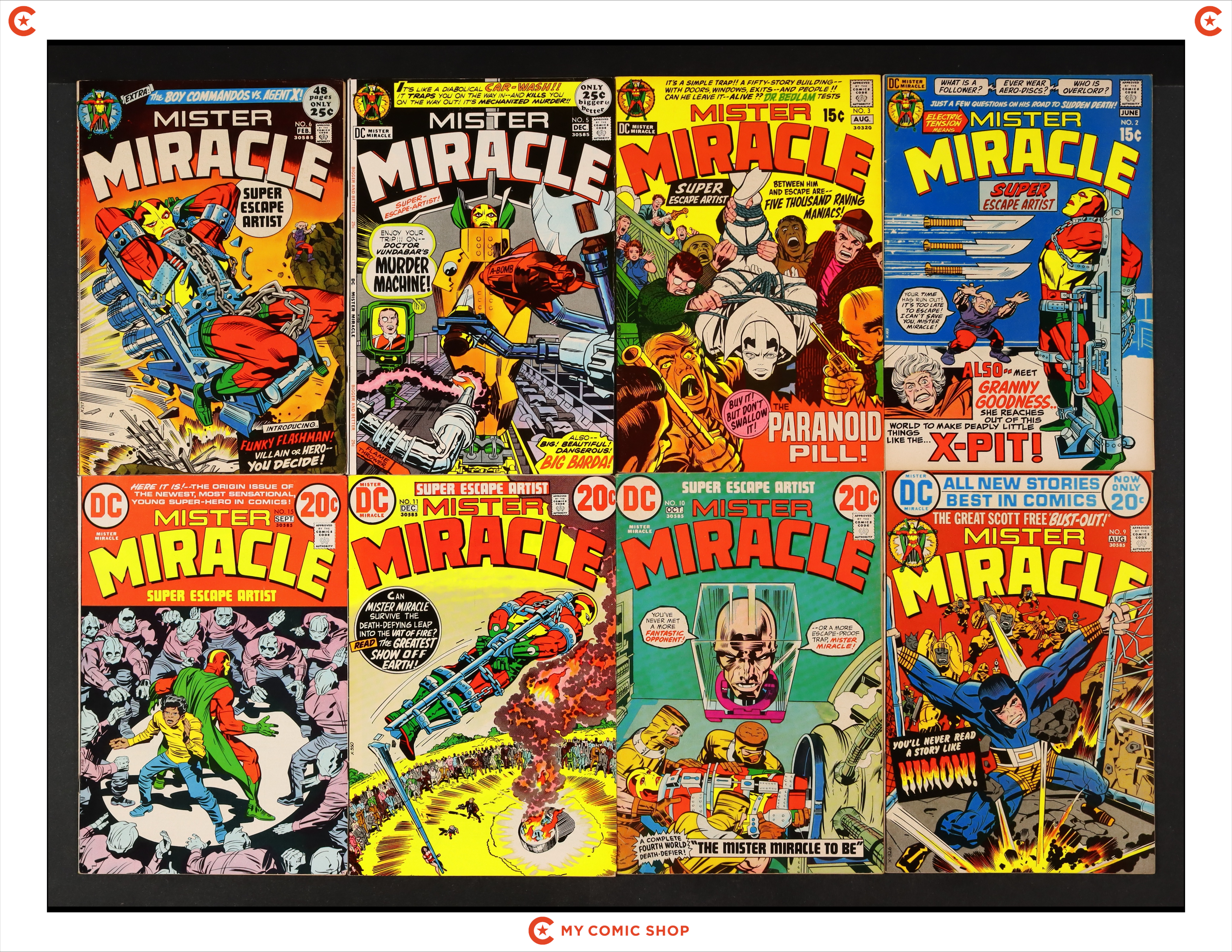 Issues 2, 3, 5, 6, 9-11, and 15 of Mister Miracle (1971 1st Series). Most will grade in the FN range with some grading closer to VG/FN range.