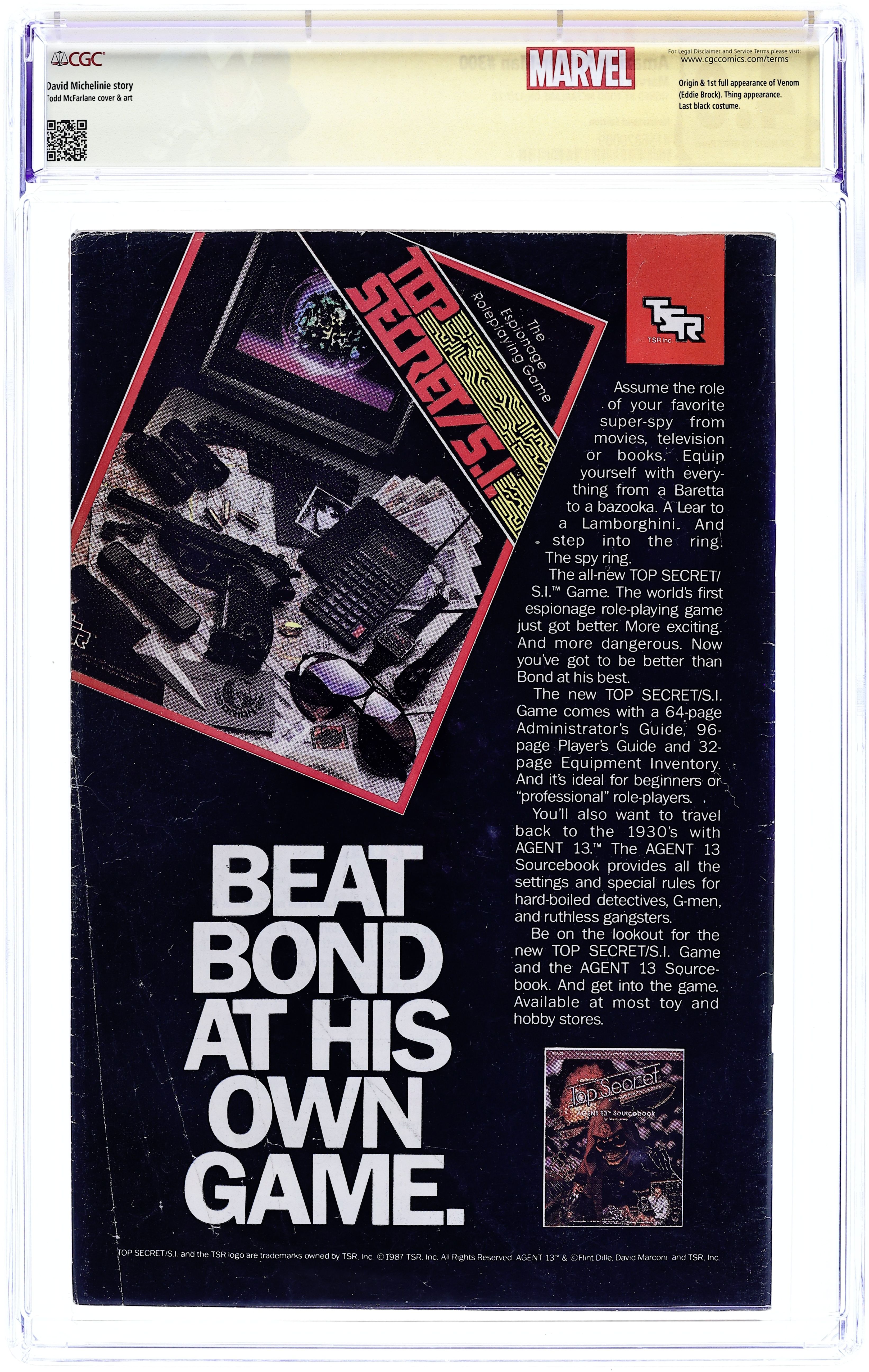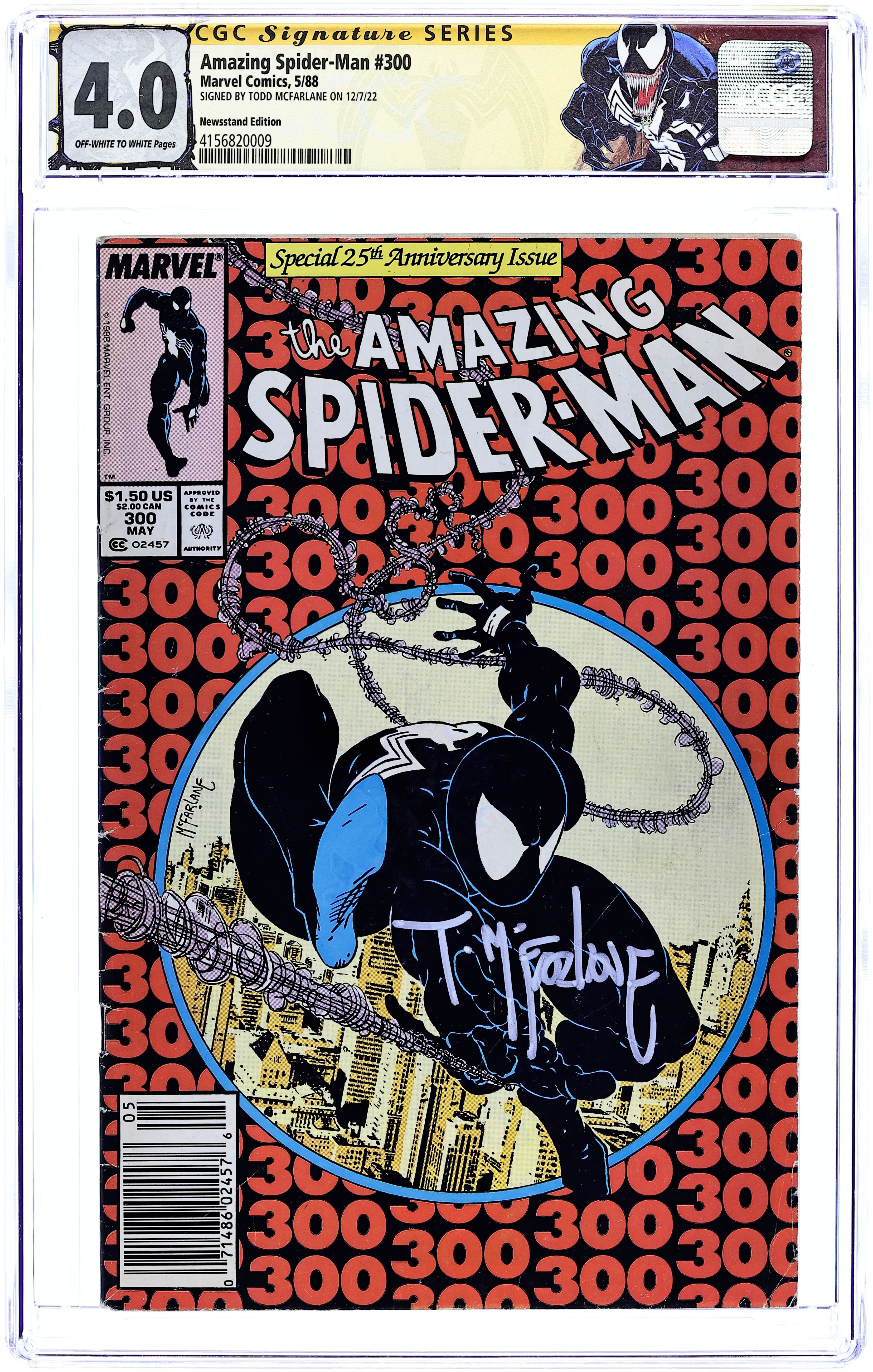 Ends Mar 9 7:17 PM CST Bid History 11 bids Current Bid $709 Your Secret Max Bid If you'd like to bid, please log in or register. Direct Edition. Giant-sized 25th anniversary issue. First full appearance of Venom in "Venom!", script by David Michelinie, art by Todd McFarlane; Spidey's old alien costume has merged with reporter Eddie Brock who thinks his career was ruined by Spider-Man and the symbiote of the two, Venom, takes on the web slinger; At MJ's request, Spidey returns to the blue and red costume as she now finds his black duds way too creepy; This is the last issue in which Spider-Man appears in his black costume; Thing (of the Fantastic Four) cameo.. Stan's Soapbox Special in place of letters page: Full page editorial by Stan on the occasion of Spider-Man's 300th issue. 52 pgs., full color. Cover price $1.50.