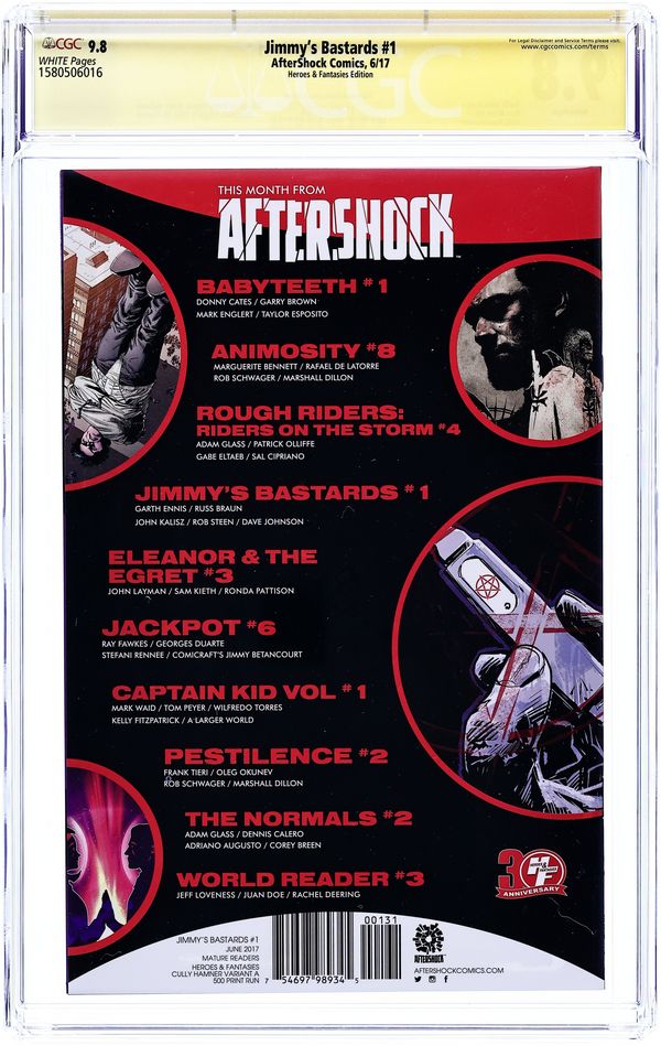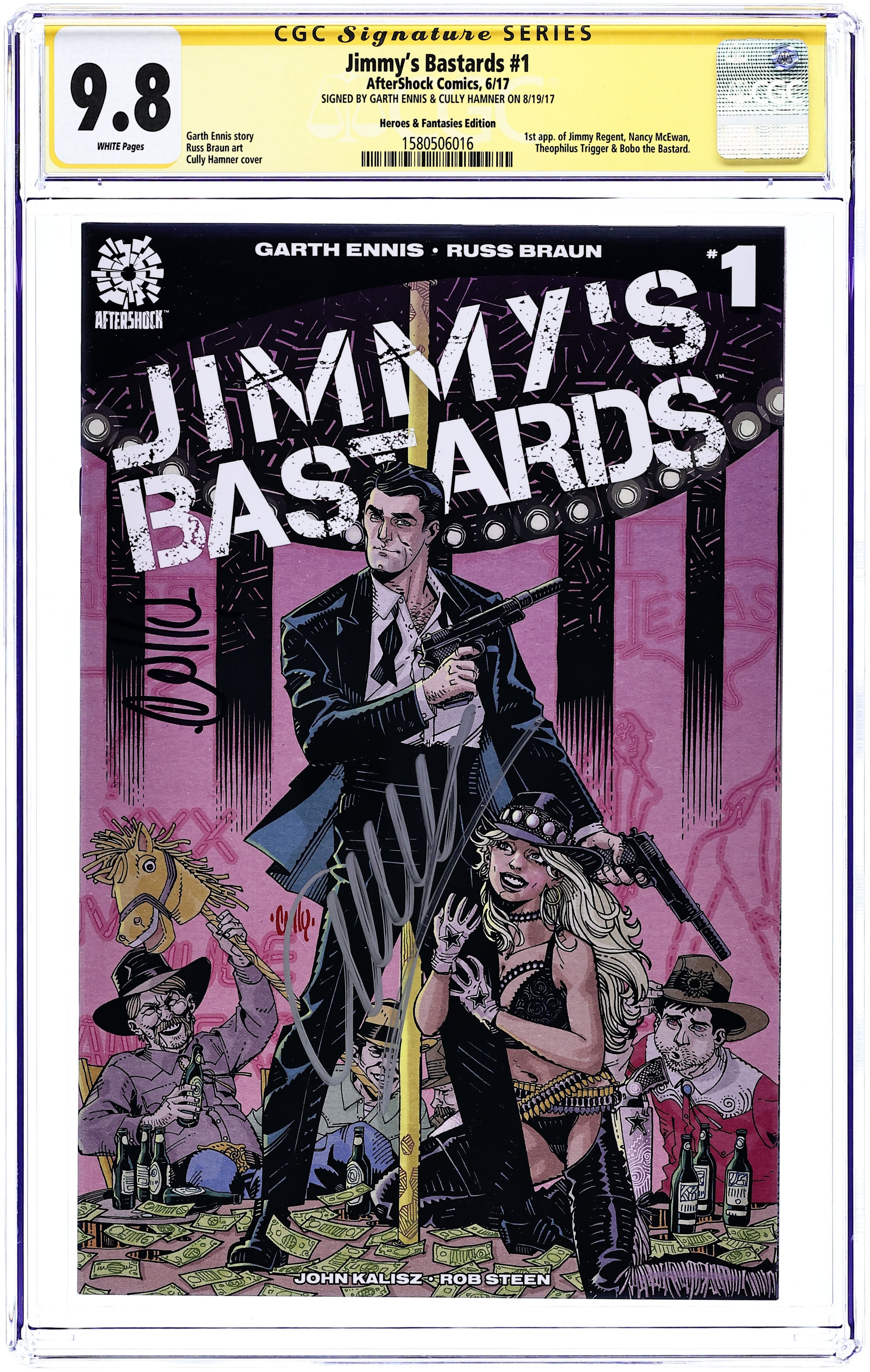 Published Jun 2017 by AfterShock Comics.Jimmy's Bastards (2017 Aftershock) 1HEROES.A CGC 9.8 SS Ennis/Hamner