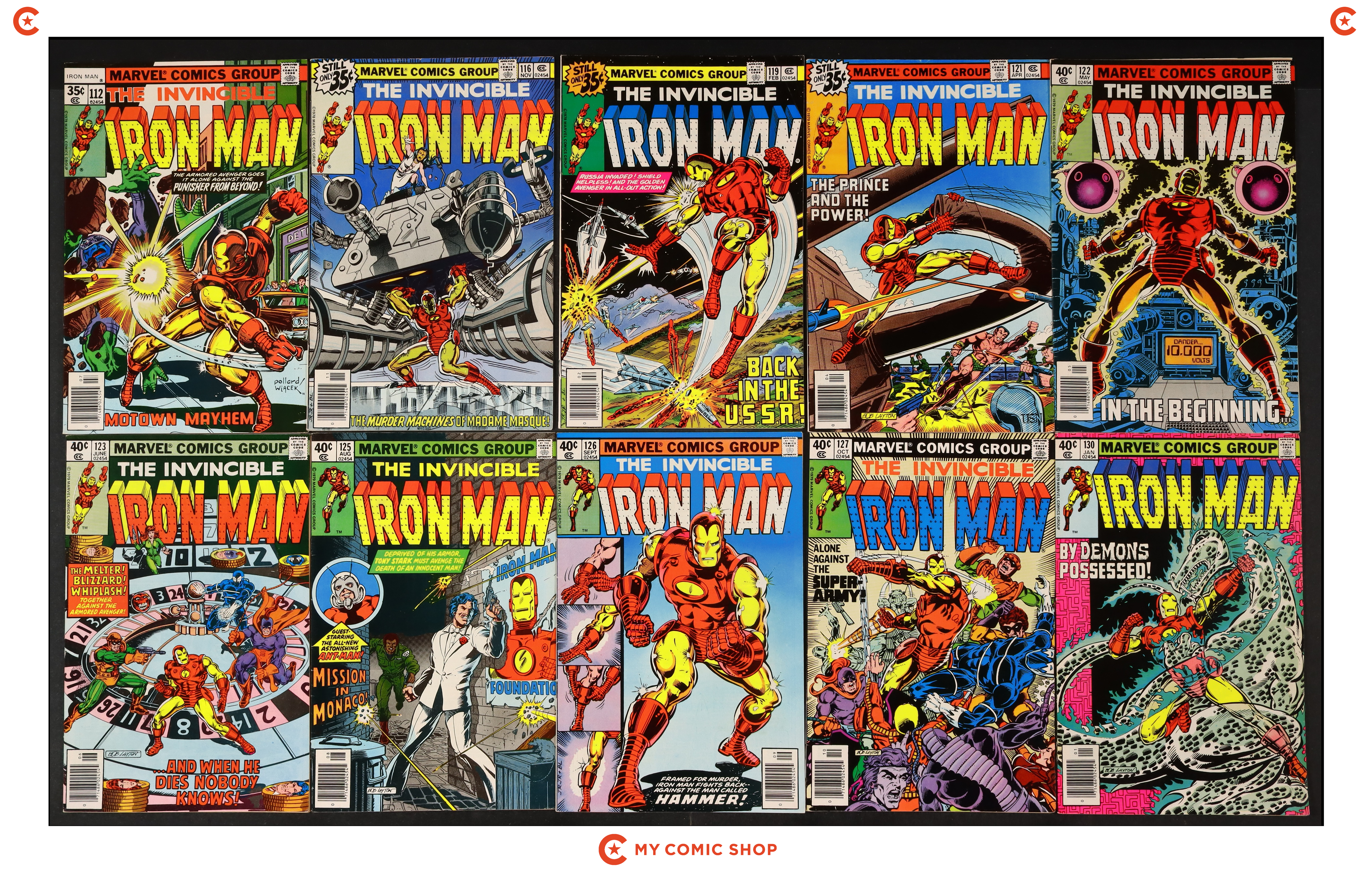 Issues 103-112 of Iron Man (1968 1st Series). Most will grade in the FN range with a couple grading VG and #105 grading GD.
