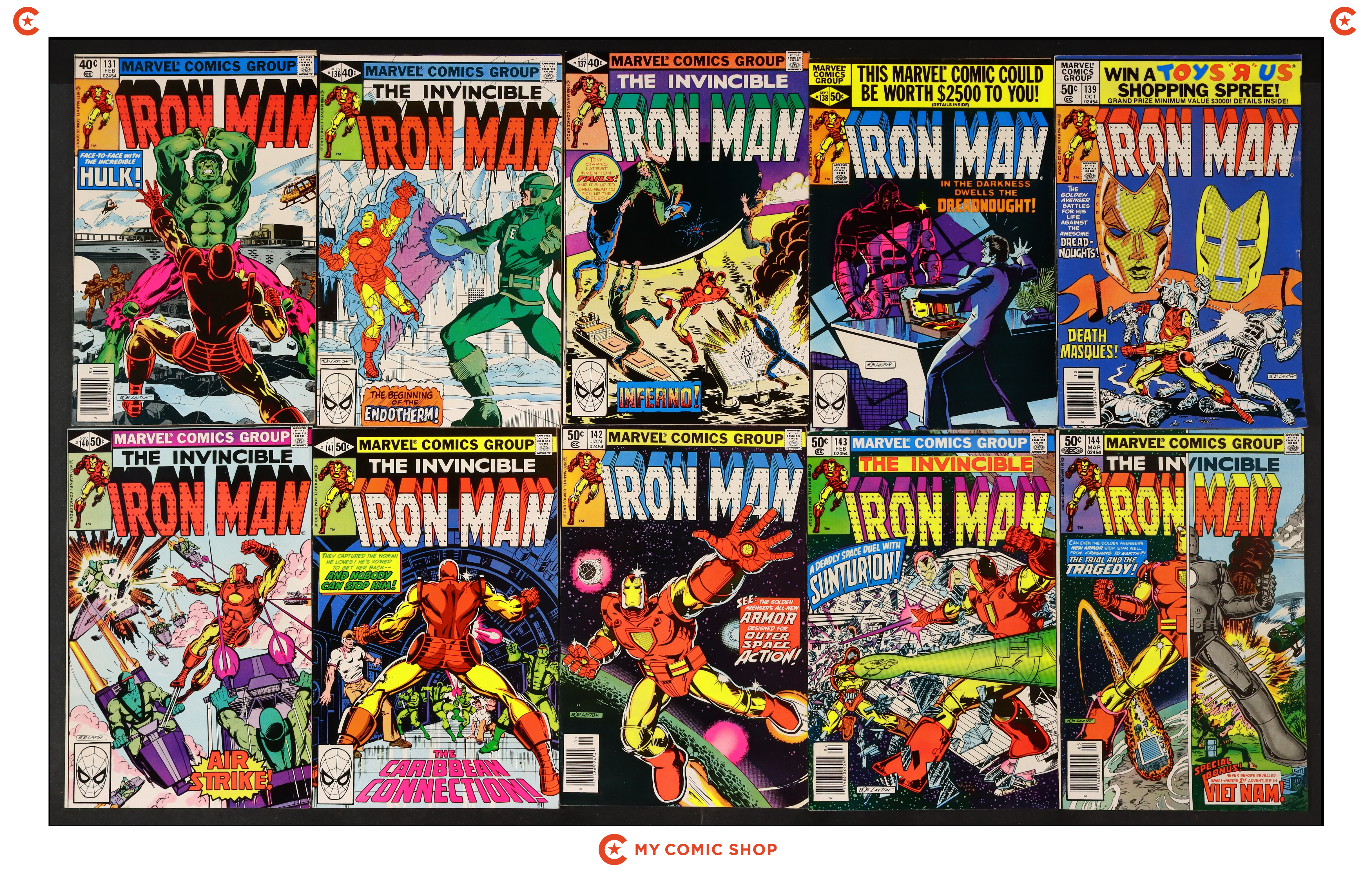 Issues 131N, 136D, 137, 138, 139N, 140, 141, 142, 143N, and 144 of Iron Man (1968 1st Series). Most will grade in the VG to FN range.