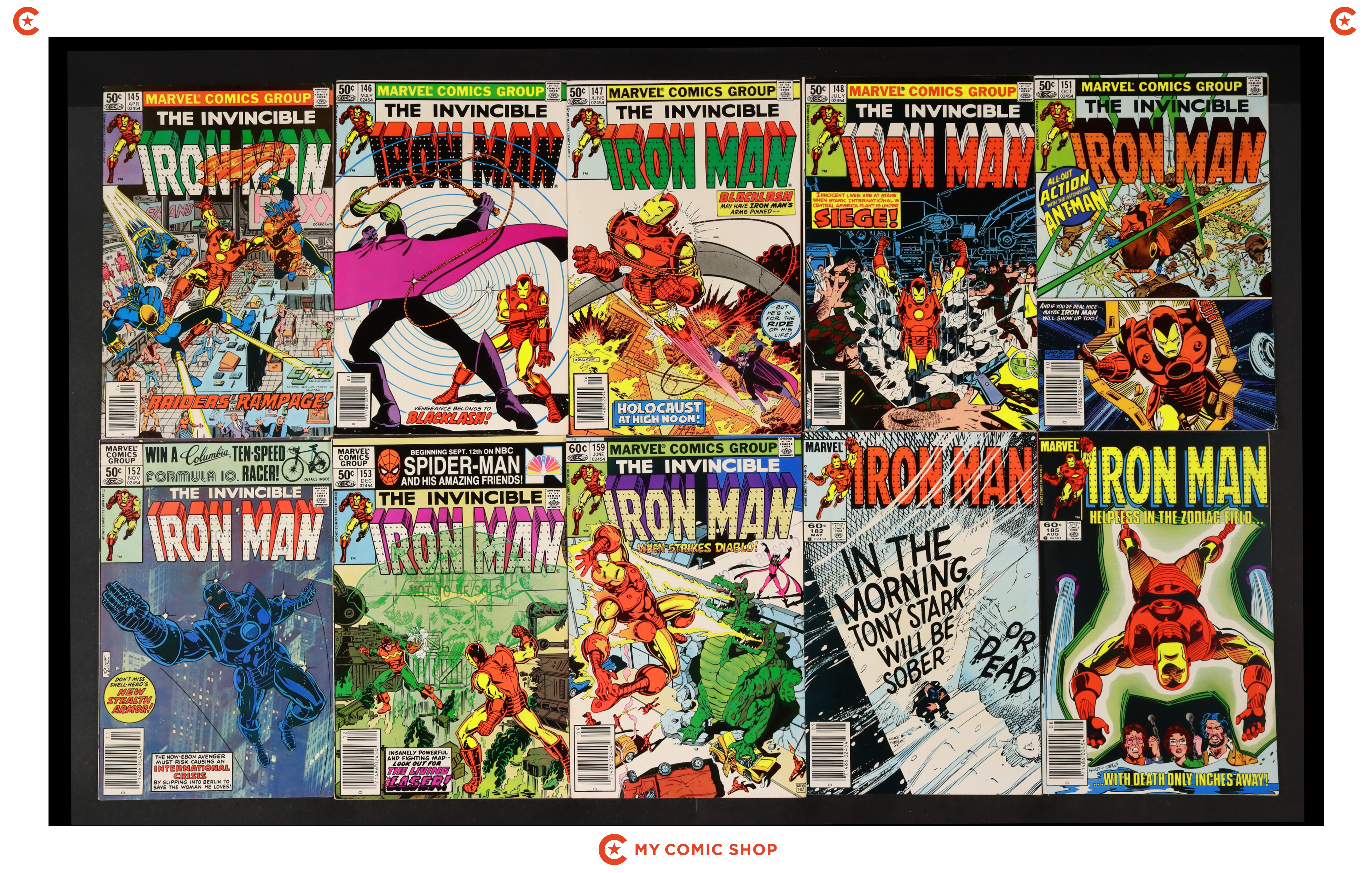 Issues 145N, 146N, 147N, 148, 151, 152N, 153N, 159N, 182, and 185 of Iron Man (1968 1st Series). Most will grade in the FN to VF range.