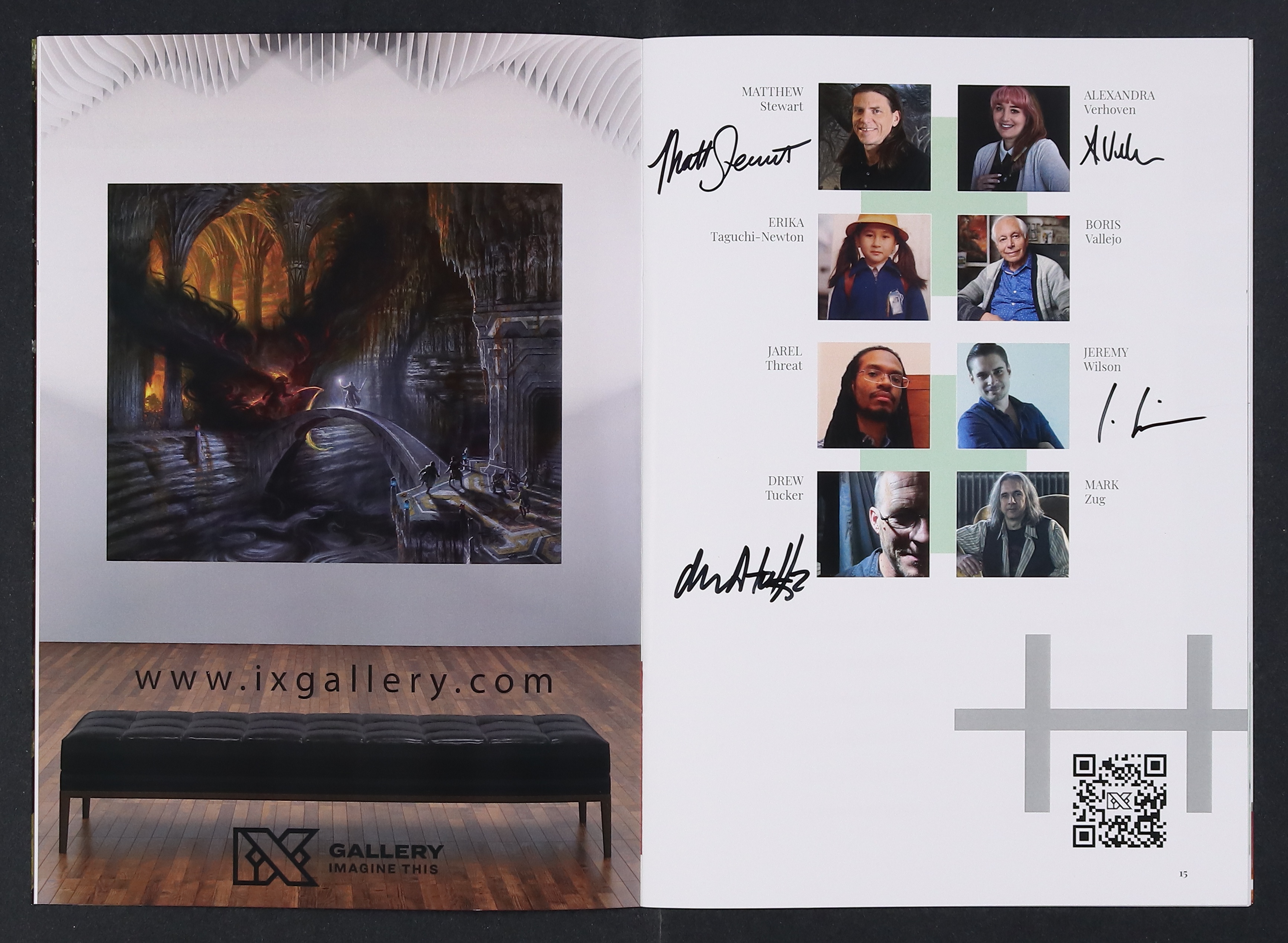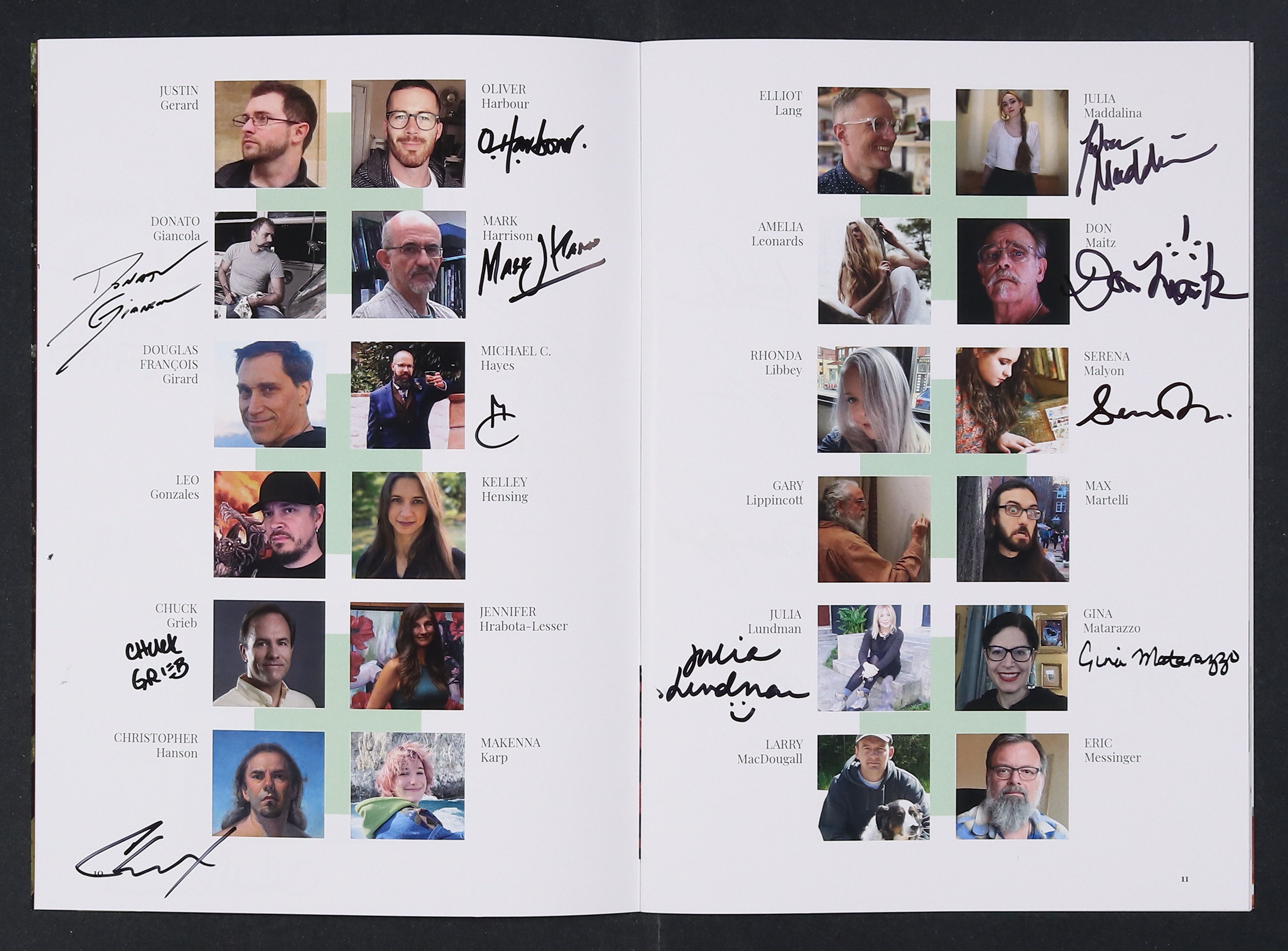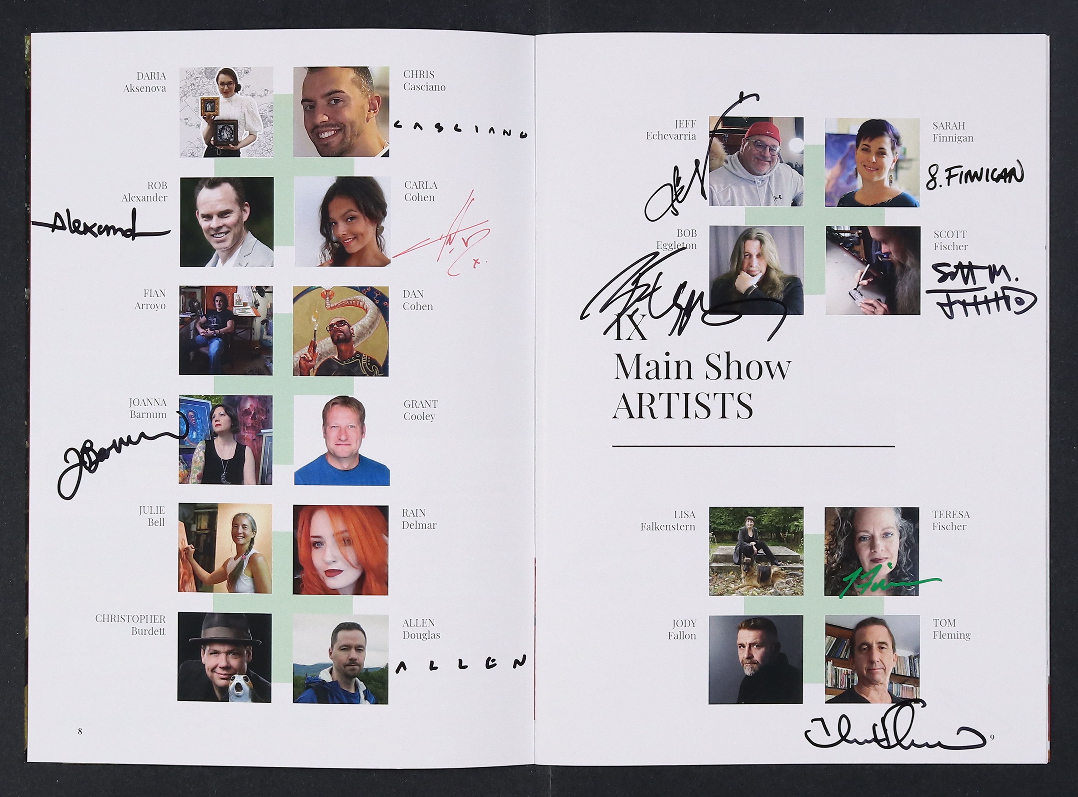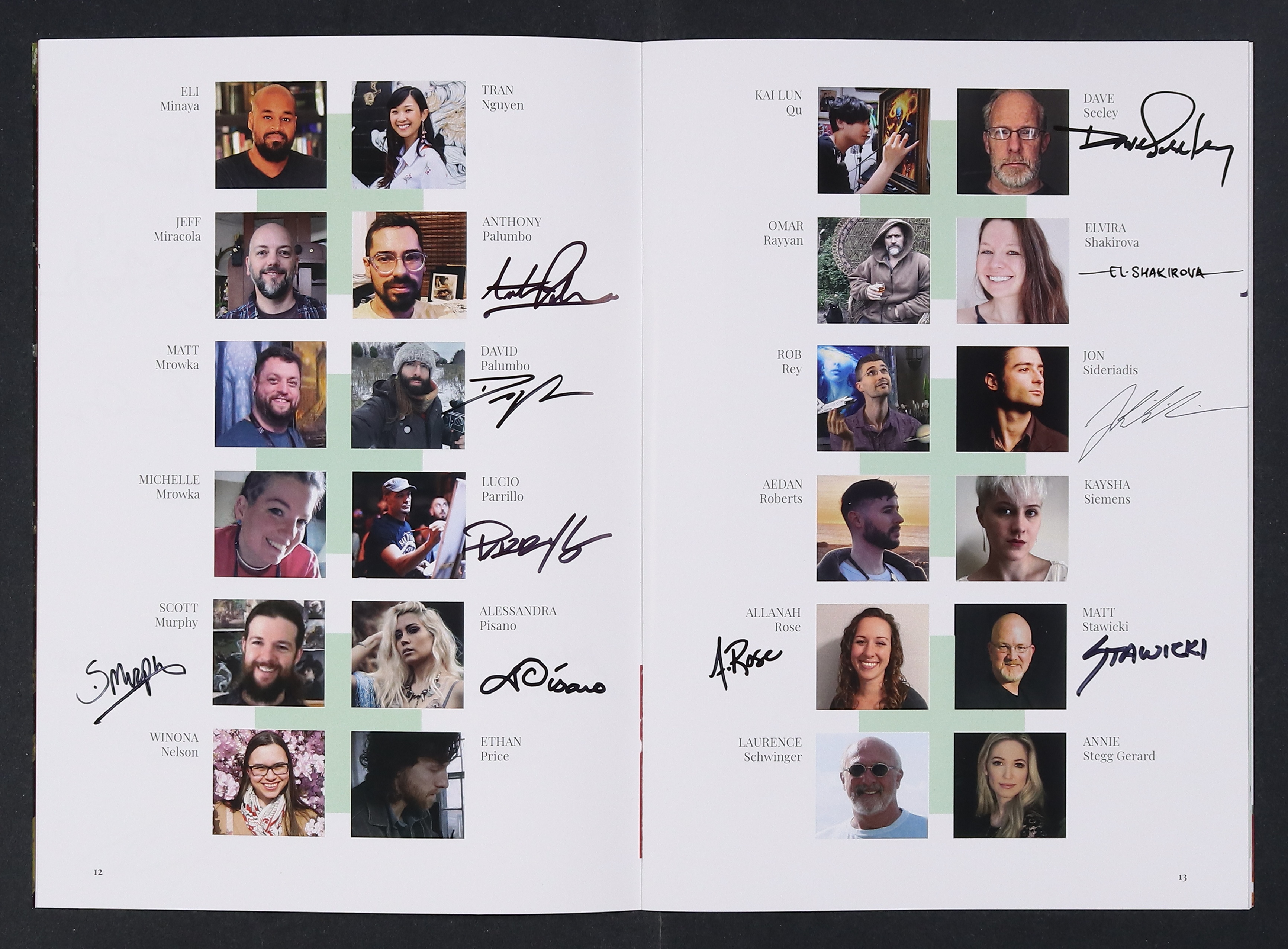Signed by Chris Casciano, Rob Alexander, Carla Cohen, Joanna Barnum, Allen Douglas, Jeff Echevarria, Sarah Finnigan, Bob Eggleton, Scott Fischer, Teresa Fischer, Tom Fleming, Oliver Harbour, Donato Giancola, Mark Harrison, Michael C. Hayes, Chuck Grieb, Christopher Hanson, Julia Maddalina, Don Maitz, Serena Malyon, Julia Lundman, Gina Matarazzo, Anthony Palumbo, David Palumbo, Lucio Parrillo, Scott Murphy, Alessandra Pisano, Dave Seeley, Elvira Shakirova, Jon Sideriadis, Allanah Rose, Matt Stawicki, Matthew Stewart, Alexandra Verhoven, Jeremy Wilson, and Drew Tucker. All signatures are near the artists' headshots on the interior. No certification is included.