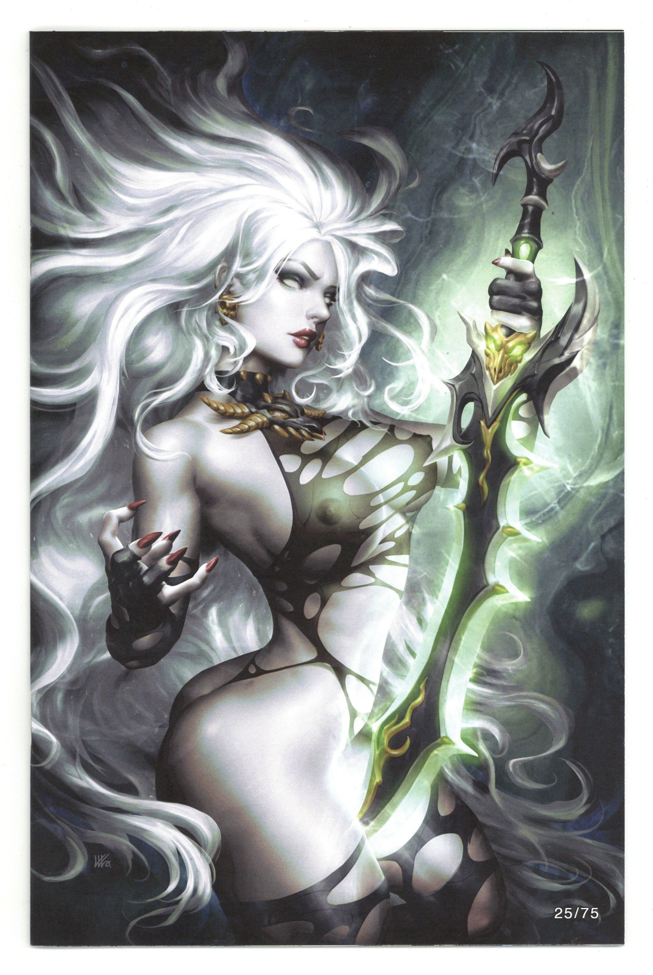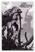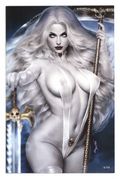 Starts May 18 Ultimate 3-Book Set - Limited to 75 sets. Includes all 3 Kendrick Lim Ultimate Edition Variant covers with matching LTD numbers. Written by Mike MacLean. Art by Diego Bernard. High upon a mystical floating island, Lady Death is caught in a battle between an evil clan of dragon riders and a deadly serpent-worshipping cult. To free a village of slaves, she must incite conflict between the two sides. Will Lady Death's NEW sword be a match for the serpents' fangs and the dragons' breath? Can her wits outmaneuver a warlord's blade and a witch's dark magic? 28 pages, full color, mature readers.