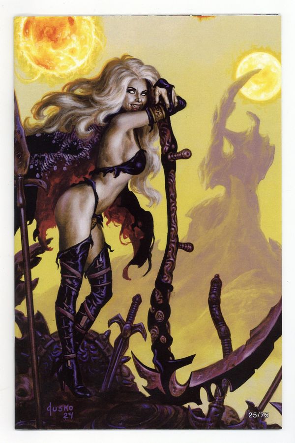 Starts May 18 Legend 3-Book Set - Limited to 75 sets. Includes all 3 Joe Jusko Legend Edition Variant covers with matching LTD numbers. Written by Mike MacLean. Art by Diego Bernard. High upon a mystical floating island, Lady Death is caught in a battle between an evil clan of dragon riders and a deadly serpent-worshipping cult. To free a village of slaves, she must incite conflict between the two sides. Will Lady Death's NEW sword be a match for the serpents' fangs and the dragons' breath? Can her wits outmaneuver a warlord's blade and a witch's dark magic? 28 pages, full color, mature readers.