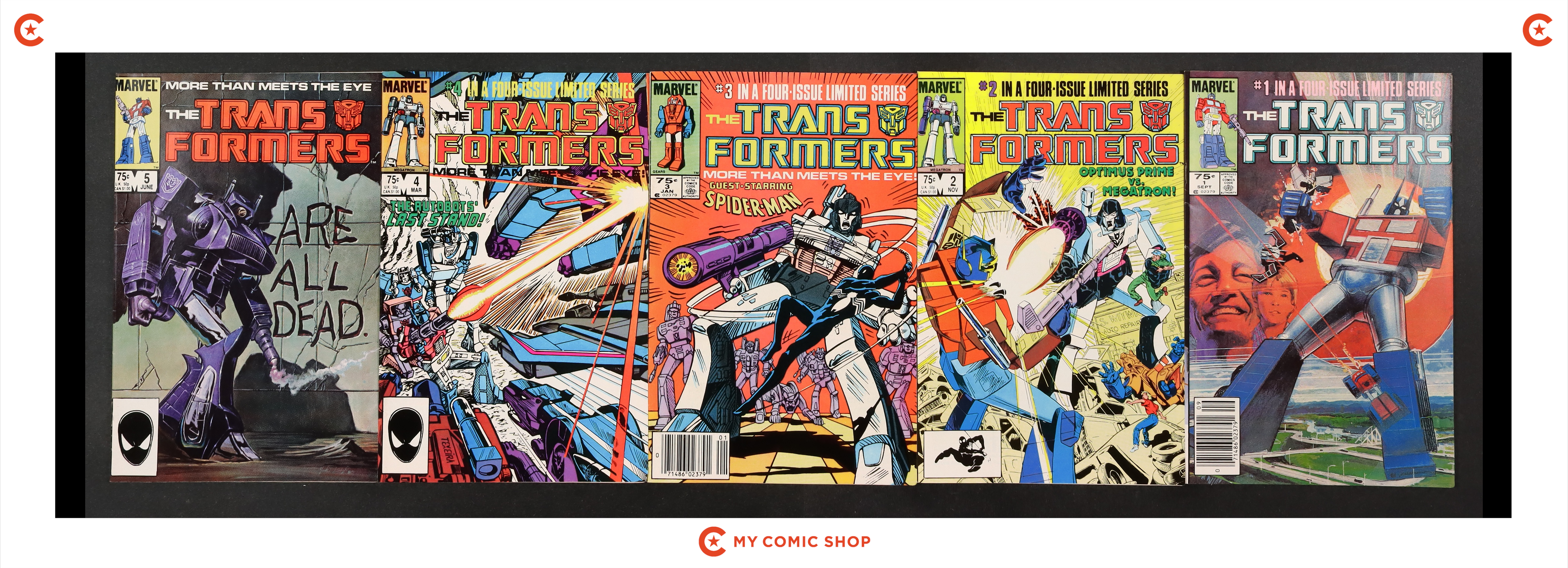 Issues 1N, 2D, 3N, 4D, 5D of Transformers (1984 Marvel). Most will grade in the FN- to VF- range.