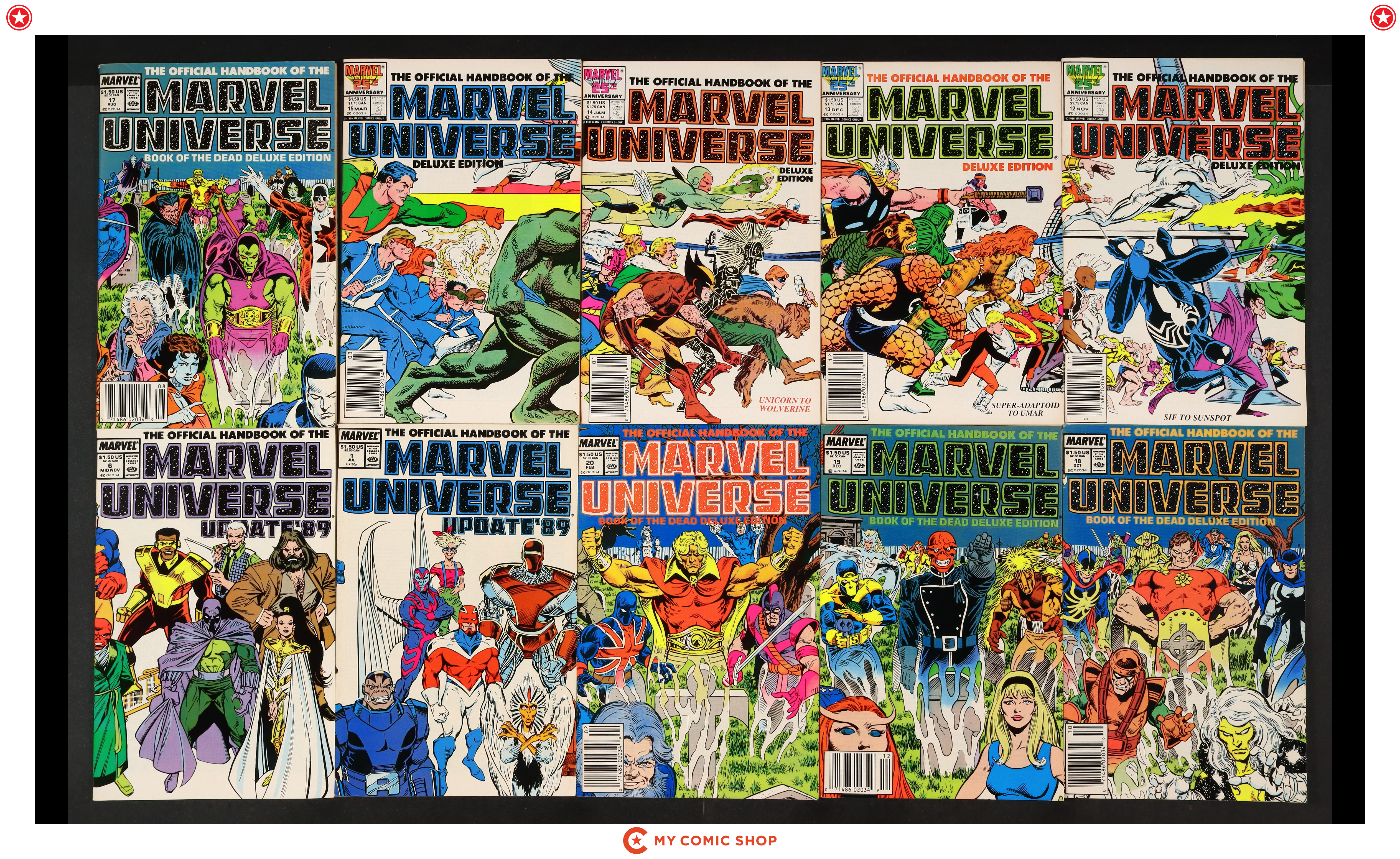 Issues 12N, 13N, 14N, 15N, 17N, 18N, 19N, 20N of Official Handbook of the Marvel Universe Deluxe Edition (1985-1988 Marvel), and issues 1, 6 of Official Handbook of the Marvel Universe Update '89 (1989 Marvel). Most will grade in the VG to FN range.