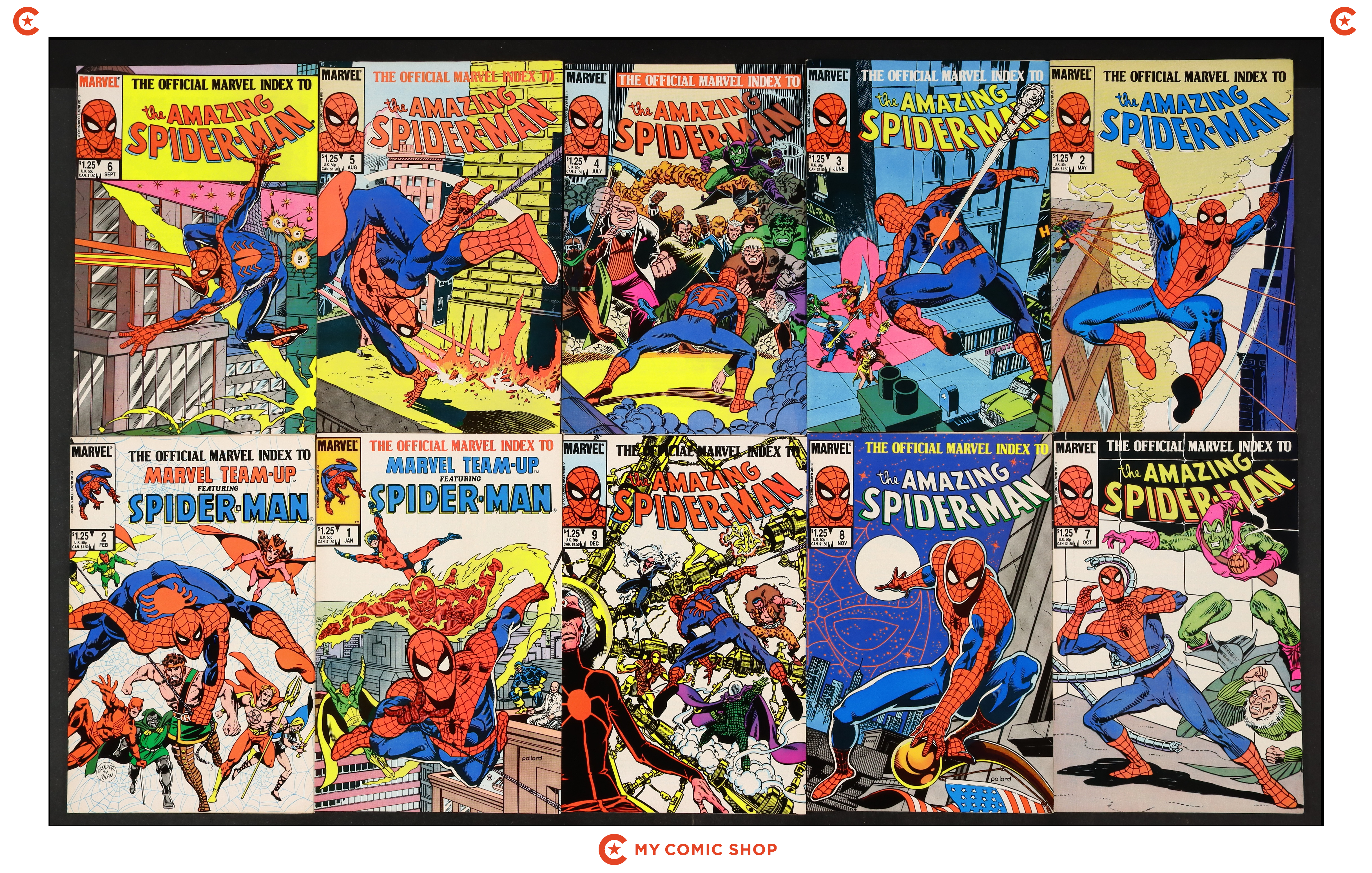 Issues 2-9 of Official Marvel Index to Amazing Spider-Man (1985), and issues 1, 2 of Official Marvel Index to Marvel Team-Up (1986). Most will grade in the FN to VF range.