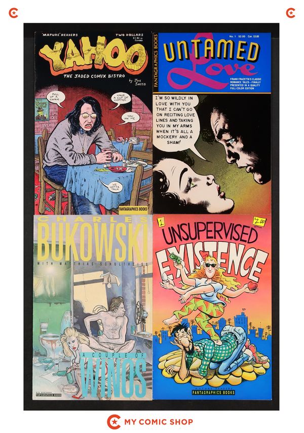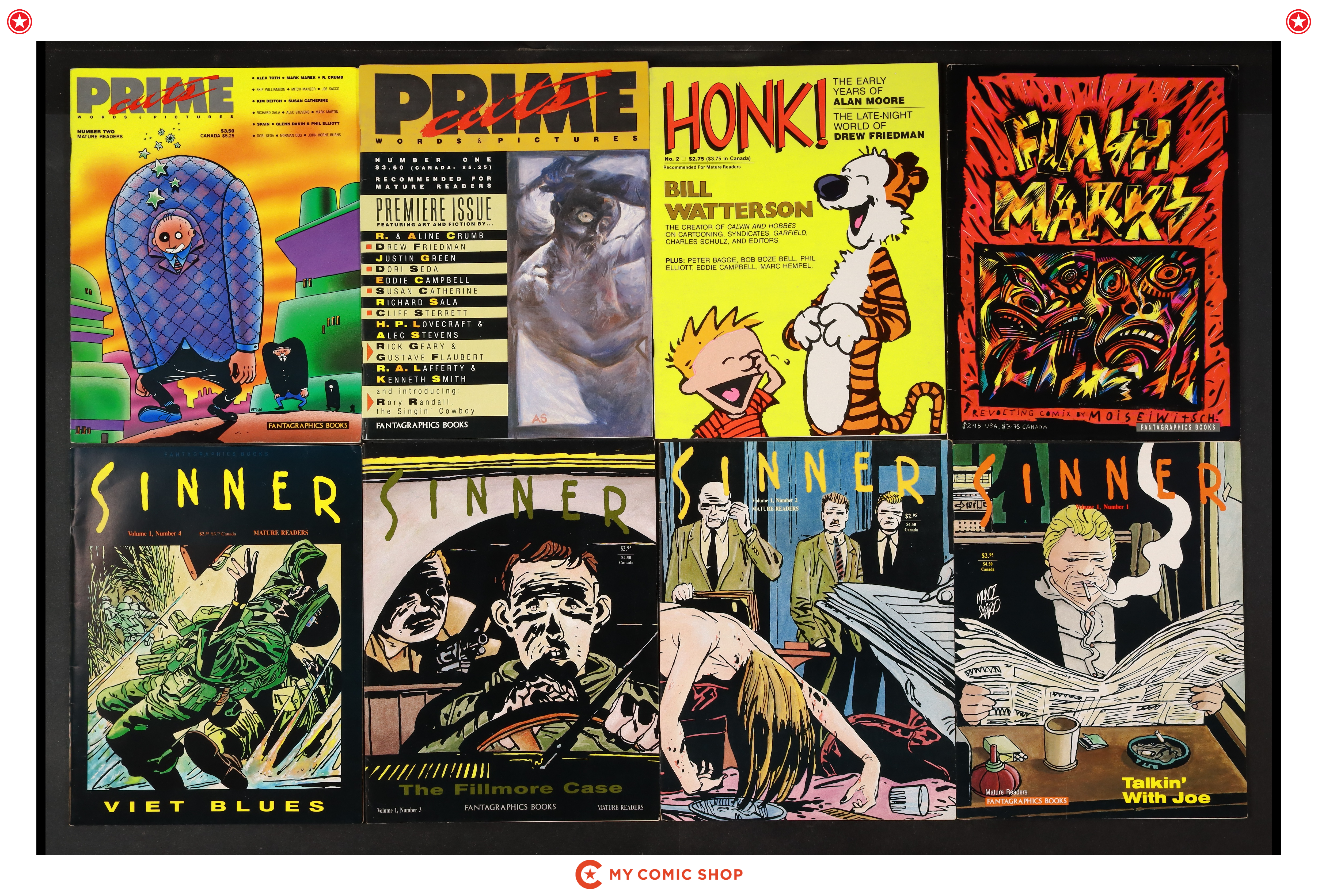 Issues Untamed Love (1987 Fantagraphics) 1; Yahoo (1988 Fantagraphics) 1; Unsupervised Existence (1989) 1; Couple of Winos (1991) 0; Flashmarks (1986) 1; Honk! (1986) 2; Prime Cuts (1987 Fantagraphics) 1, 2; and 1-4 of Sinner Magazine (1987). Most will grade in the VG to FN range.