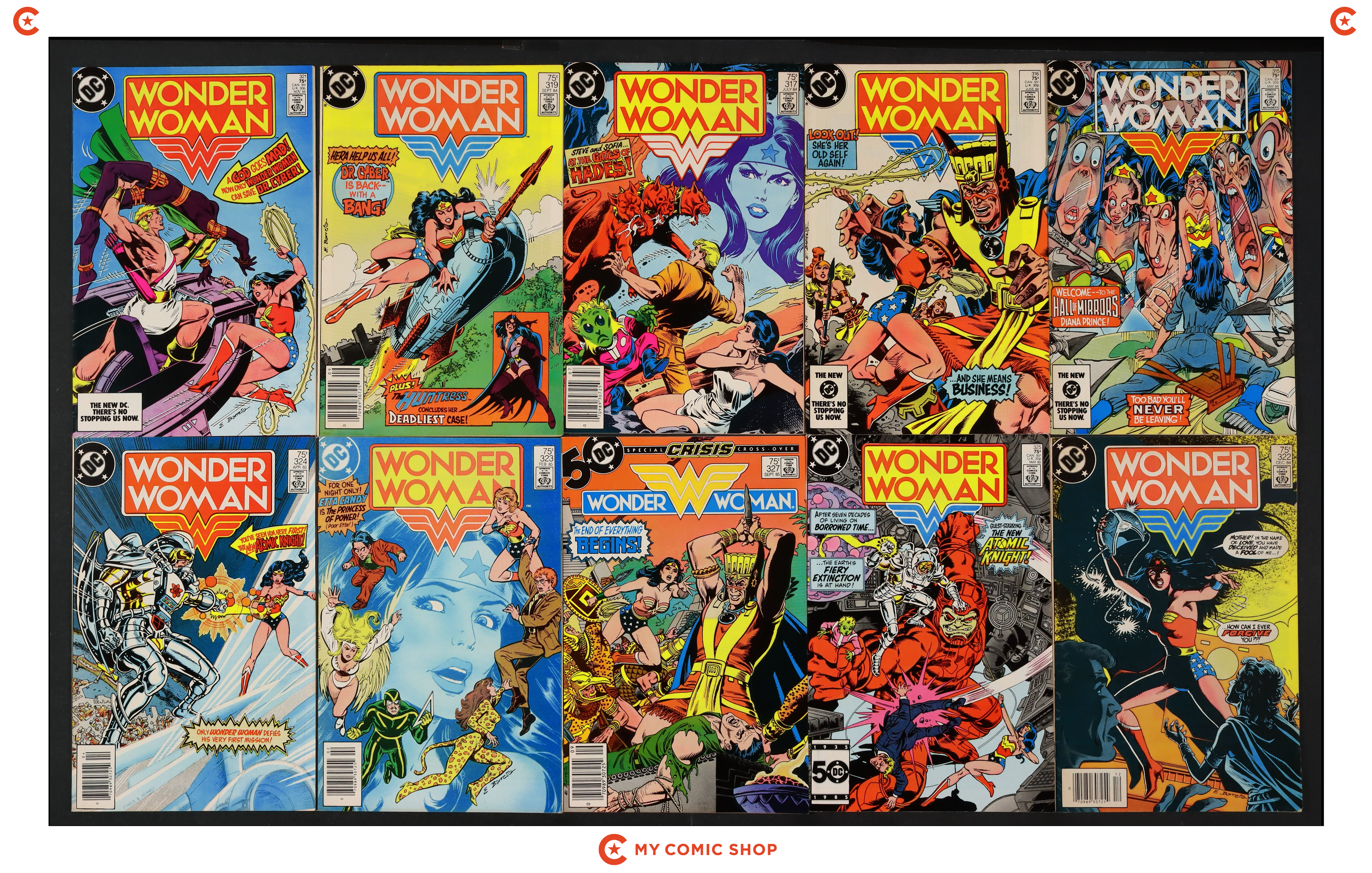 Issues 315-317, 319, 321, 322, 325, 327 of Wonder Woman (1942 1st Series DC) and 323MJ, 324MJ of Wonder Woman (1942 1st Series DC) Mark Jewelers. Most issues will grade in the VG to FN range.