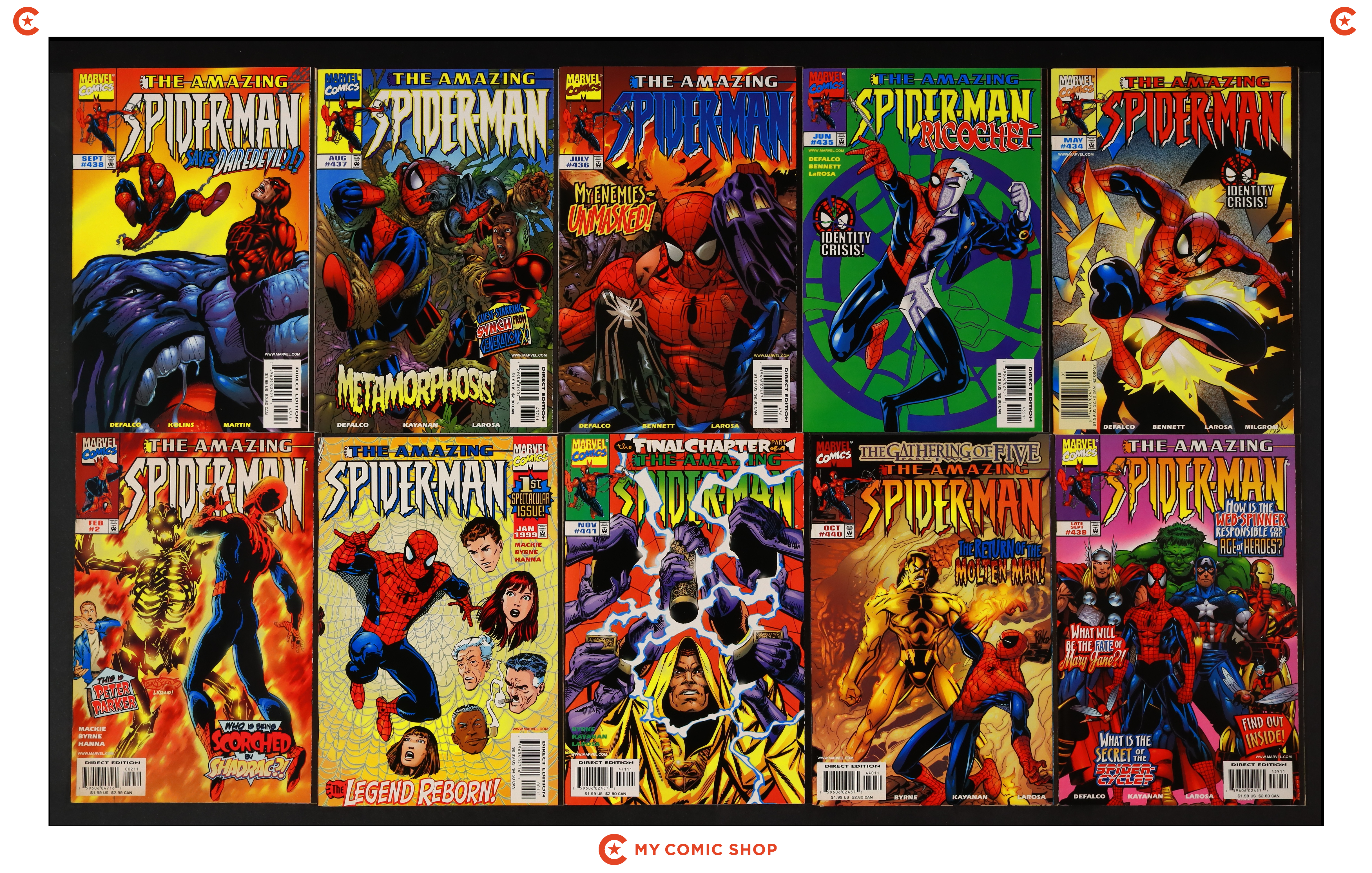 Issues 434A.N-441 of Amazing Spider-Man (1963 1st Series), and issues 1A.D, 2A of Amazing Spider-Man (1998 2nd Series). Most will grade in the FN to VF range with #2A of Amazing Spider-Man (1998 2nd Series) grading VG.