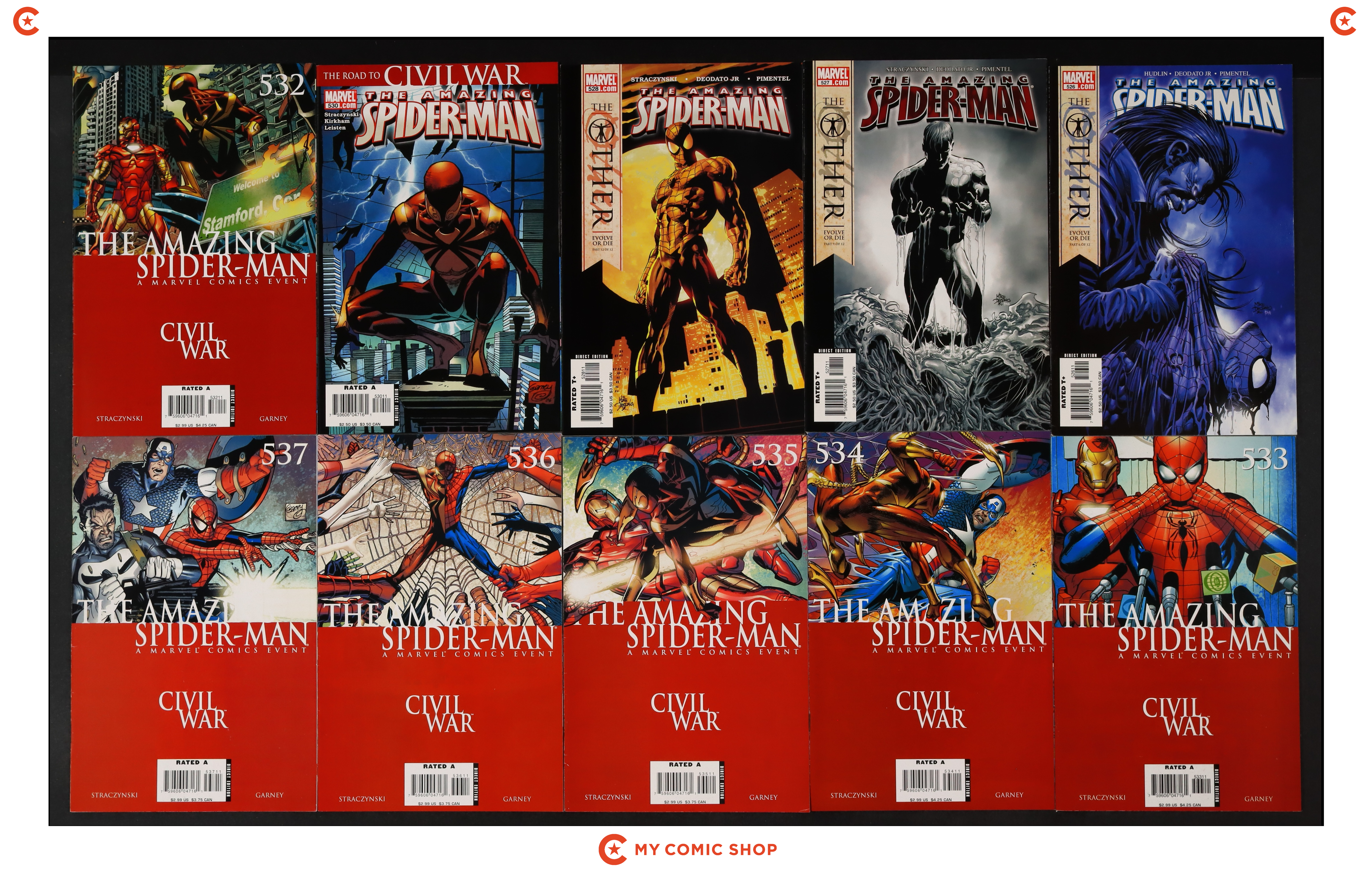 Issues 526A, 527A, 528A, 530, 532, 533A, 534, 535, 536, 537A of Amazing Spider-Man (1998 2nd Series). Most will grade in the FN to VF range.