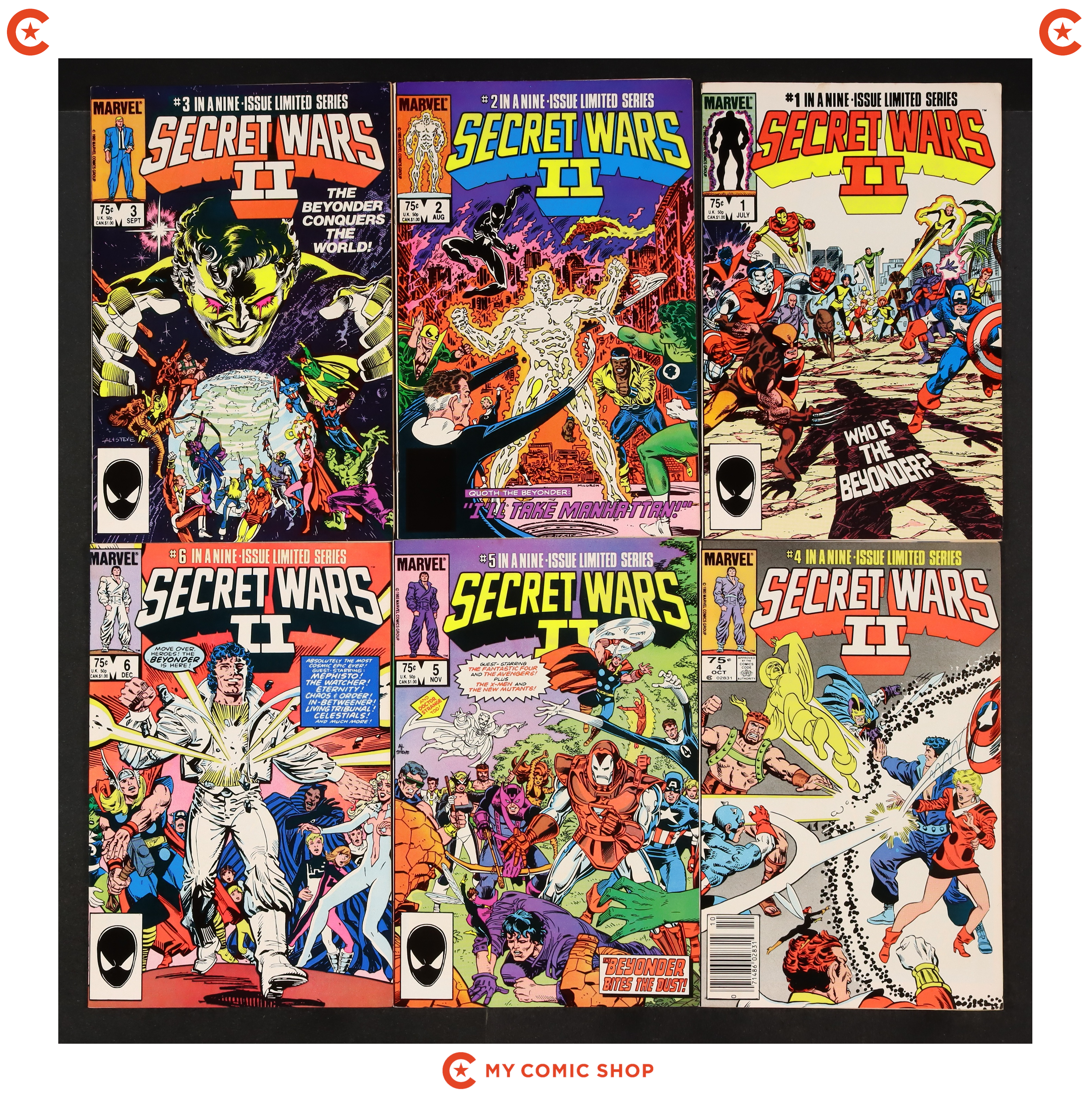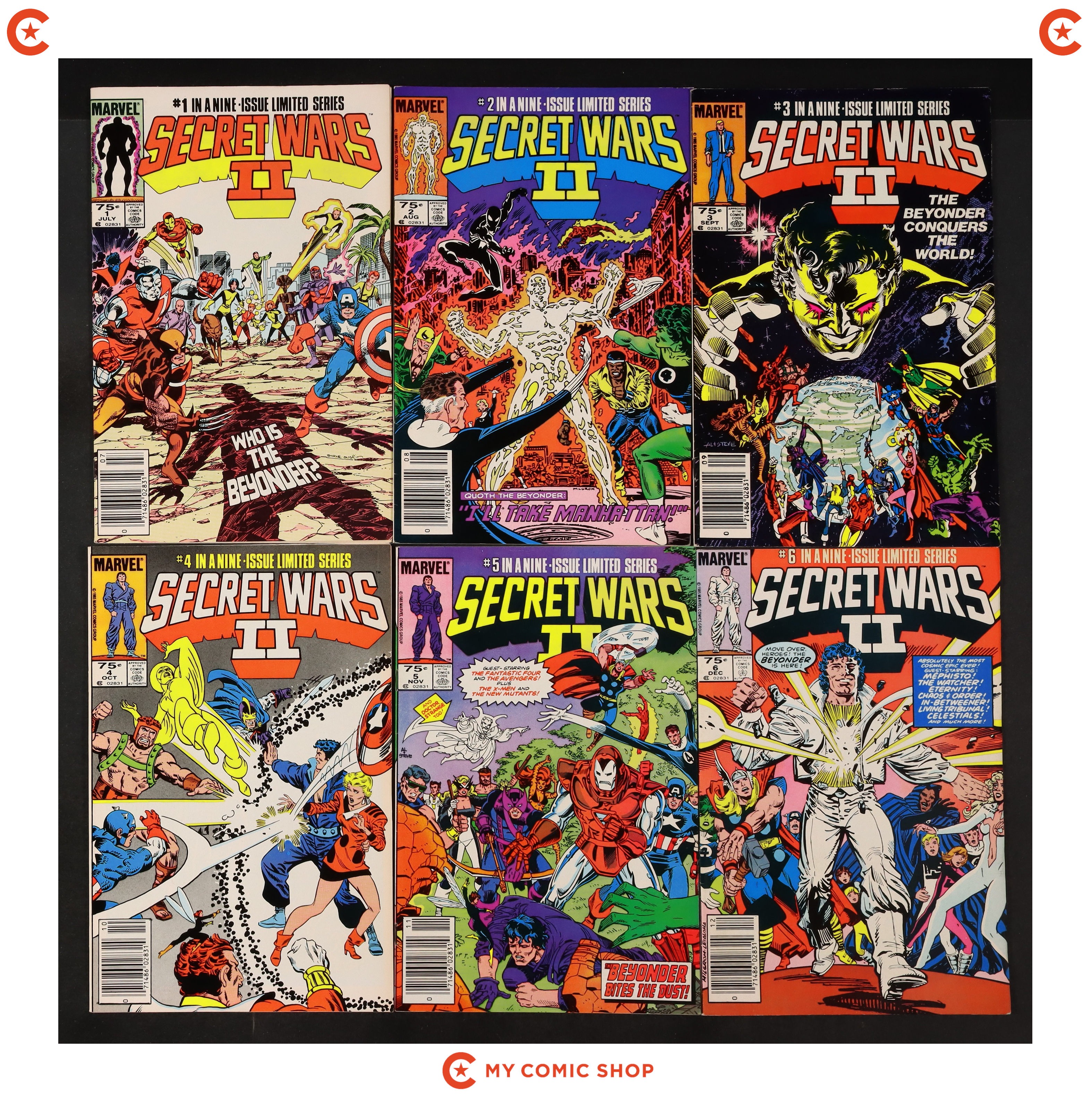 Issues 7N, 9D, 10N, 11D of Marvel Super Heroes Secret Wars (1984); and 1D, 2D of Secret Wars II (1985 Marvel). Most will grade in the VG/FN to FN/VF range, with 10 grading at GD/VG.