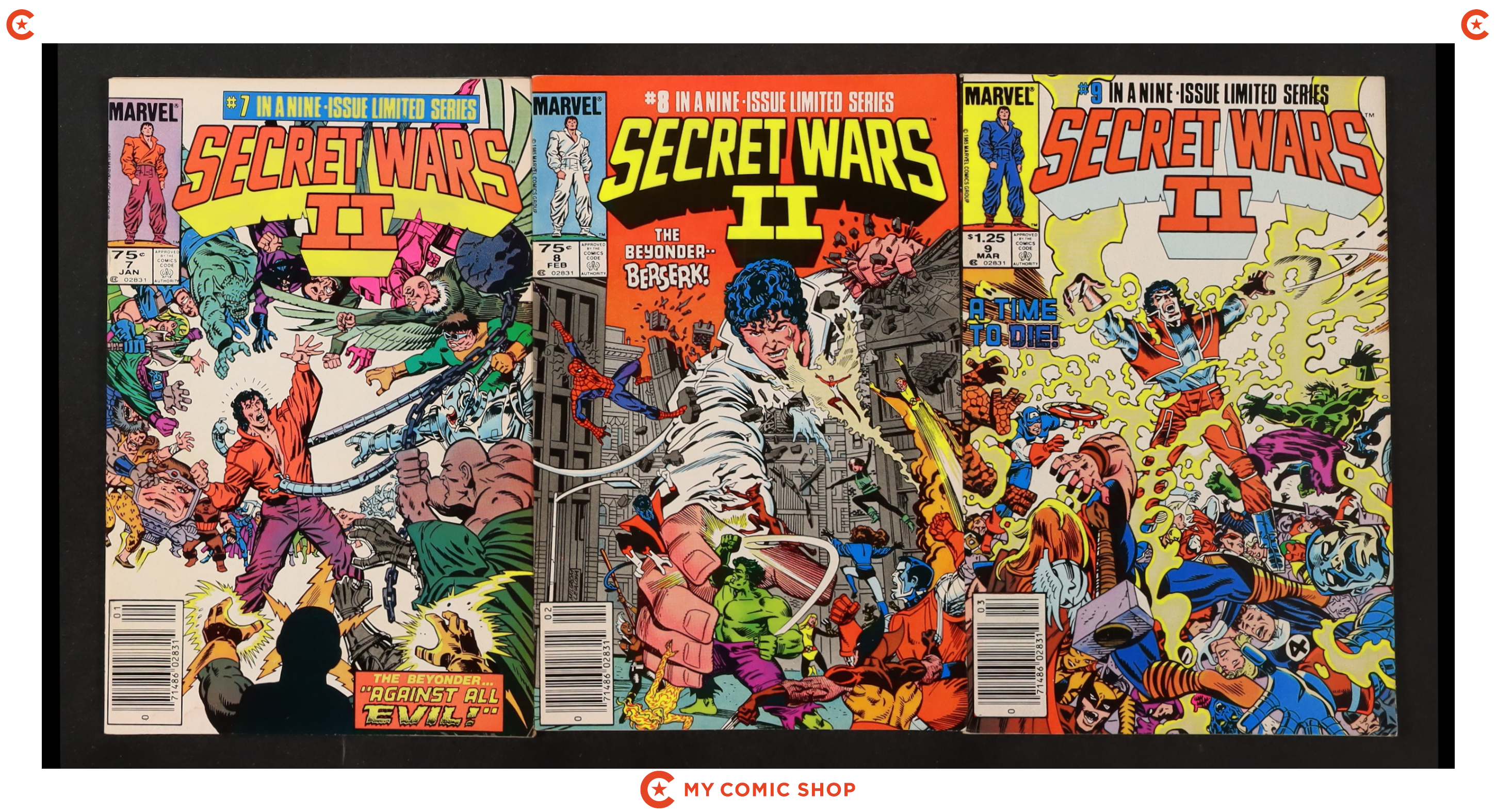 Issues 4N, 5D, 6N, 7N, 9N, 11D, 12D of Marvel Super Heroes Secret Wars (1984); and 1N, 2D, 3D of Secret Wars II (1985 Marvel). Most will grade in the VG to FN+ range, with 9 grading at GD.