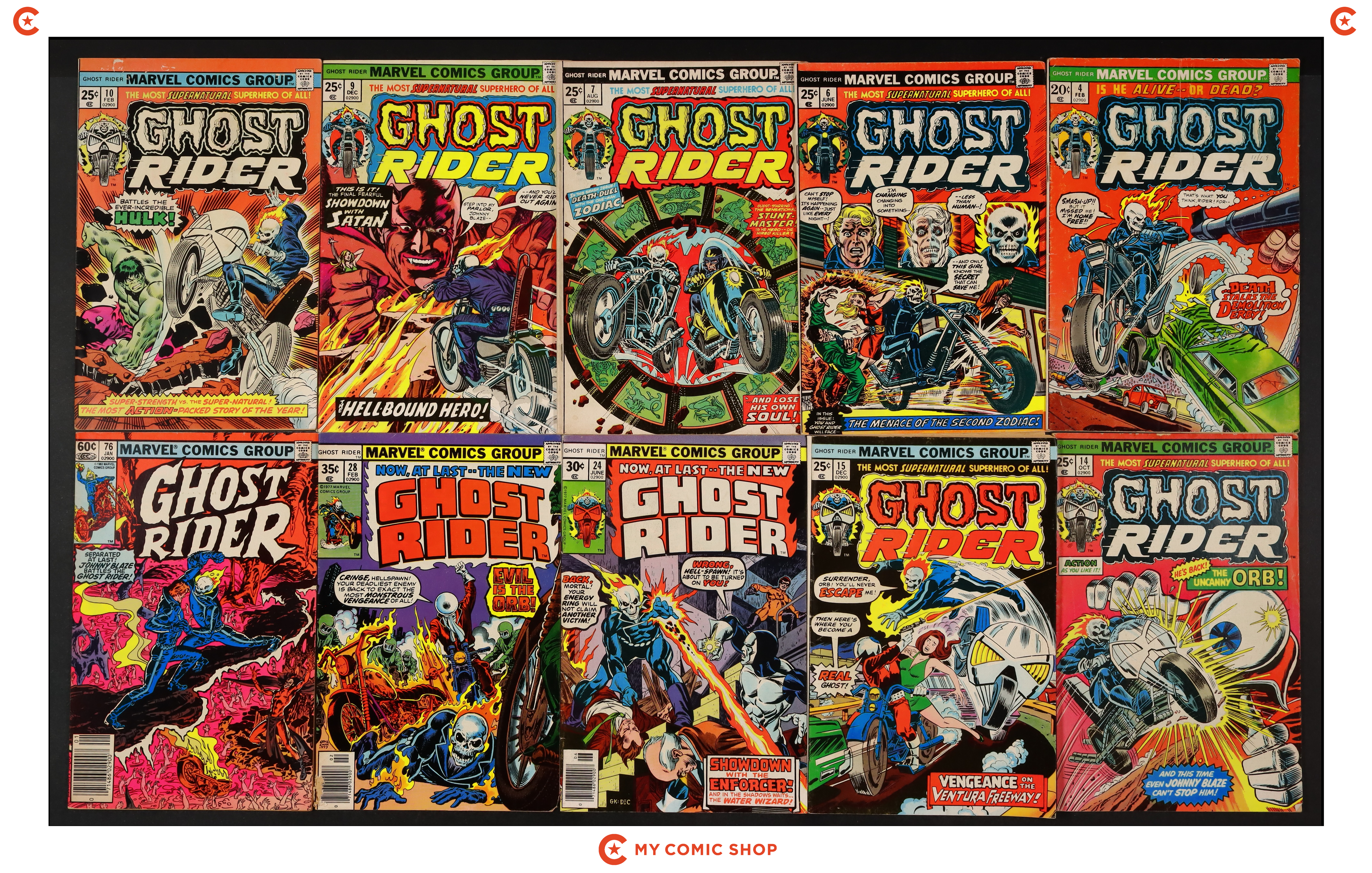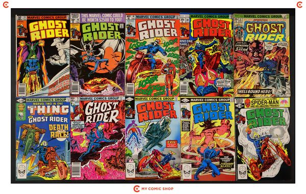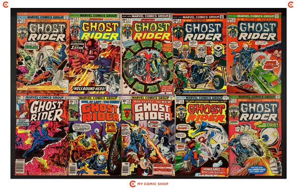 Issues 4, 6, 7, 9, 10, 14, 15, 24, 28, and 76 of Ghost Rider (1973 1st Series). Most will grade in the FN to VG range with a couple grading GD.