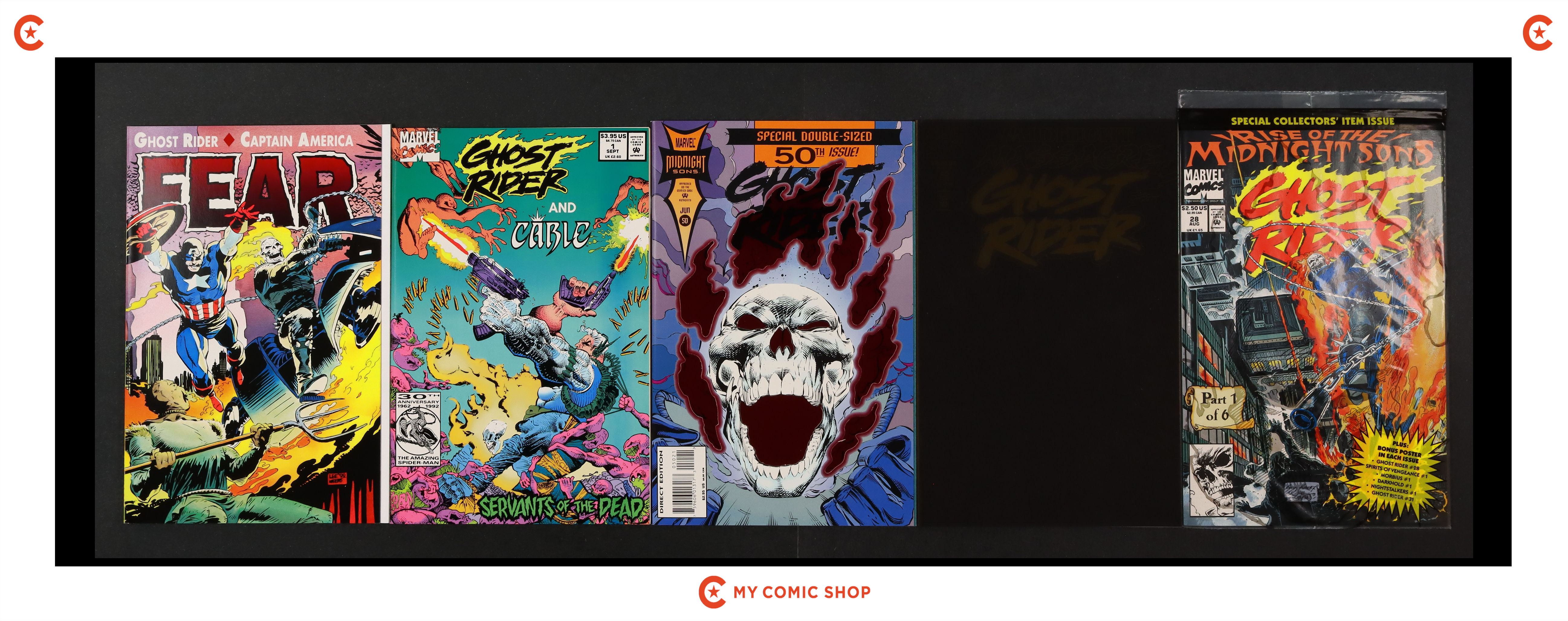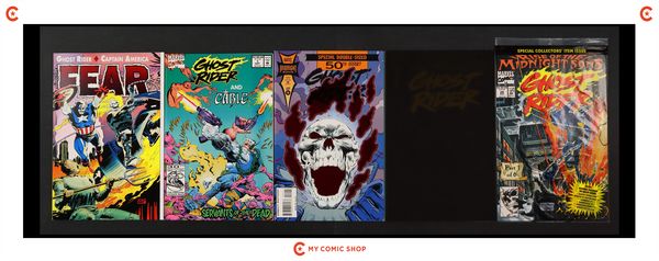 Issues 1, 3, 5, 8, 9, 15REP, 18, 25-27, 28D.P, 40, and 50A of Ghost Rider (1990 2nd Series); 1 of Ghost Rider and Cable (1991); and 1 of Ghost Rider Captain America Fear (1992). Most will grade in the VF range with a few grading FN.