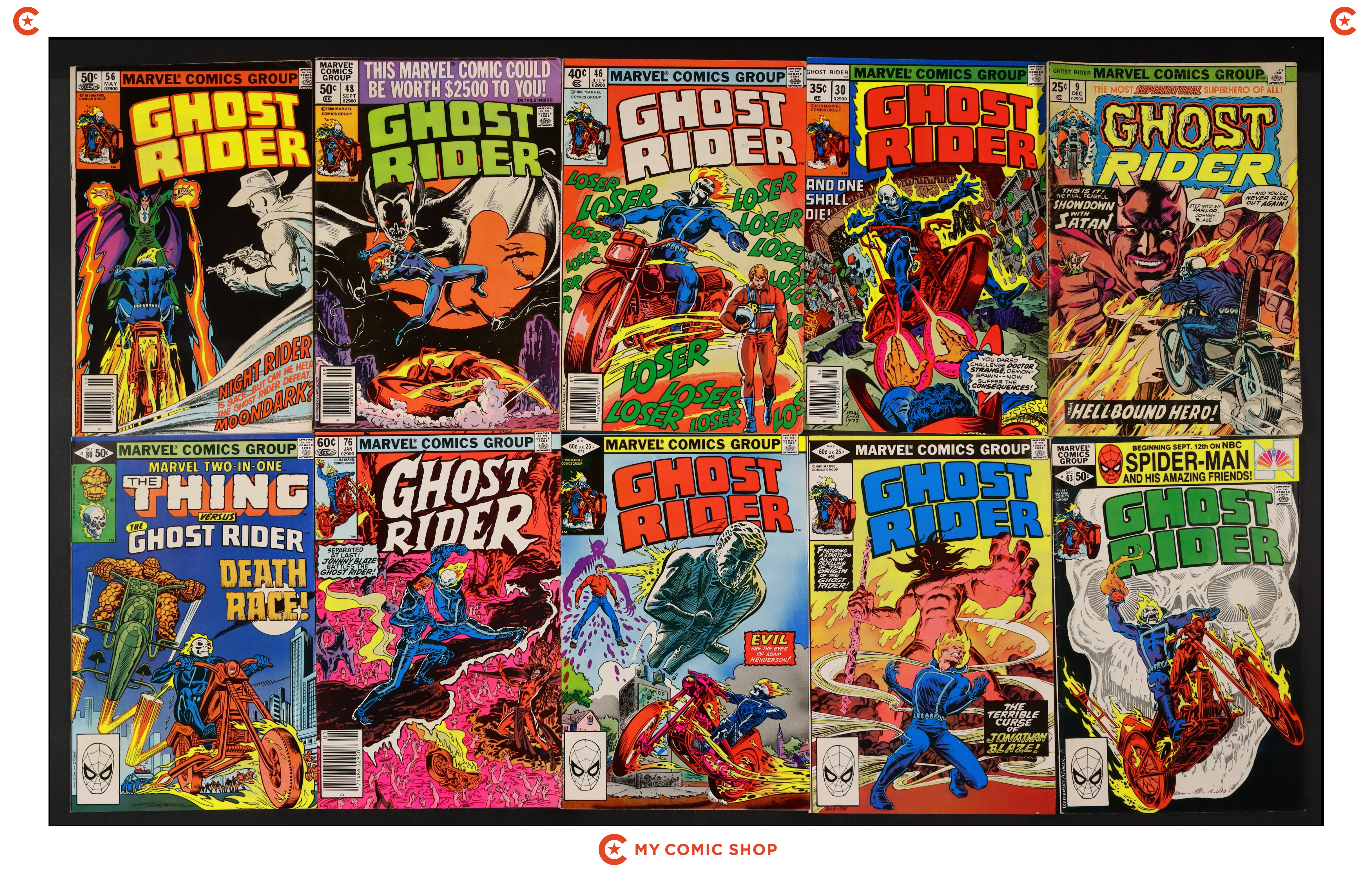 Issues 9, 30, 46N, 48, 56, 63, 68, 71, 76, and 80 of Ghost Rider (1973 1st Series). Most will grade in the FN to VG range with #9 grading GD.