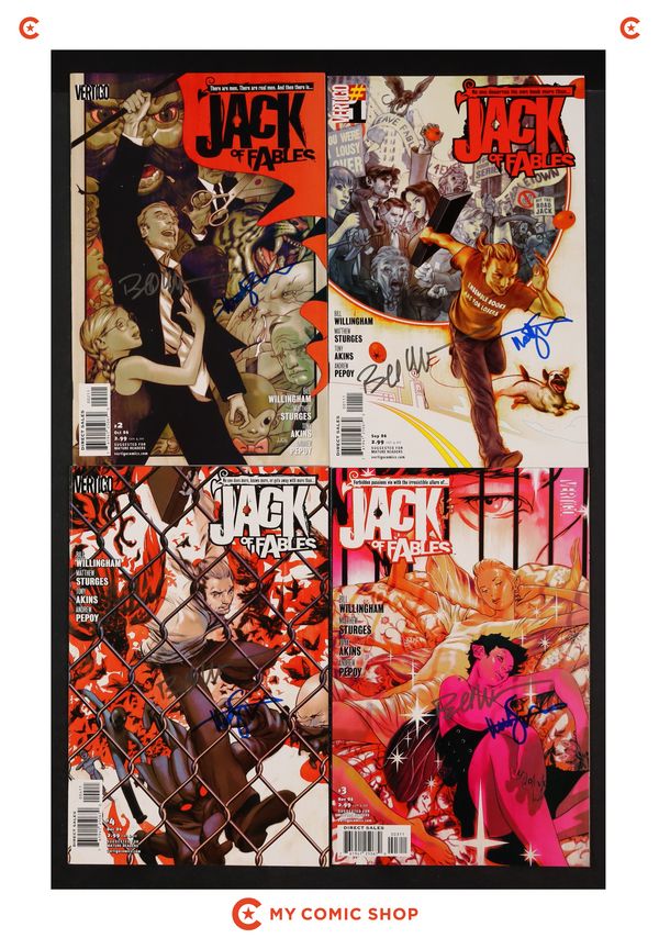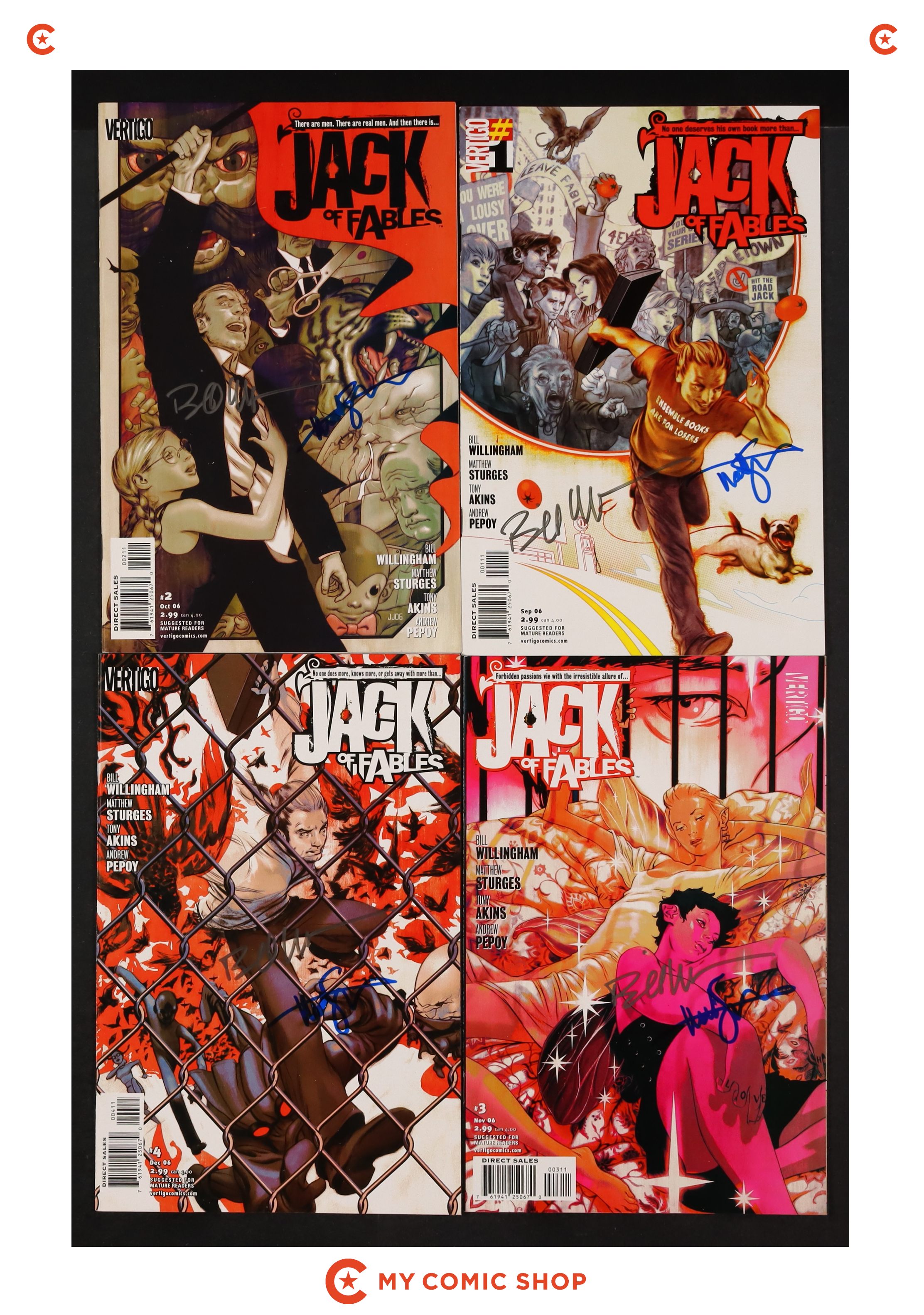 Issues 1-4 of Jack of Fables (2006) signed by Bill Willingham and Matthew Sturges. No autograph certification is included. Most will grade in the FN to VF range.