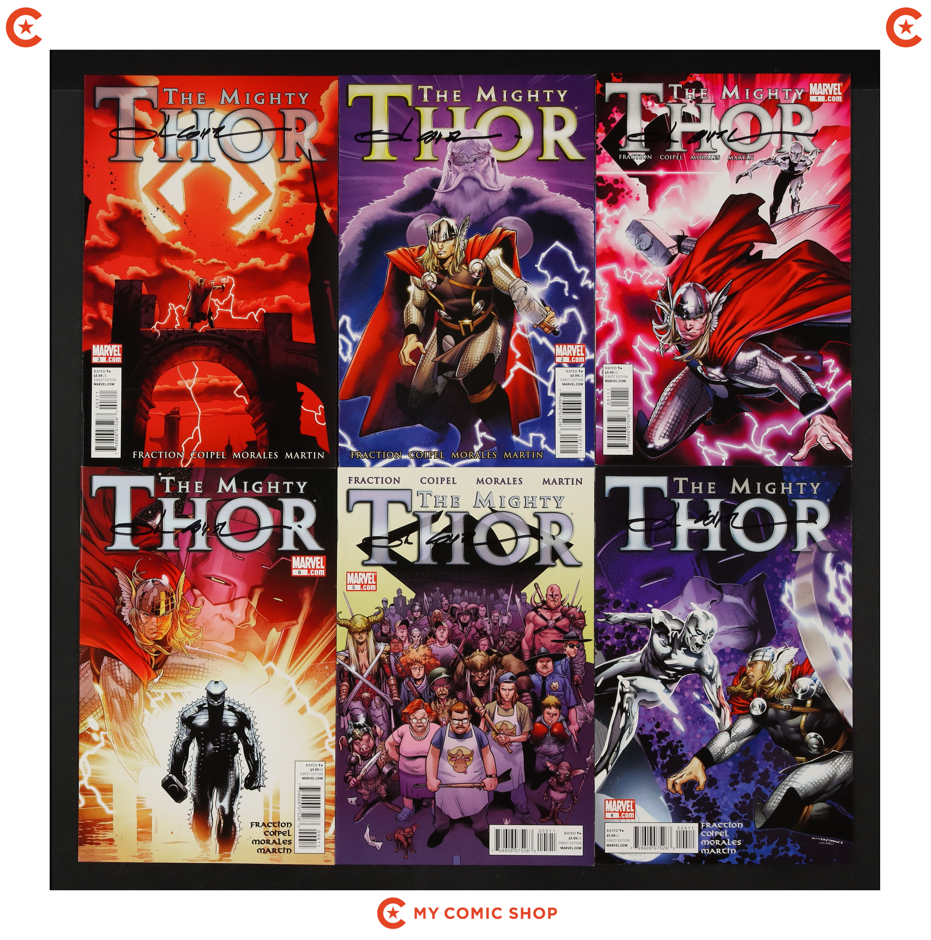 Issues 1A-6A of Mighty Thor (2011 Marvel). Most will grade in the NM/VF to VF range. All issues has the name Oliver Coipel on cover; no COA included.