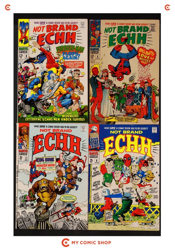 Issues 6, 8, 9, 11 of Not Brand Echh (1967). Most will grade in the FN to VF range, with #6 grading at GD-.