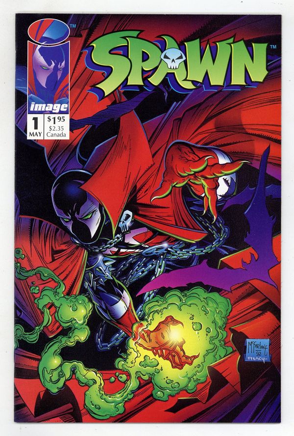 Starts Jan 26 Direct edition. "Questions!" Part 1 of 4. Created, story, and art by Todd McFarlane. When government assassin Al Simmons is murdered, a deal with the devil brings him back to the realm of the living. But now he walks the shadows as the disfigured soldier of hell known as Spawn. Armed with unimaginable, but finite, magical abilities, Spawn is destined to play an important role in the upcoming Armageddon. But, what happens when this rebellious anti-hero decides he won't fight for either side? Superstar artist and Image co-founder, Todd McFarlane, creates a character who has gone on to inspire a major motion picture, an HBO animated series, numerous spin-off comic series, and one of the most successful toylines of all time. Spawn centerfold by Todd McFarlane & Ken Steacy. Pin-up of Spawn by George Perez. Pin-up of PITT by Dale Keown. Cover by McFarlane & Steacy. 1st app of Sam and Twitch Cover price $1.95.
