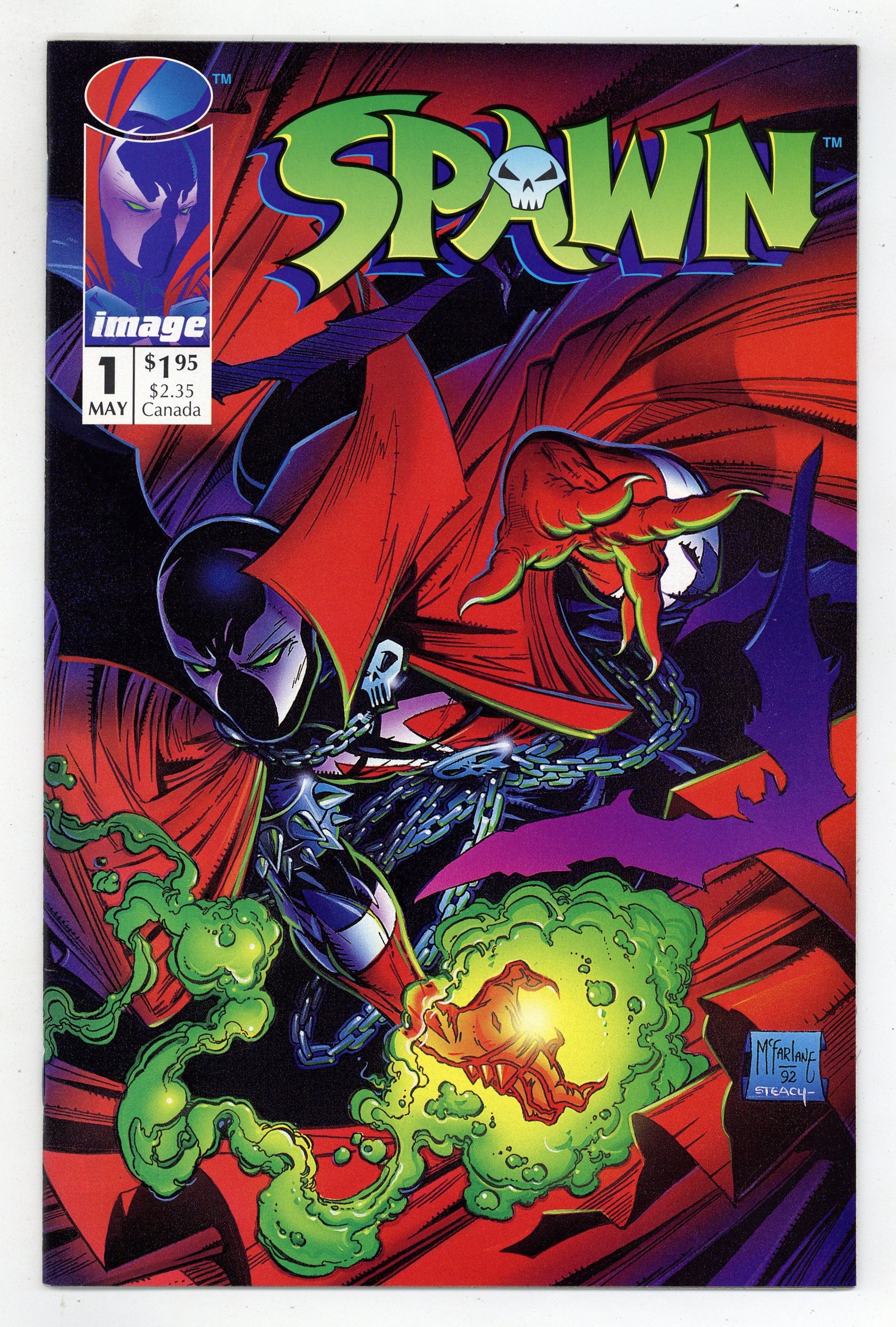Starts Jan 3 Direct edition. "Questions!" Part 1 of 4. Created, story, and art by Todd McFarlane. When government assassin Al Simmons is murdered, a deal with the devil brings him back to the realm of the living. But now he walks the shadows as the disfigured soldier of hell known as Spawn. Armed with unimaginable, but finite, magical abilities, Spawn is destined to play an important role in the upcoming Armageddon. But, what happens when this rebellious anti-hero decides he won't fight for either side? Superstar artist and Image co-founder, Todd McFarlane, creates a character who has gone on to inspire a major motion picture, an HBO animated series, numerous spin-off comic series, and one of the most successful toylines of all time. Spawn centerfold by Todd McFarlane & Ken Steacy. Pin-up of Spawn by George Perez. Pin-up of PITT by Dale Keown. Cover by McFarlane & Steacy. 1st app of Sam and Twitch Cover price $1.95.