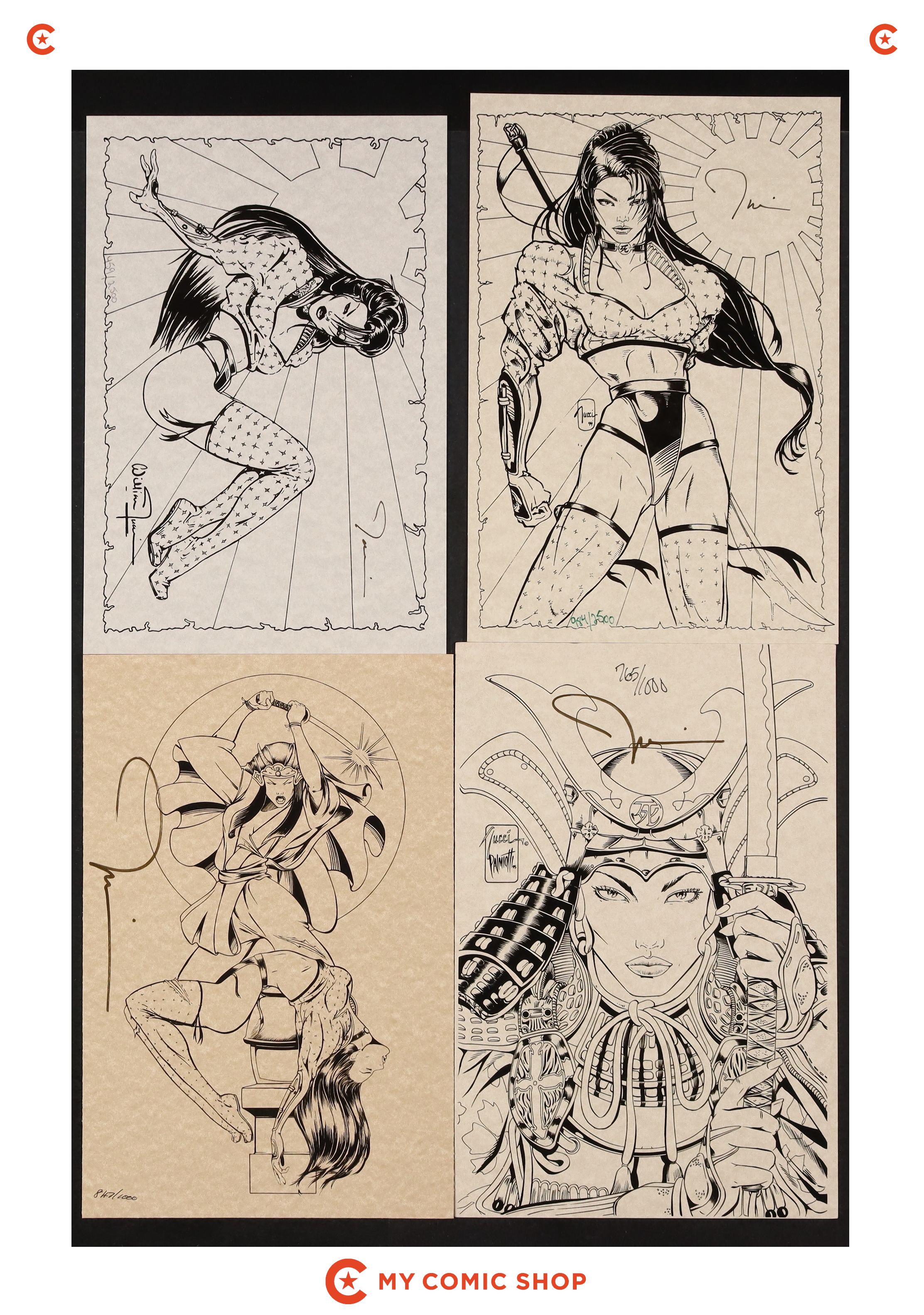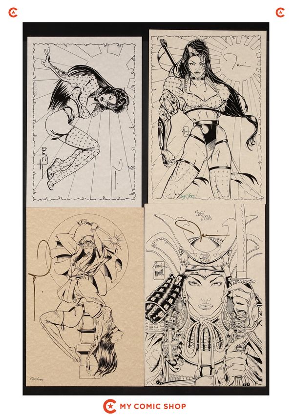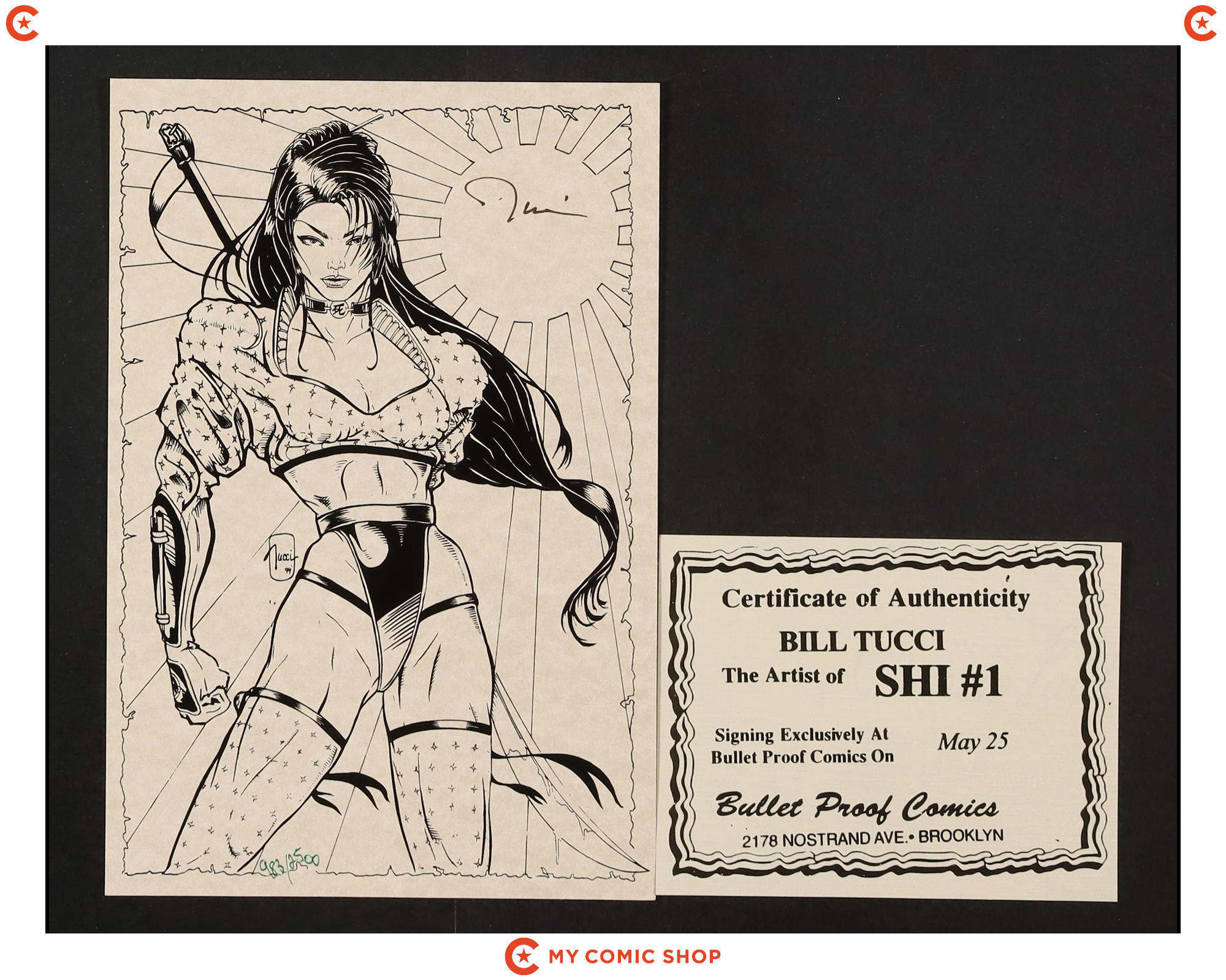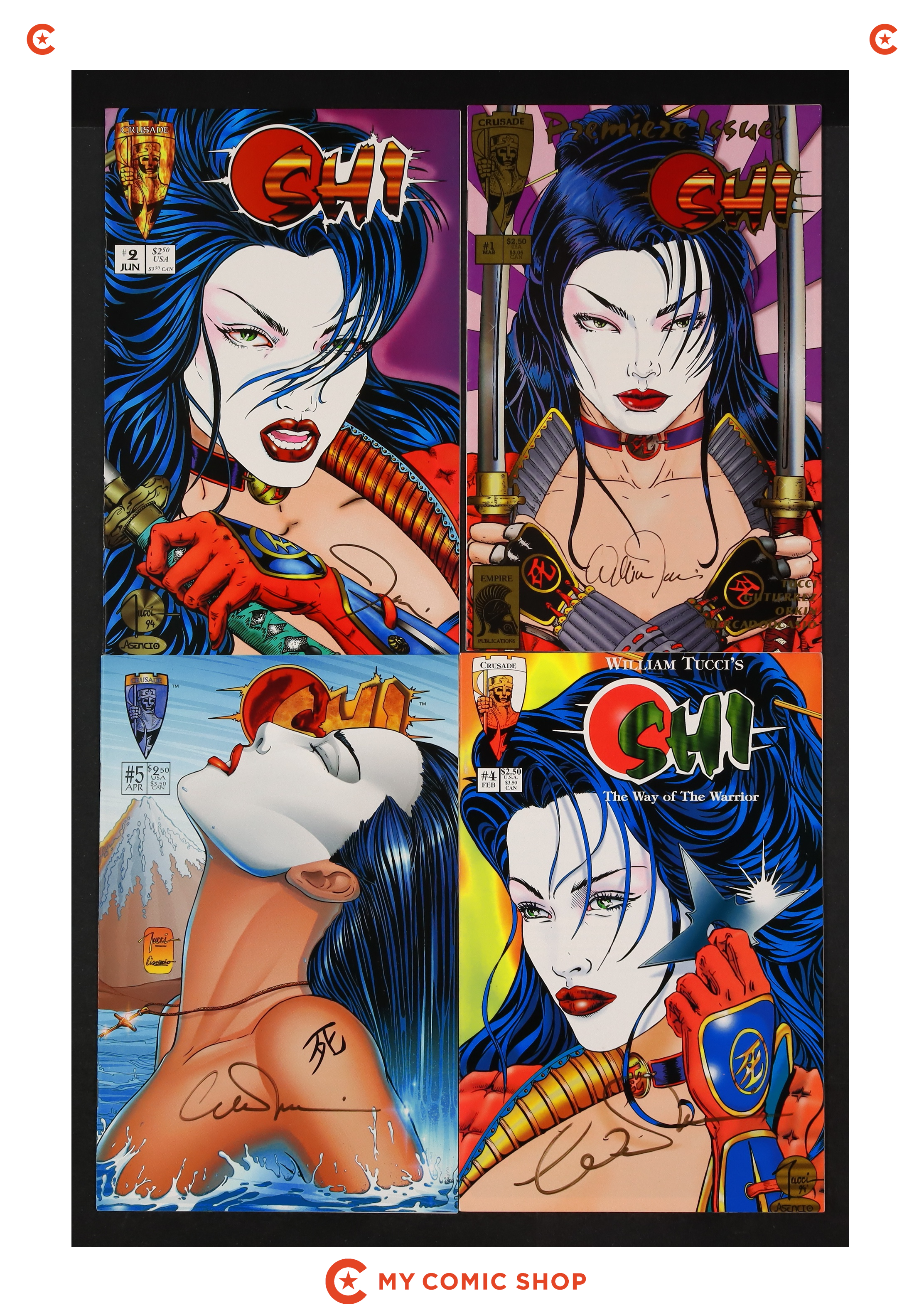 Issues 1, 2, 4, 5A of Shi The Way of the Warrior (1994 Crusade) signed by Bill Tucci. Includes high quality prints on heavy stock numbered and signed by Tucci, and autograph certification from Bullet Proof Comics. Most will grade in the FN to VF range.