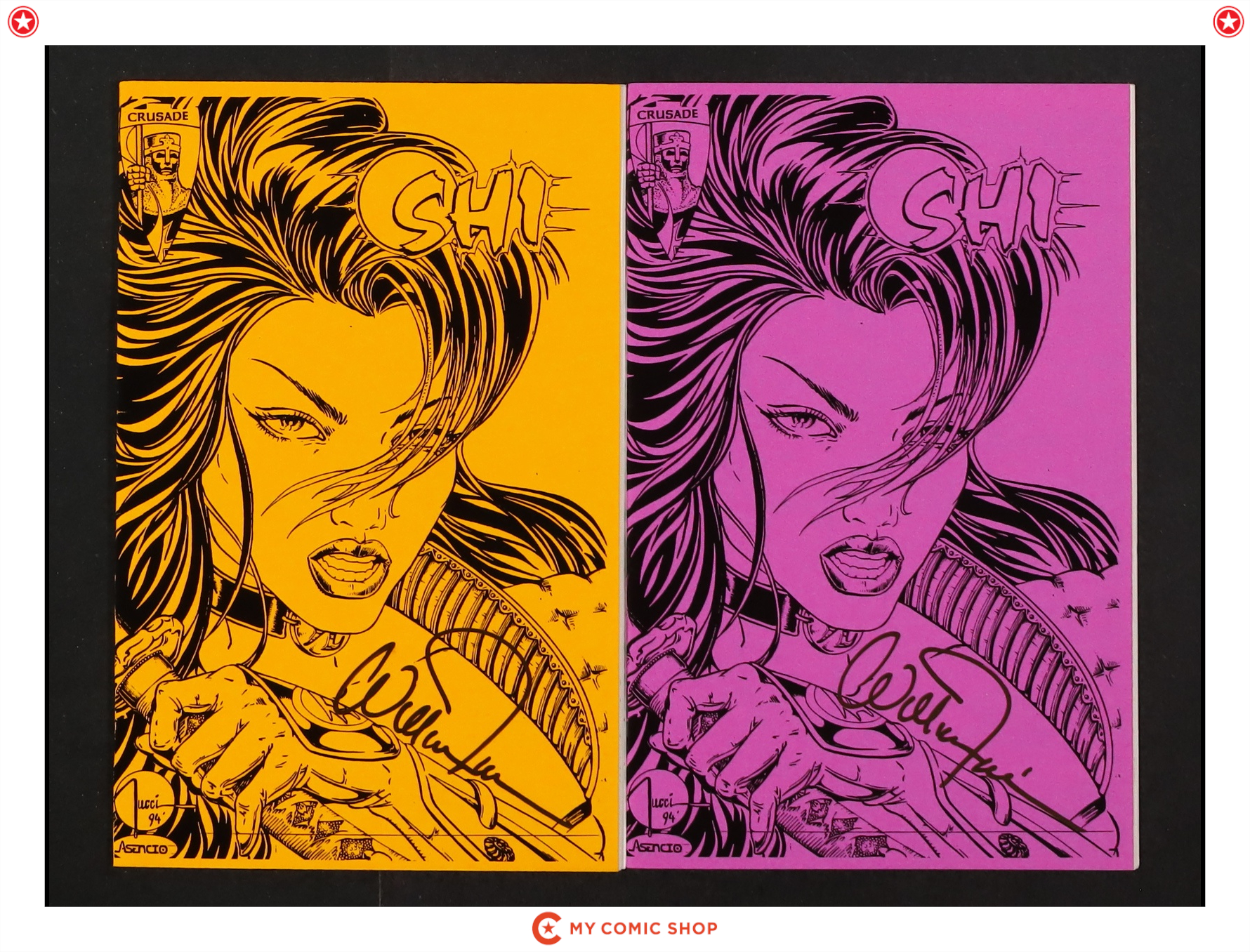 Issues 2PURPLE, and 2ORAGNE of Shi The Way of the Warrior (1994 Crusade) signed by William Tucci. No autograph certification is included. Most will grade in the VF to NM range.