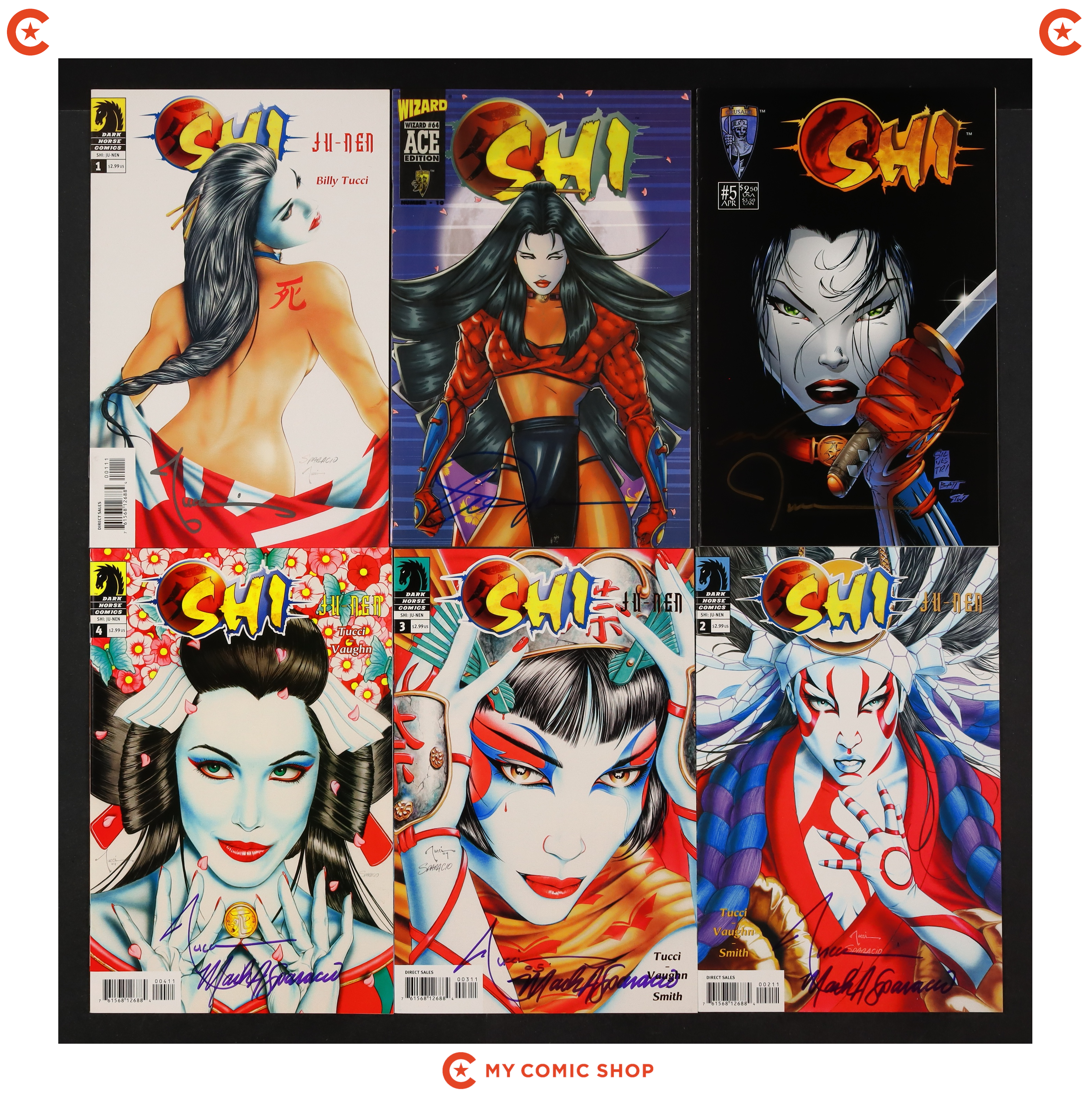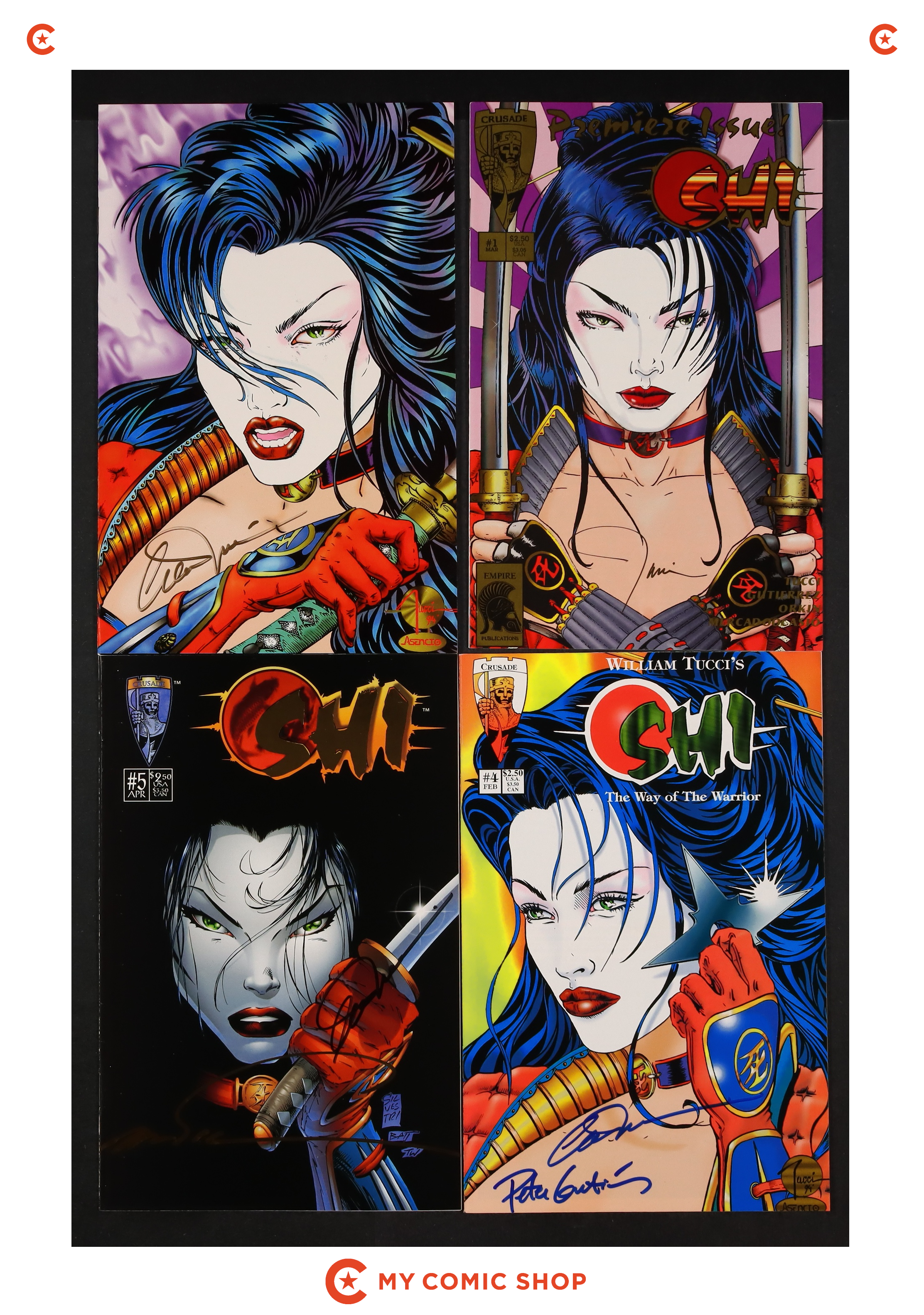 Issues 1, 2COMM, 4, 5B.GOLD of Shi The Way of the Warrior (1994 Crusade). Issues 1, 2COMM signed by Bill Tucci, Issue 4 signed by Peter Gutierrez and Tucci, Issue 5B.GOLD signed by Marc Silvestri and Tucci. Issue #1 includes autograph certification from Bullet Proof Comics and a high quality print on heavy stock numbered and signed by Tucci, no autograph certification is included for other issues. Most will grade in the FN to VF range.
