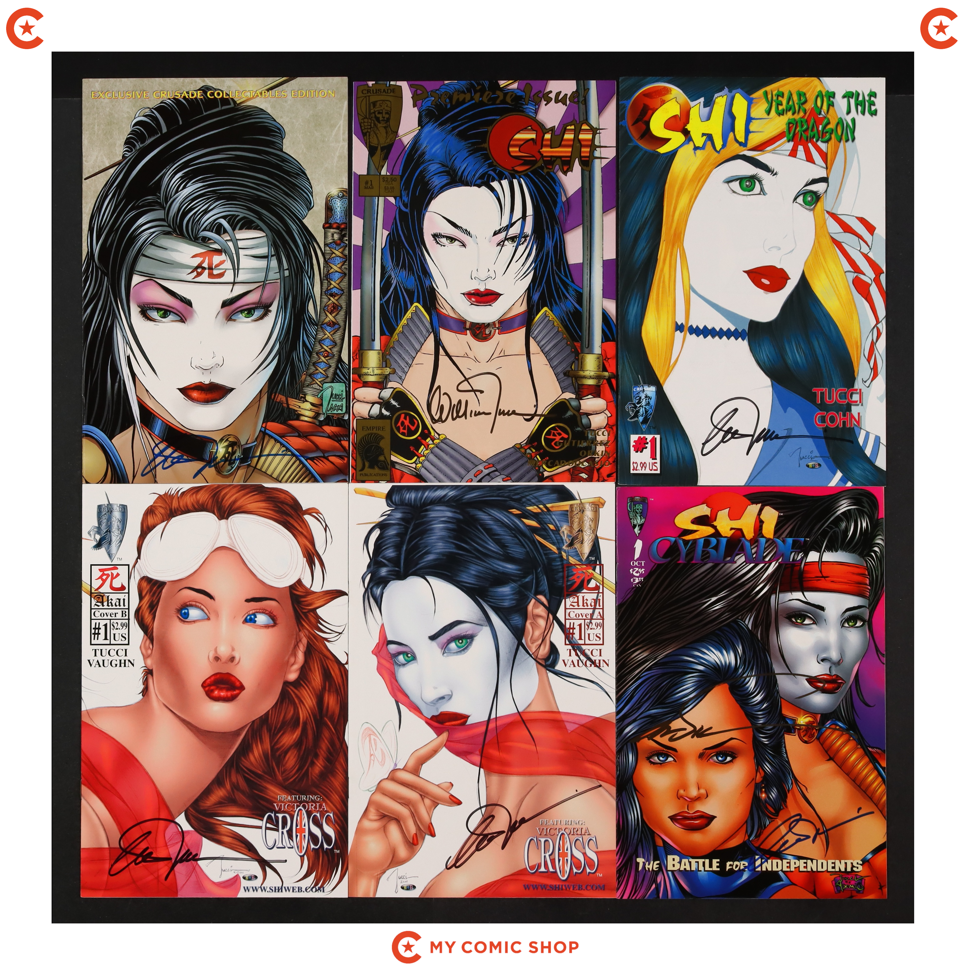 Issue 5B of Shi The Way of the Warrior (1994 Crusade) signed by Mark Silvestri and William Tucci. Issue 10 of Shi Wizard Ace Edition (1996) signed by Tucci. Issues 1A, 2A, 3, 4A of Shi Ju Nen (2004), issues 2A, 3, 4A signed by Marc Sparacio and Tucci, issue 1A signed by Tucci. Issue 1A of Shi The Year of the Dragon (2000) signed by Tucci. Issue 1 of Shi The Way of the Warrior (1994 Crusade) signed by Tucci. Issue 12B of Shi The Way of the Warrior (1994 Crusade) signed by Tucci. Issue 1A of Shi Cyblade The Battle for Independents (1995) signed by Marc Silvestri and Tucci. Issues 1A, 1B of Shi Akai (2001) signed by Tucci. No autograph certification is included. Most will grade in the VF to NM range.