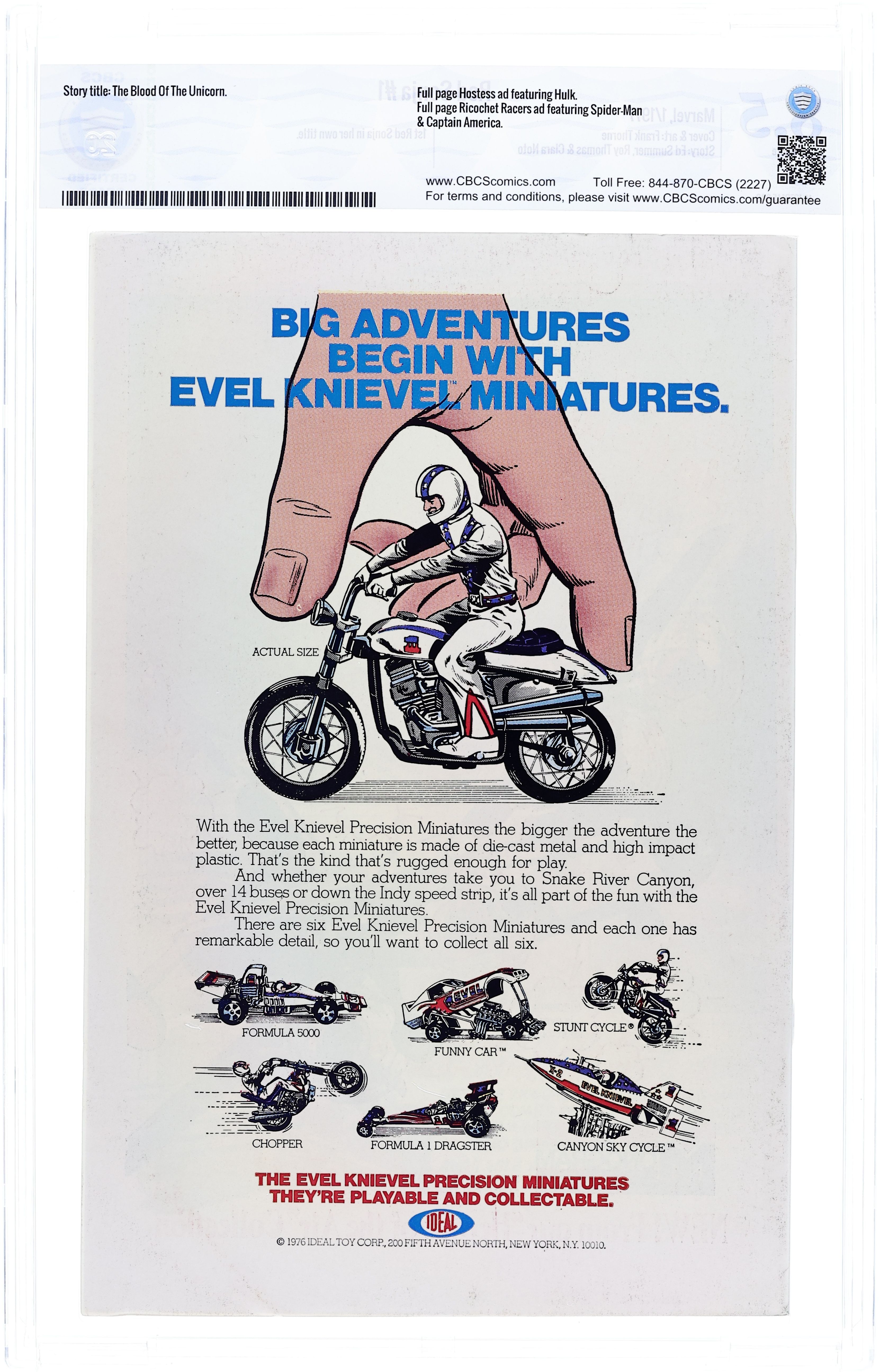Starts May 18 Cover by Frank Thorne. The Blood of the Unicorn, script by Ed Summer, Roy Thomas, and Clara Noto, art by Frank Thorne; While wandering the forests of Argos, Red Sonja witnesses a warlord named Andar of Bezfarda attacking a unicorn; He cuts off the unicorn's horn in the hopes of obtaining its mystical properties; Red Sonja leaps down and liberates the unicorn from its attackers; She rides off with it, and both rider and mount develop a close bond. The Hulk stars in a one-page Hostess ad, "The Green Thumb." 36 pgs., full color. $0.30. Cover price $0.30.